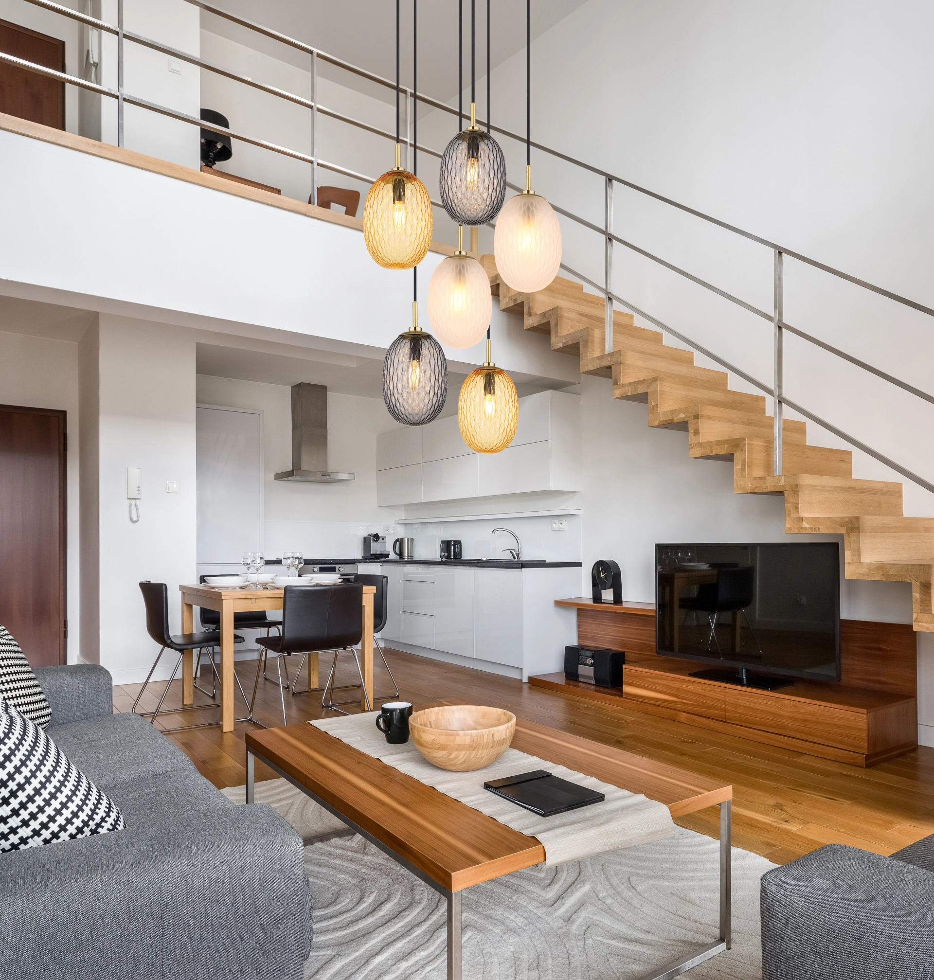 La suspension DEVIN en métal doré a une forme ronde et six suspensions élégantes. Chaque suspension est équipée de lentilles bulbeuses qui portent une subtile décoration gaufrée. Le corps en métal doré mat contraste élégamment avec les abat-jour en verre, dont deux sont disponibles en finition fumée, ambrée et satinée. Cette suspension est parfaite pour les pièces qui ont besoin d'une combinaison harmonieuse de design moderne et de lumière chaude. L'utilisation d'ampoules E14 permet un éclairage personnalisable qui peut être atténué en fonction de l'ambiance souhaitée. DEVIN n'est pas seulement fonctionnel, mais aussi un accroche-regard dans n'importe quelle pièce, qui impressionne par son design élégant et sa finition de haute qualité.