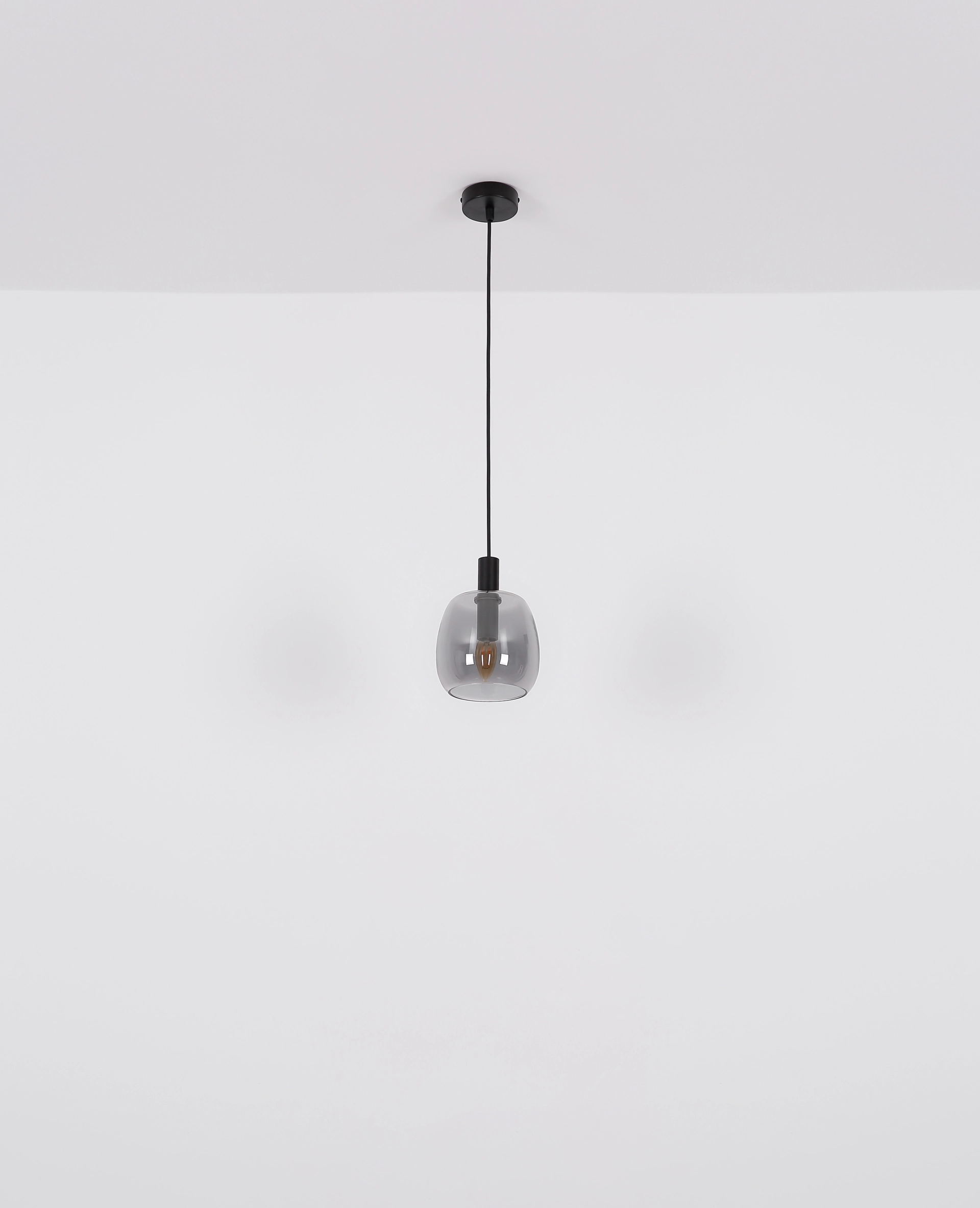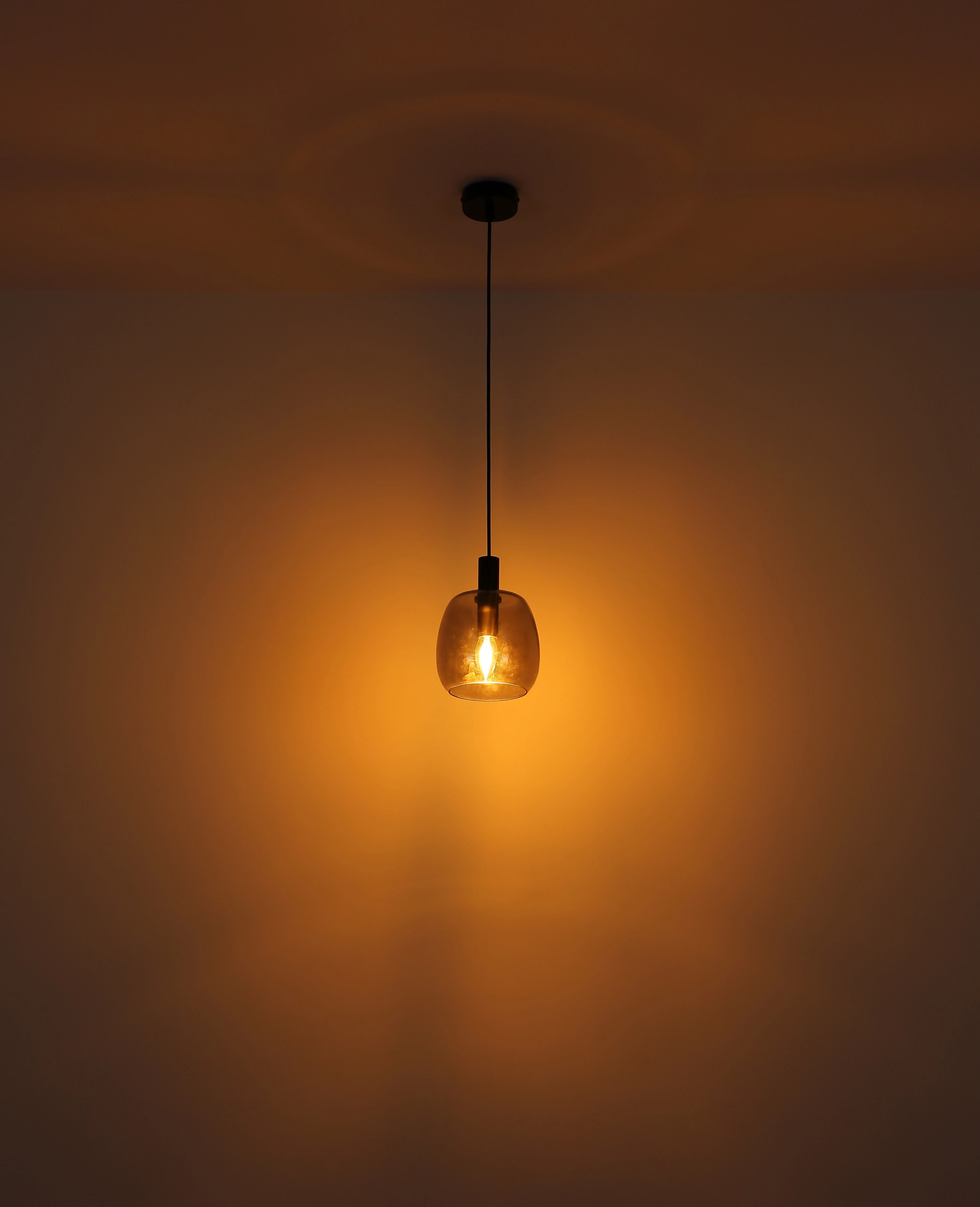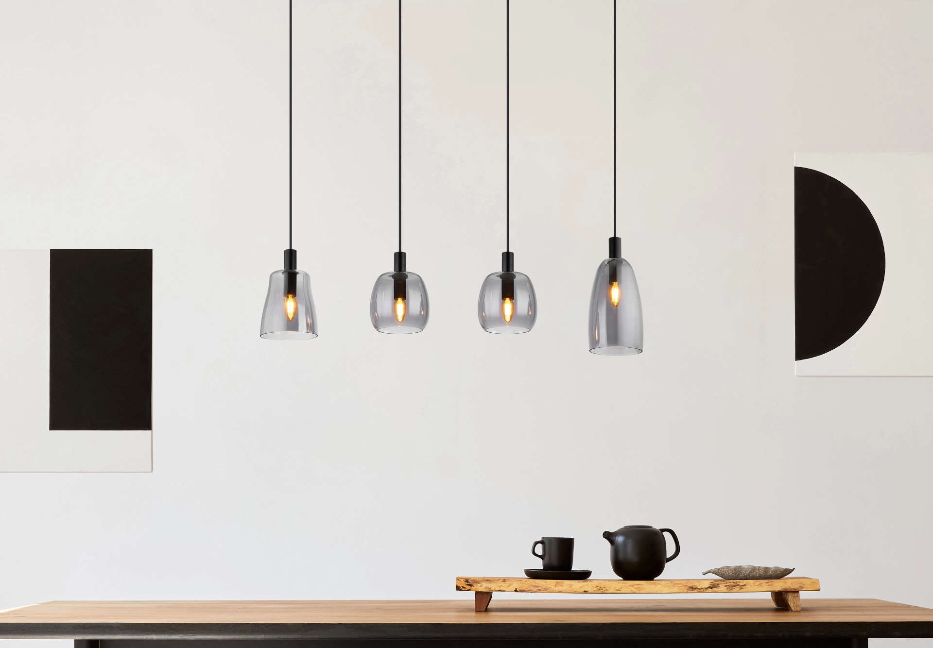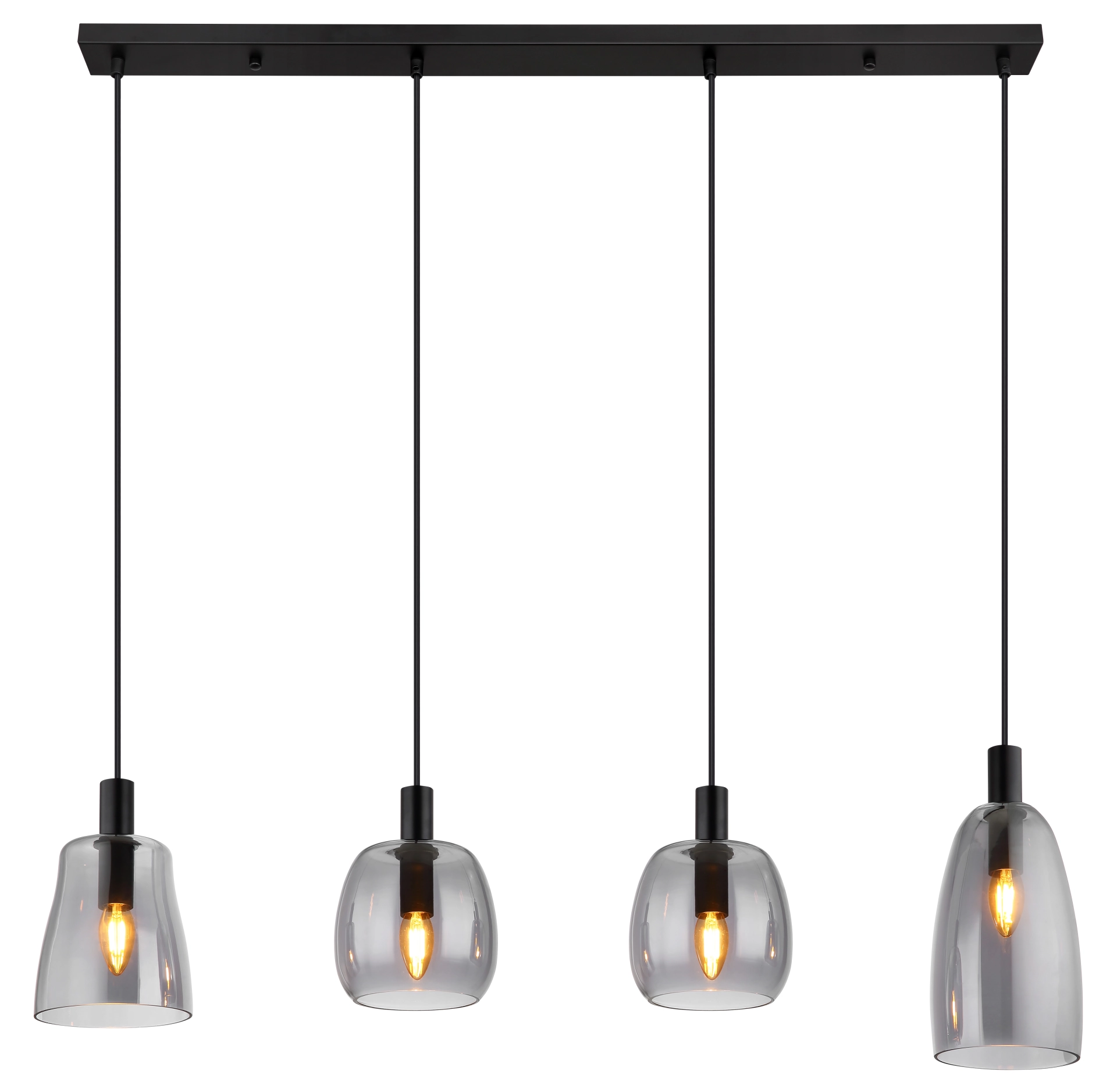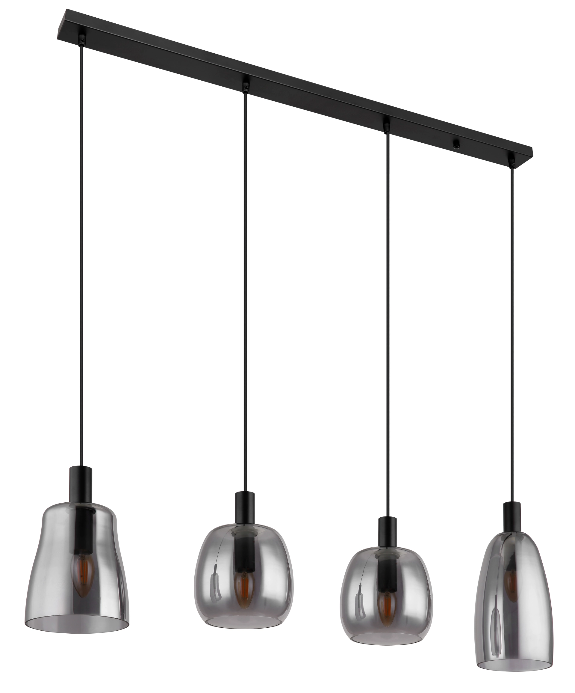 Cette élégante suspension inspire avec un beau design. Sur un montage au plafond de 107 cm de long, quatre câbles noirs de 1,2 m de long sont installés chacun sur une prise E14, qui sont équipés de nuances de verre de couleur fumée de différentes formes et décorations en noir. Les prises E14 vous permettent de déterminer votre propre couleur de lumière et luminosité jusqu’à une puissance maximale de 40 watts. En raison de la longévité et des économies d’énergie, nous recommandons les ampoules LED.