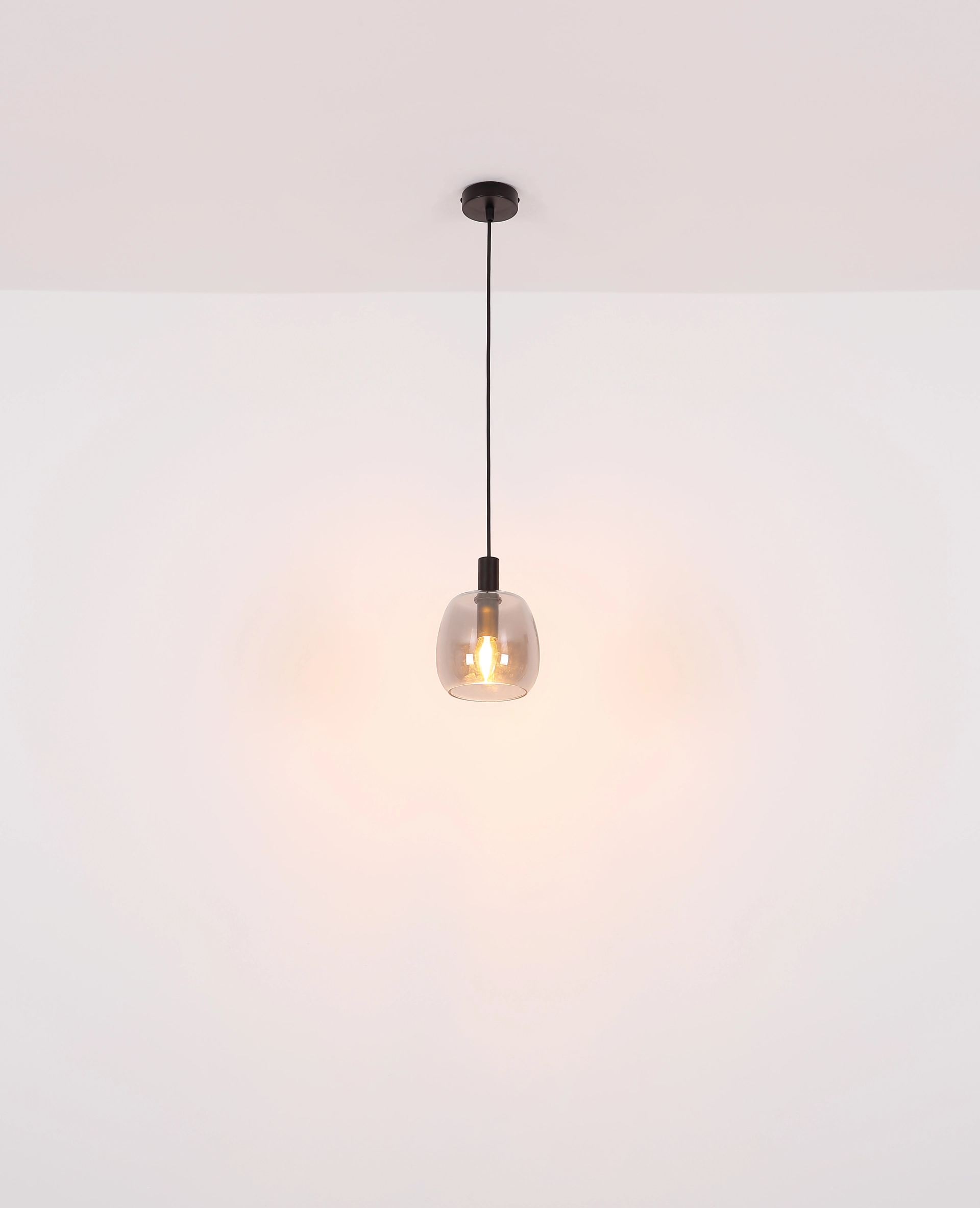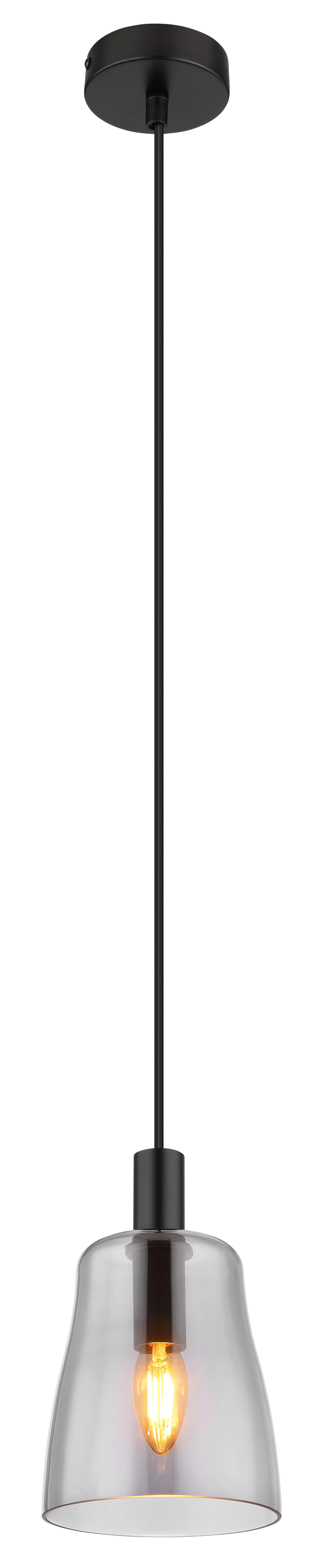 Cette élégante suspension inspire avec un beau design. D’un montage rond au plafond, un câble noir de 1,2 m de long dépasse d’une prise E14, équipée d’un abat-jour en verre de couleur fumée (Ø 14,5 cm) et de décorations en noir. La prise E14 vous permet de déterminer votre propre couleur de lumière et luminosité jusqu’à une puissance maximale de 40 watts. En raison de la longévité et des économies d’énergie, nous recommandons les ampoules LED.