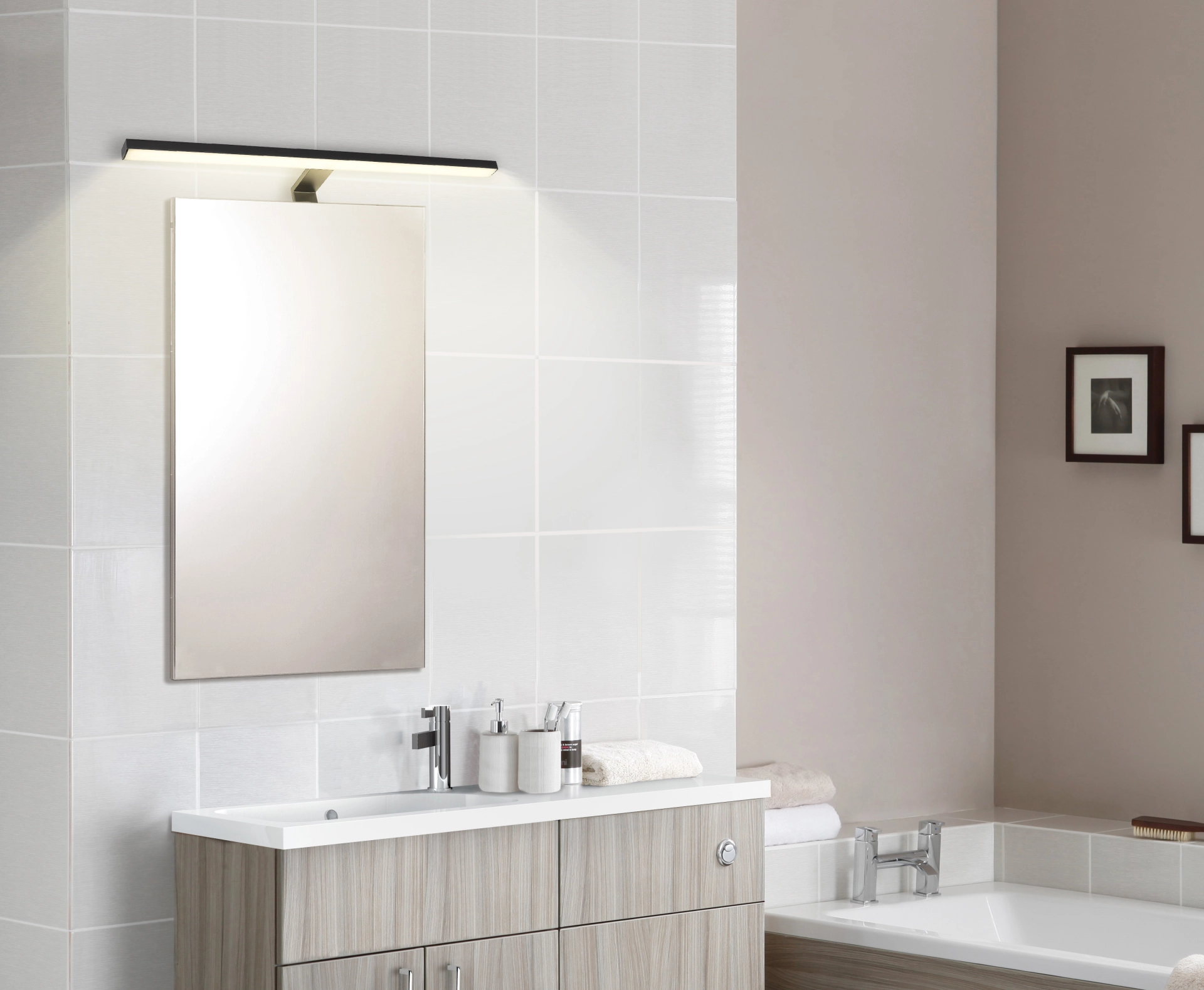Cette applique murale moderne est idéale pour n’importe laquelle de vos pièces. D’un accessoire en métal noir pour le mur dépasse avec un porte-à-faux de 12 cm un panneau LED de 60 cm de long, qui émet une lumière neutre de 4000 Kelvin. Le degré de protection IP44 est utilisé pour protéger contre les éclaboussures d’eau.
