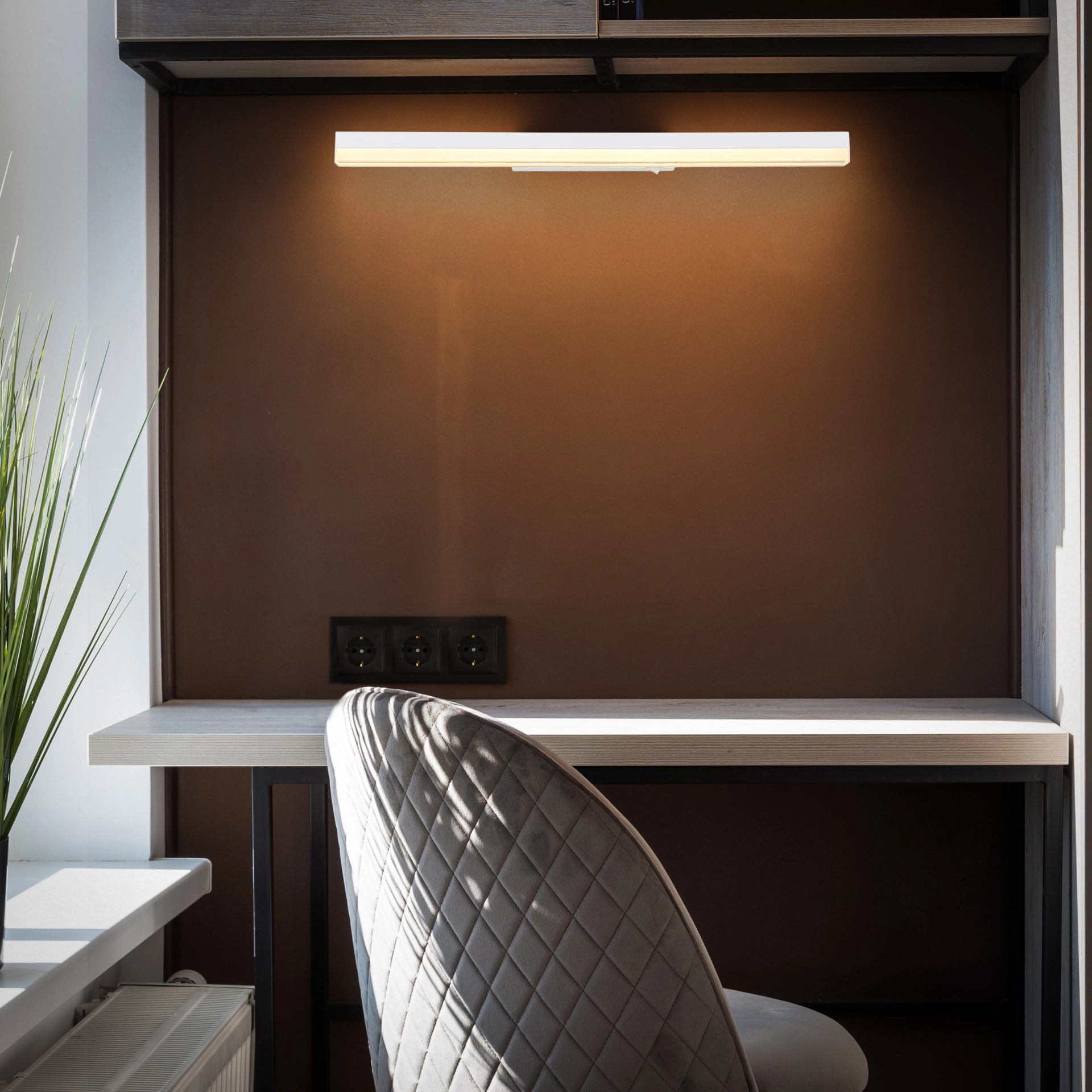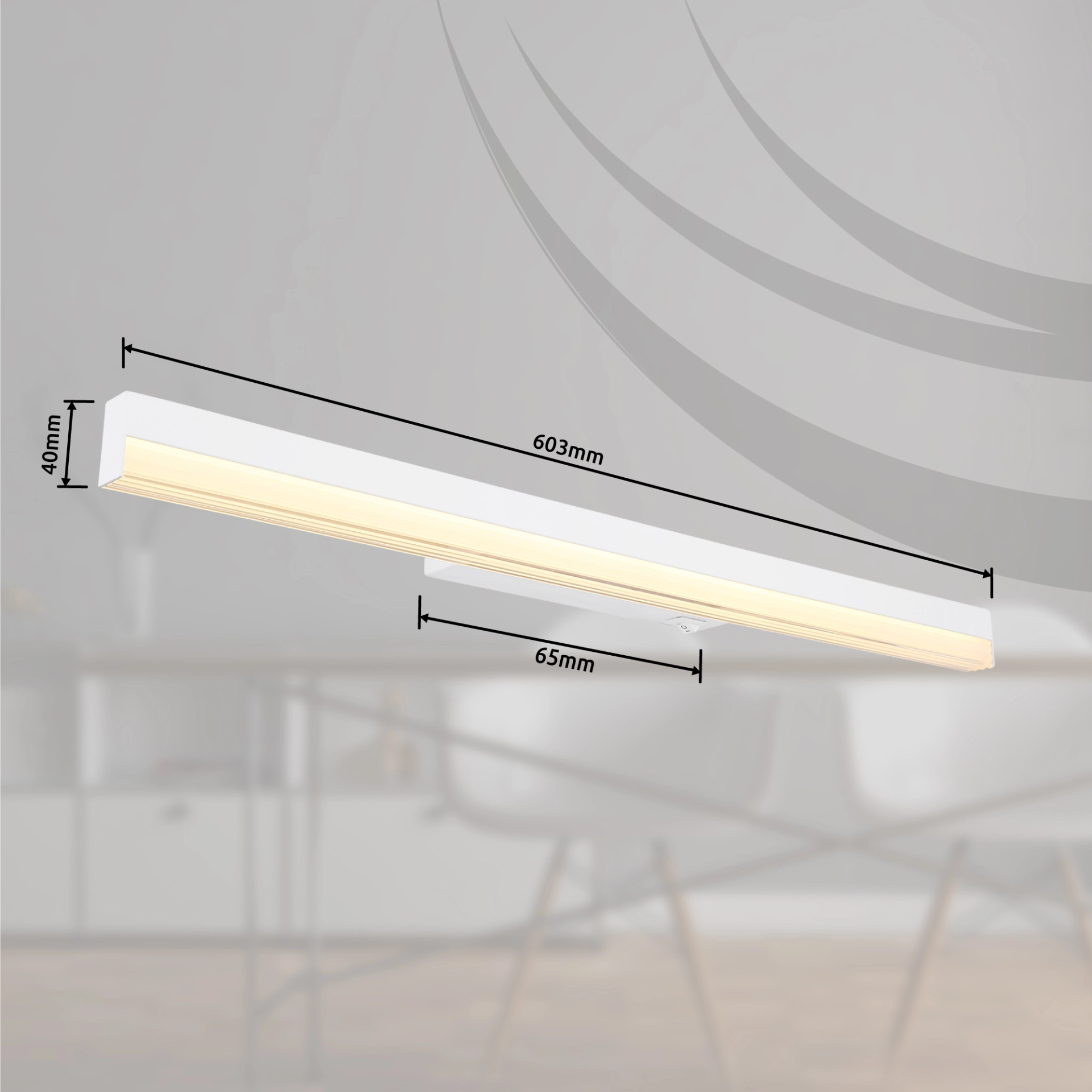 L’applique murale est faite de métal blanc mat et d’aluminium mat blanc ainsi que d’acrylique opale, qui est disposée dans un diamètre de 600 mm x 40 mm x 60 mm (longueur x largeur x hauteur). Le luminaire est alimenté par une ampoule LED d’une puissance de 12 W et d’une tension de 230 V. La source lumineuse a une luminosité de 1400 lm et une puissance de sortie de 700 lm à une température de couleur de 3000/6000K. Cette applique murale attire vraiment le regard et est idéale pour les espaces de vie modernes. La combinaison de métal blanc mat, d’aluminium mat blanc et d’acrylique opale donne à la lampe un aspect élégant. Avec la lampe LED, vous économisez de l’énergie et protégez l’environnement. L’applique murale est équipée d’un interrupteur à bascule sur l’article et d’un interrupteur de robinetterie pour régler la luminosité individuellement. Les couleurs sont réparables et peuvent être commutées entre 3000K ou 6000K. Le luminaire a une taille de 600 mm x 40 mm x 60 mm (longueur x largeur x hauteur) et une hauteur de suspension de 60 mm.