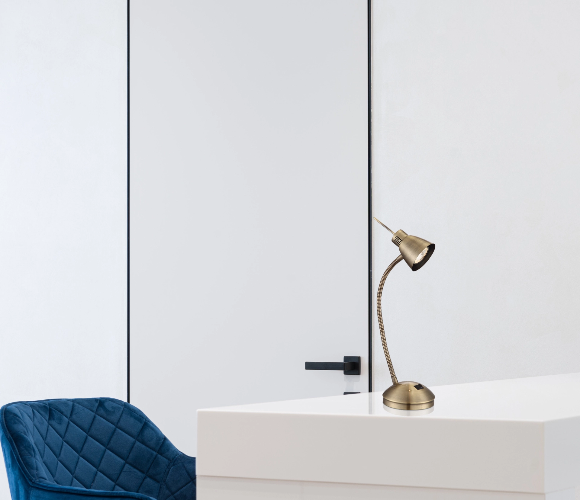 Le projecteur de table traditionnel de 44 cm Nuova se distingue par son design intemporel et classique. Le bras flexo donne à cette vieille lampe de table en laiton la flexibilité nécessaire. L’ampoule fournit une lumière forte de 165 lumens avec une agréable couleur de lumière blanche chaude de 3000K. Dans la même série de modèles, cette lampe de table est également disponible dans d’autres couleurs.