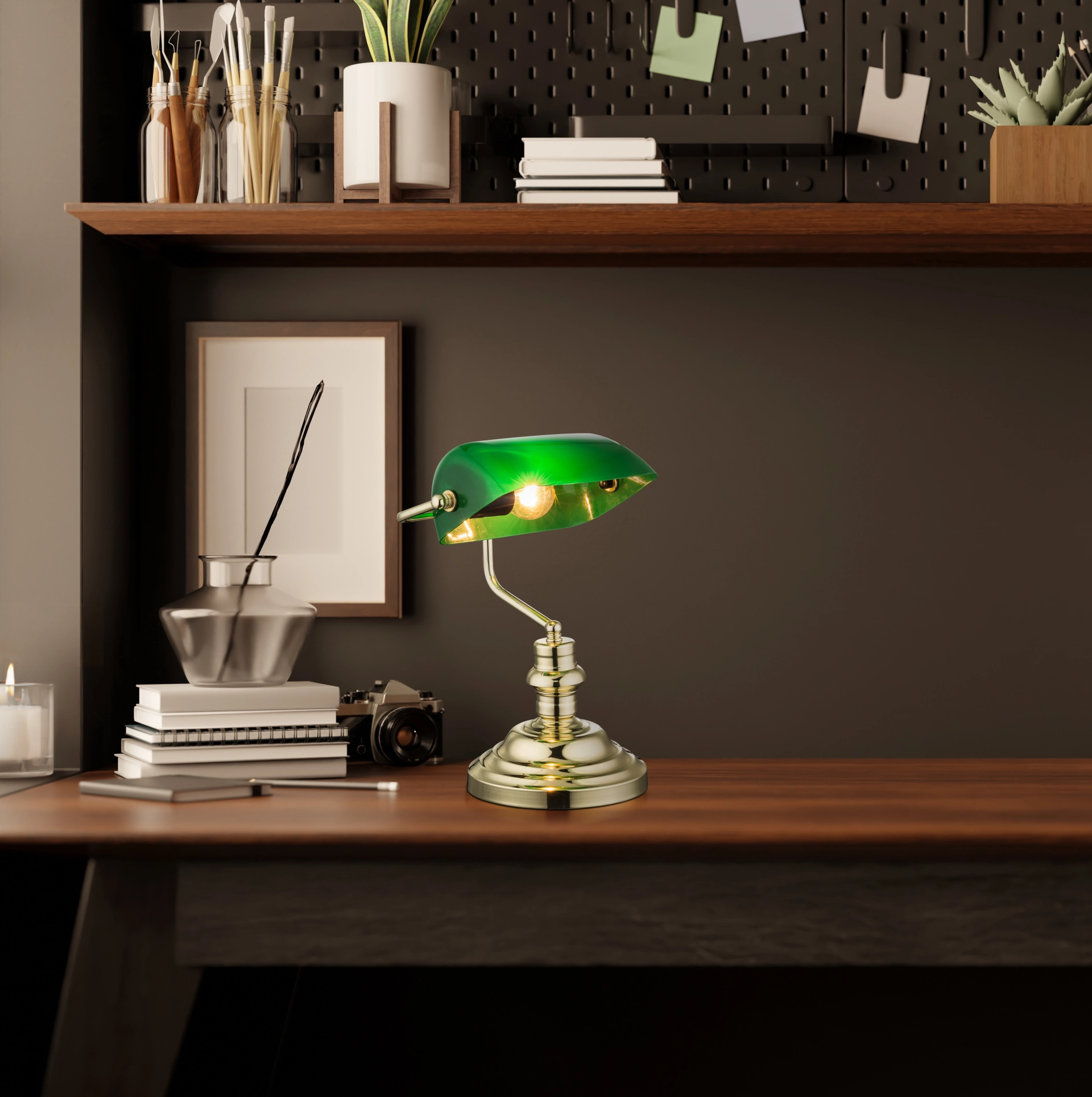 La lampe de table antique traditionnelle de 36 cm apparaît dans des couleurs classiques. Le corps de la lampe de couleur laiton avec le verre acrylique vert fait appel au goût spécial. En plus du câble de connexion de 1,50 mètre de long, cette lampe de table dispose d’une prise E27 qui vous permet de déterminer vous-même l’intensité lumineuse et la couleur de la lumière en choisissant librement la source lumineuse (max. 60W). Dans la même série de modèles, cette lampe de table est également disponible dans d’autres couleurs.