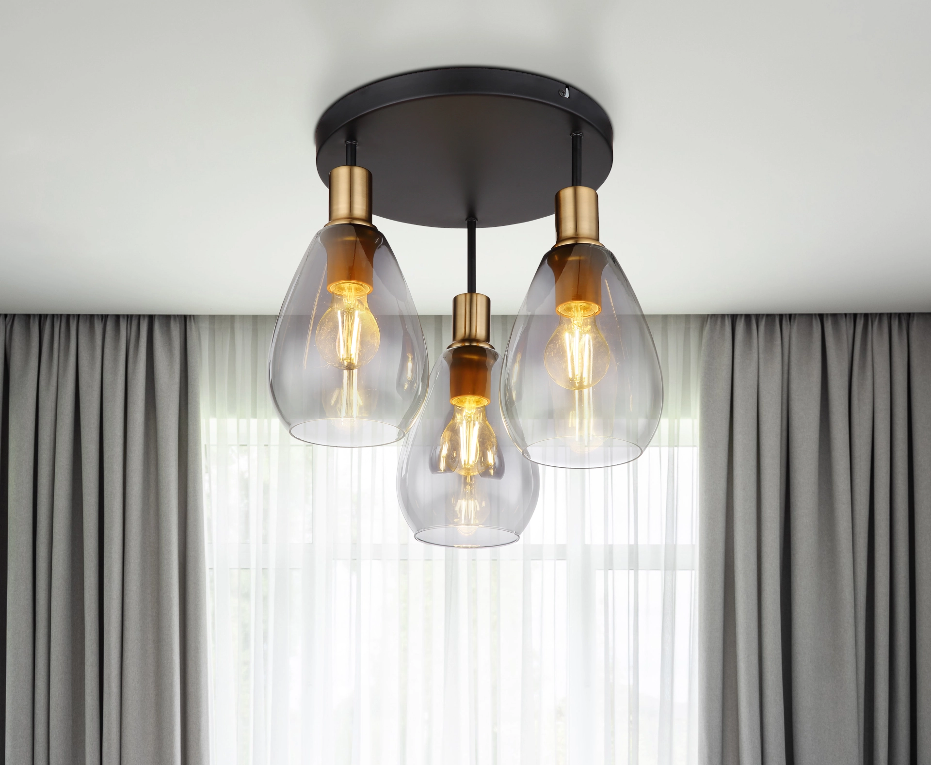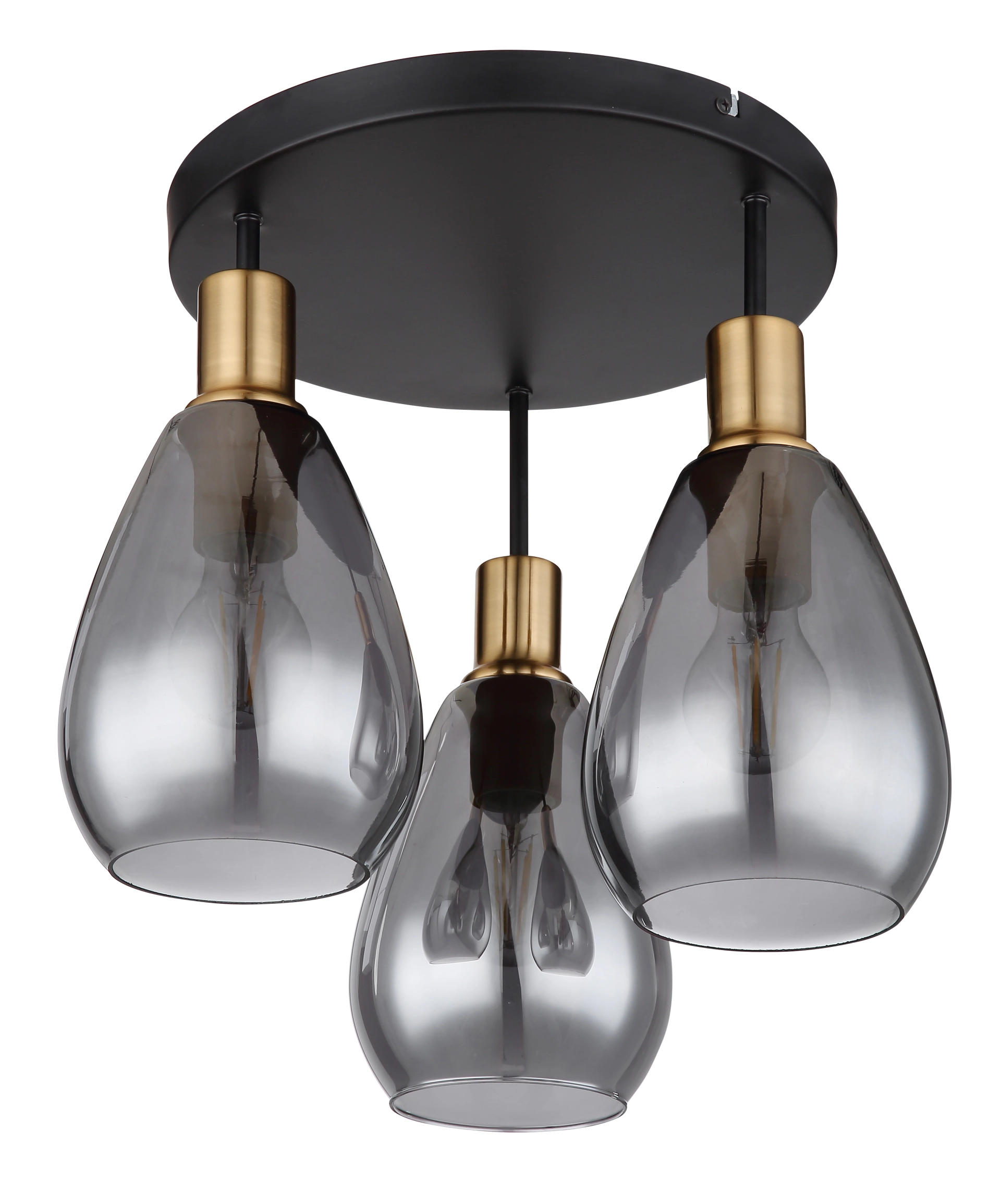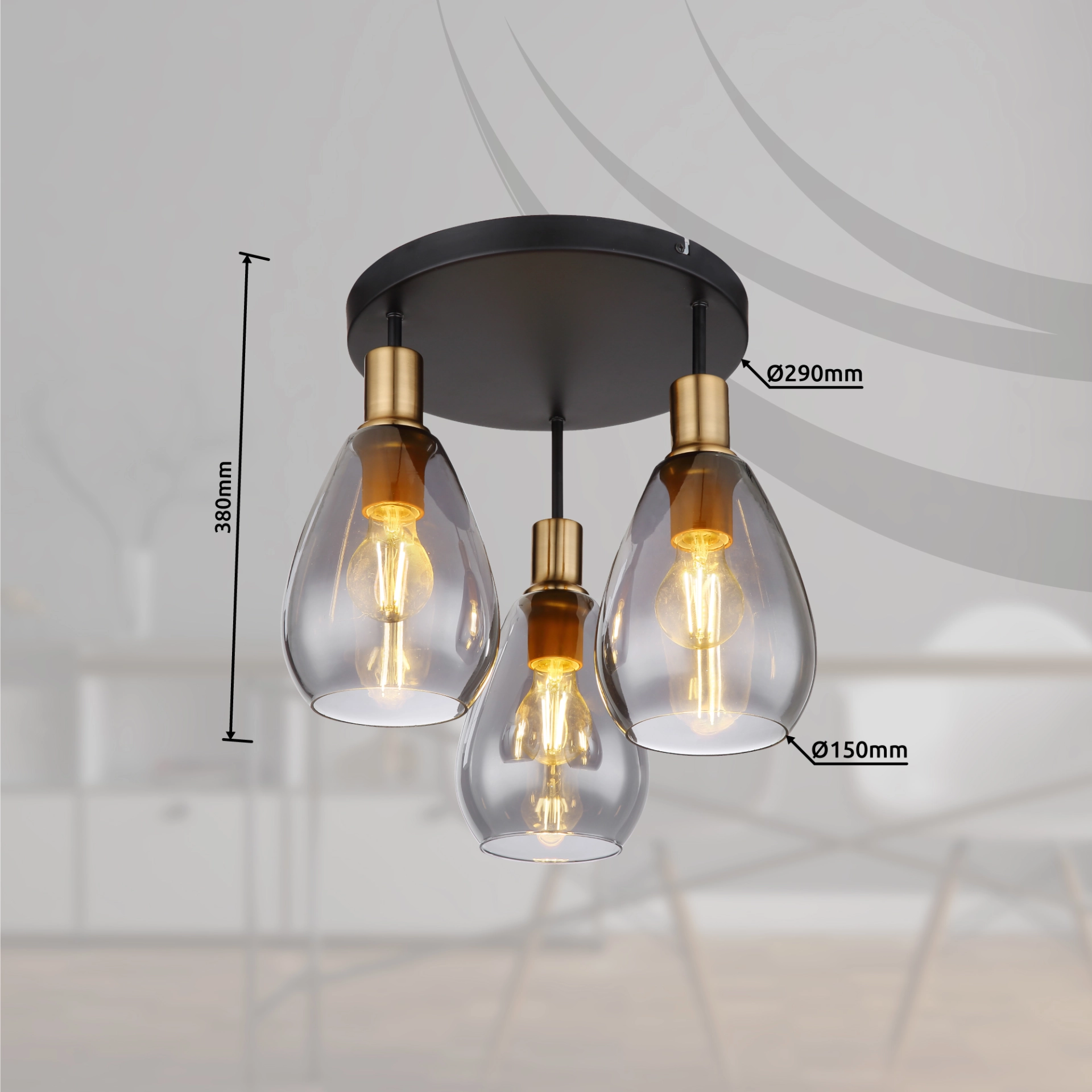 Ce magnifique plafonnier de la série Fanni allie design simple et moderne. D’une base noire mate (Ø38cm) dépassent trois douilles E27, chacune équipée d’une belle teinte ovale (Ø15cm) dans des couleurs fumée avec des décorations en laiton. Les prises E27 vous donnent la possibilité de décider de la couleur de la lumière et de la luminosité jusqu’à une puissance maximale de 40 watts. Avec d’autres modèles de cette série, vous pouvez parfaitement compléter votre espace de vie.