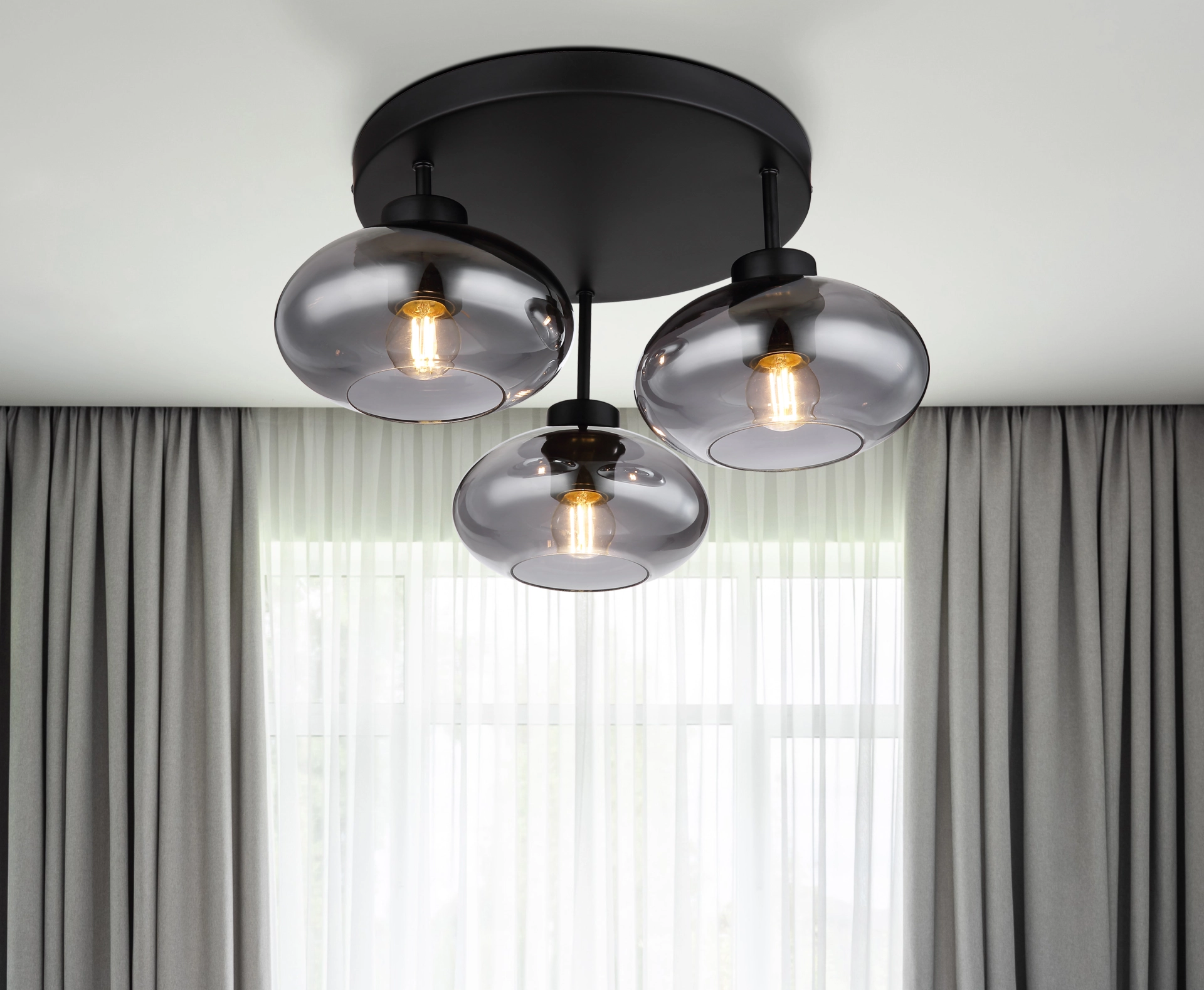 Ce plafonnier rond de la série SHAUN convainc par son design élégant. Trois tiges métalliques noires mates dépassent d’un plafond rond et chaque extrémité d’une douille E27, qui sont équipées de nuances de verre profilées dans des couleurs de fumée. Les prises E27 vous permettent de choisir librement, jusqu’à une puissance maximale de 40 watts, pour déterminer votre propre couleur de lumière et luminosité.