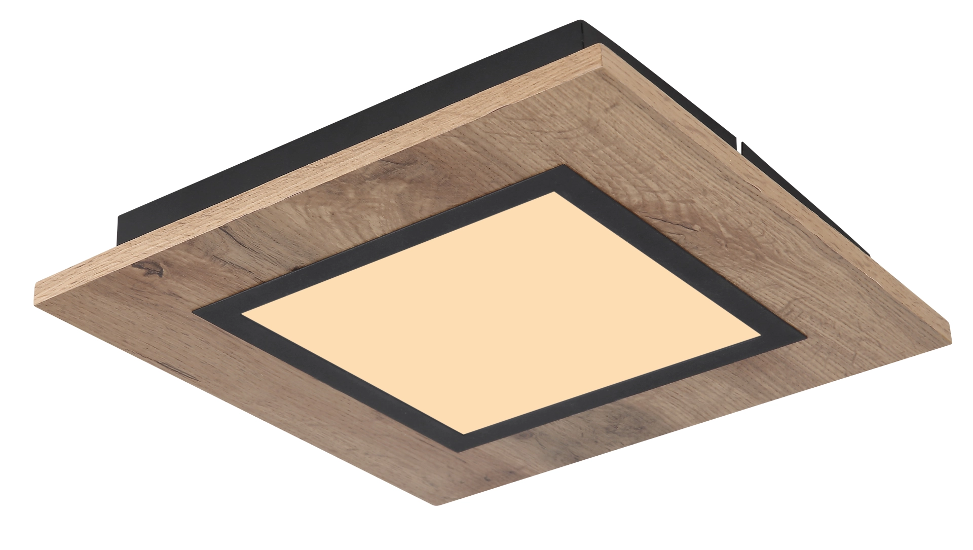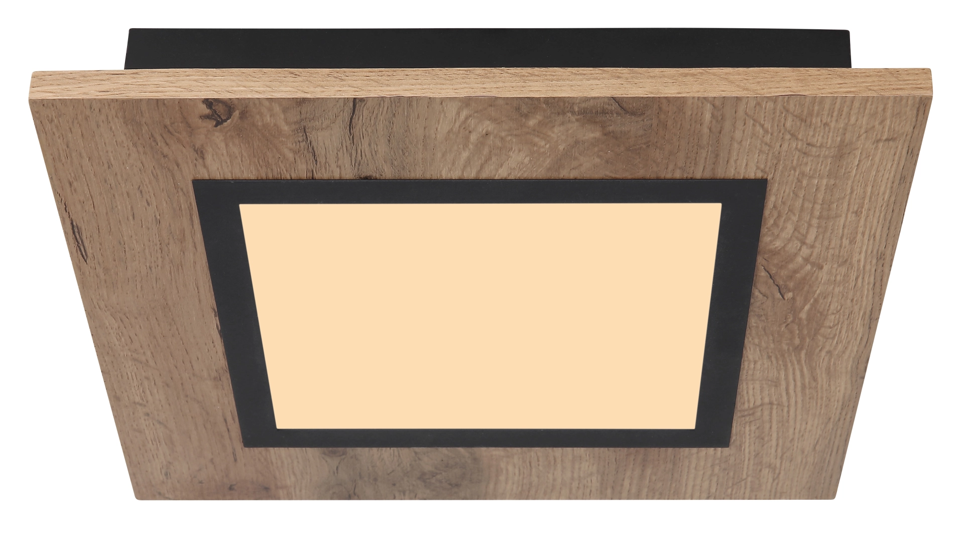 Le plafonnier galbé de la série LEA inspire par son design simple. Sur un plafond noir mat, il y a un cadre carré en MDF de forme en aspect bois (30 x 30 cm) avec un couvercle en plastique opale. Un panneau LED inclus fournit une lumière blanche chaude de 3000 Kelvin et assure ainsi une atmosphère agréable.