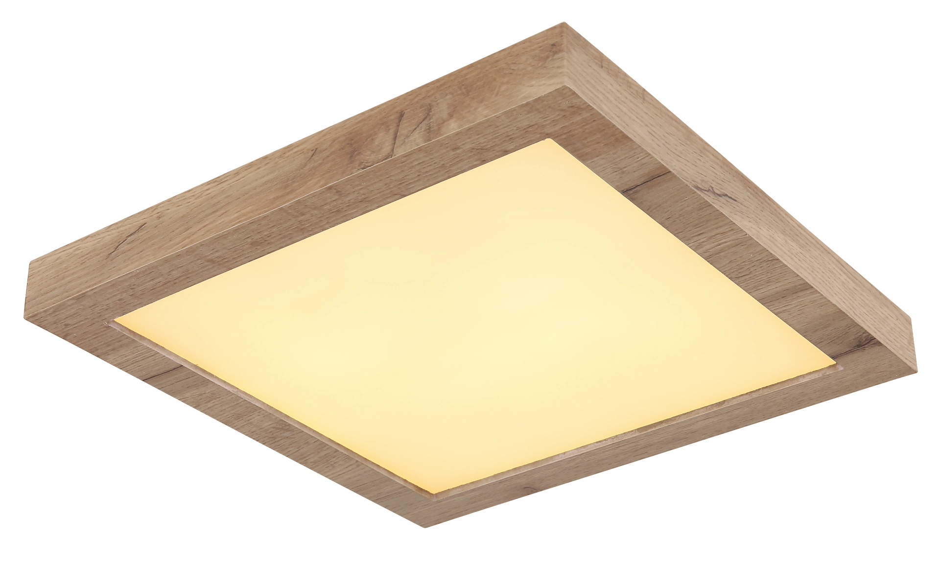 Le plafonnier est en métal en blanc mat, MDF en aspect bois foncé et plastique en opale. Les dimensions sont LxlxH : 350x350x60mm. Le luminaire dispose d’une LED d’une puissance de 16W et d’une tension de 230V, qui fournit une source lumineuse de source 1800lm et une sortie de 620lm à une température de couleur de 3000K. Nous espérons que vous serez satisfait de ce plafonnier.