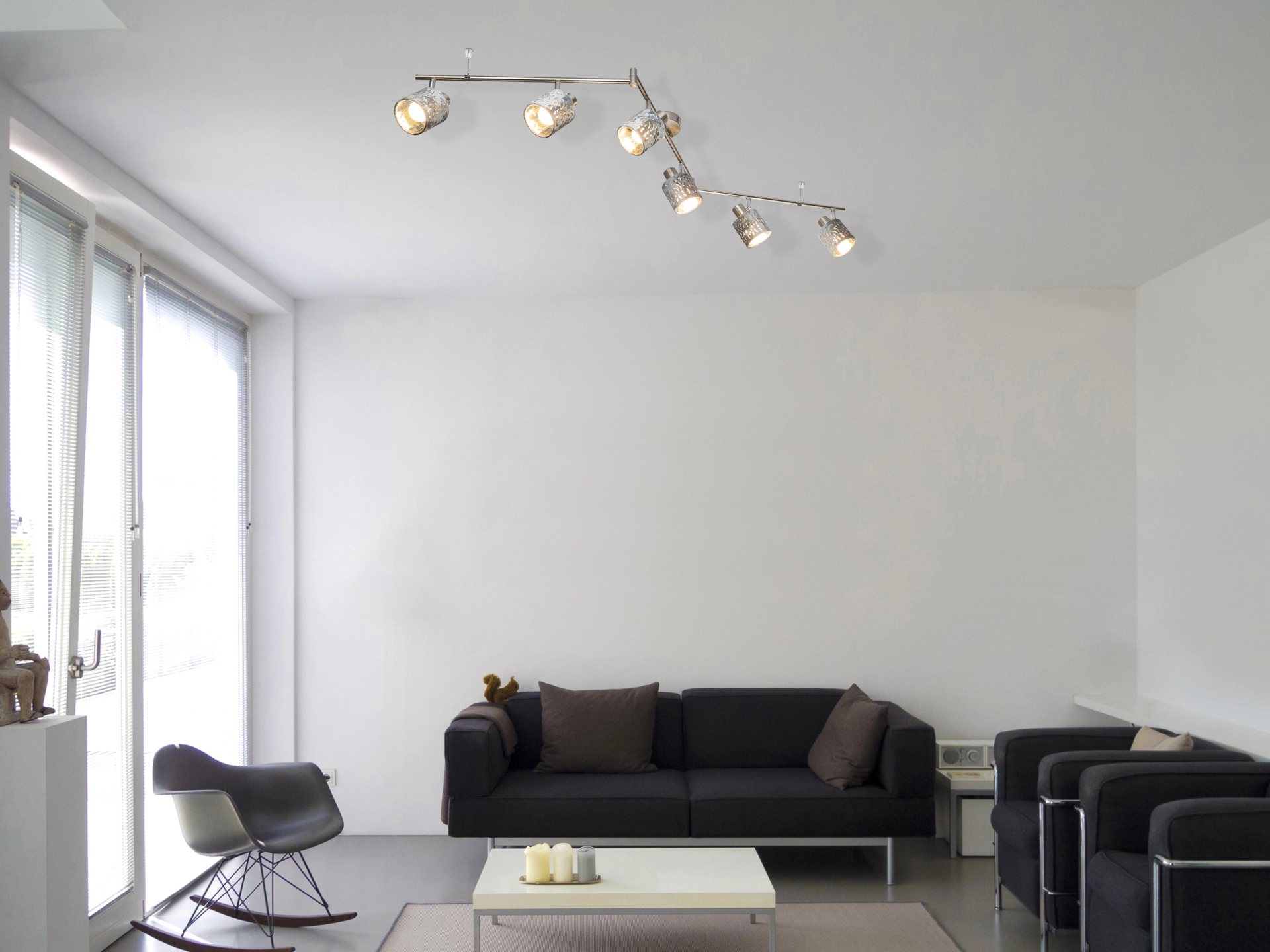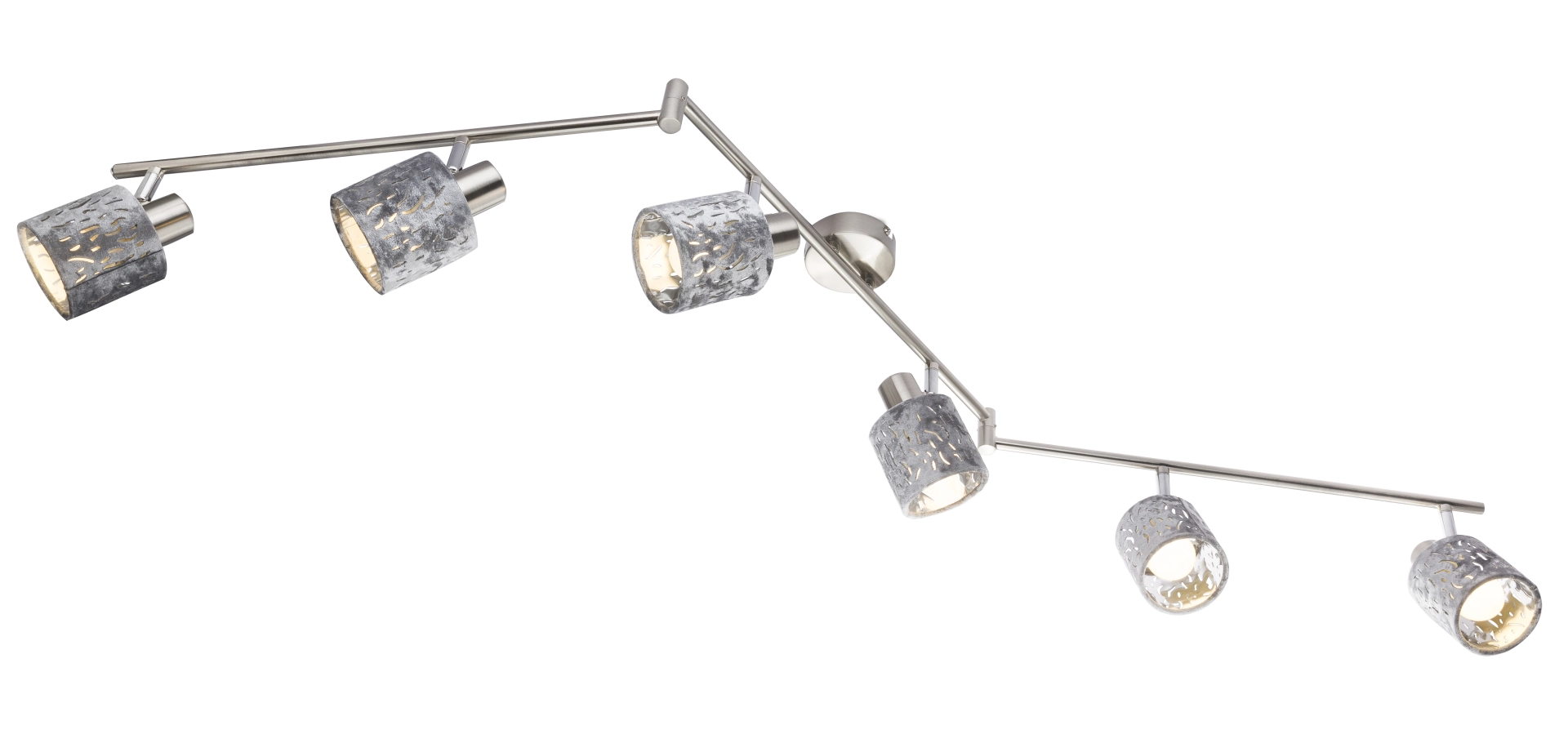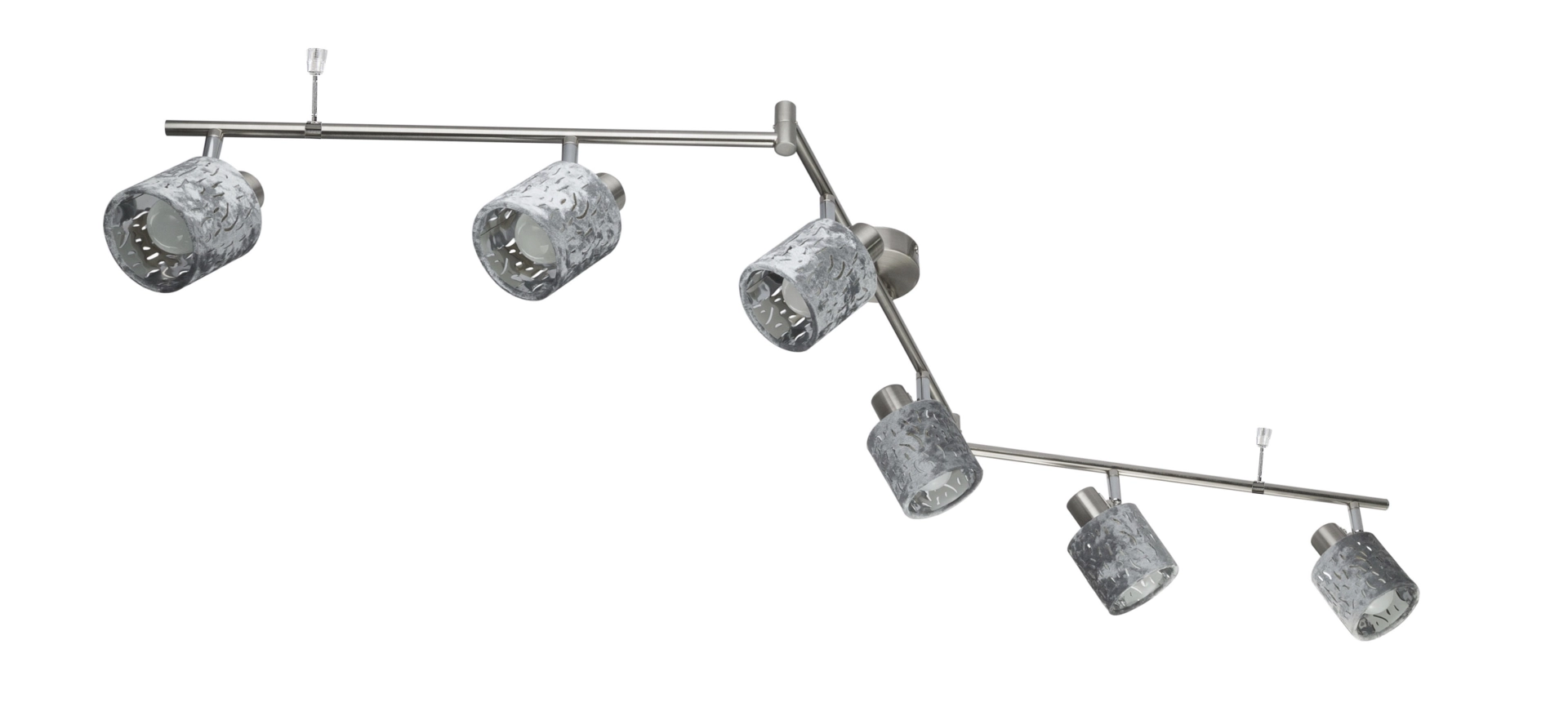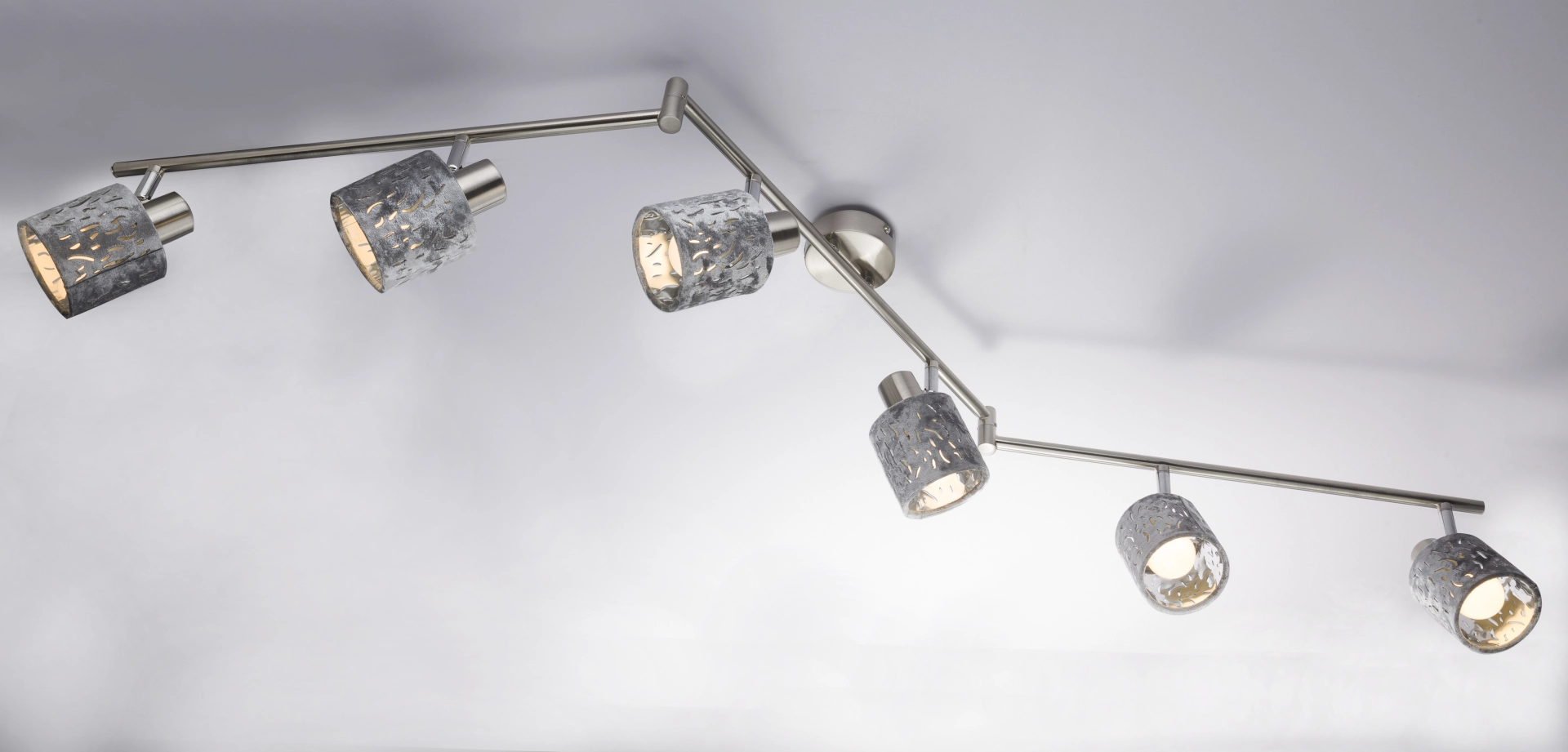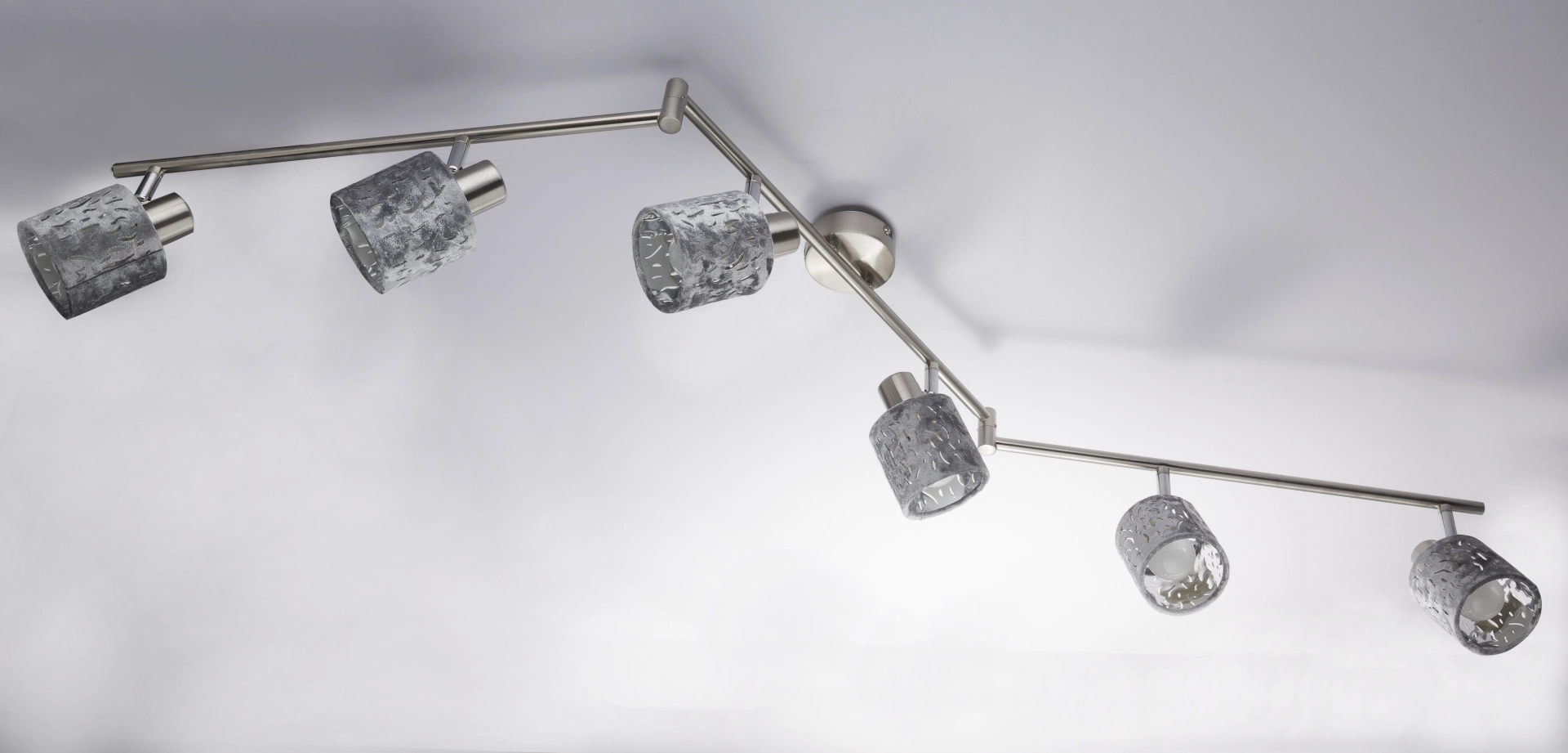 La série de projecteurs Alys élégante et élégante marque clairement par sa combinaison de matériaux. Les six stores cylindriques mobiles de ce projecteur de plafond, attachés à trois bras droits, sont recouverts de velours argenté, qui s’accorde à merveille avec l’intérieur argenté des taches, qui fournissent une belle lumière. Le métal nickel-mat du support ainsi que les pièces chromées individuelles complètent le tableau et font de ce projecteur un véritable accroche-regard. Les projecteurs ont chacun une prise E14, ce qui vous permet de déterminer vous-même la source lumineuse et donc l’intensité lumineuse et la couleur de la lumière (max. 8W). Avec d’autres modèles de cette série, vous pouvez compléter le tableau dans vos locaux.