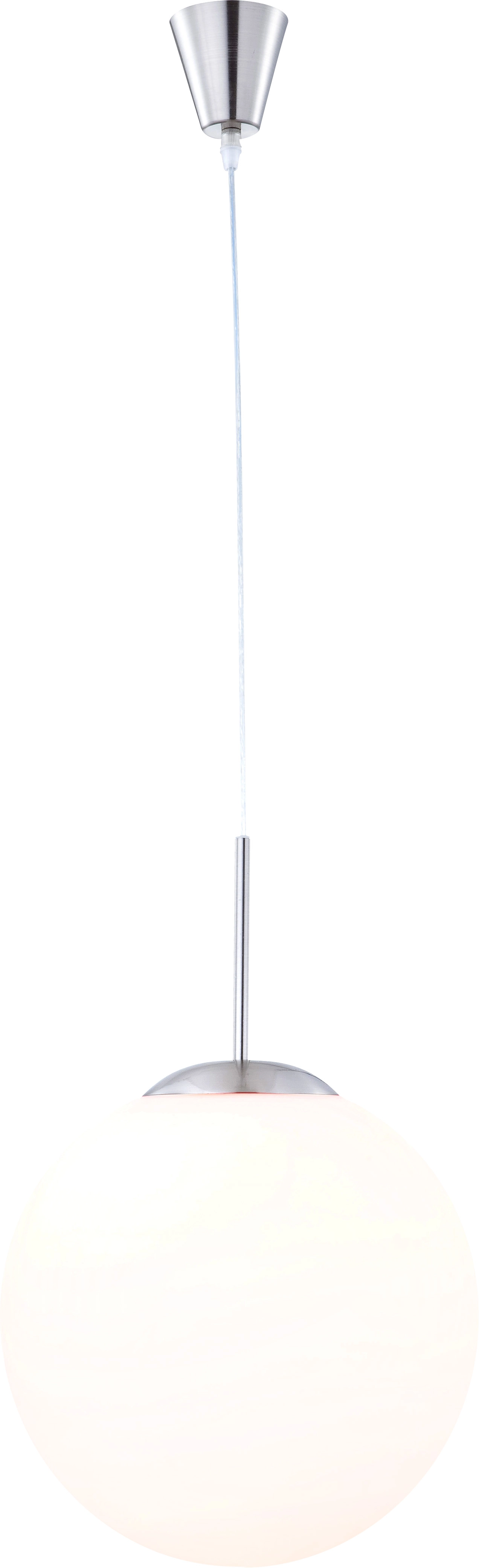 Cette suspension contemporaine en verre opale blanc assure un éclairage accueillant et uniforme dans chaque pièce. L’abat-jour blanc fournit une lumière vive et est maintenu en place par un cadre nickel-mat.