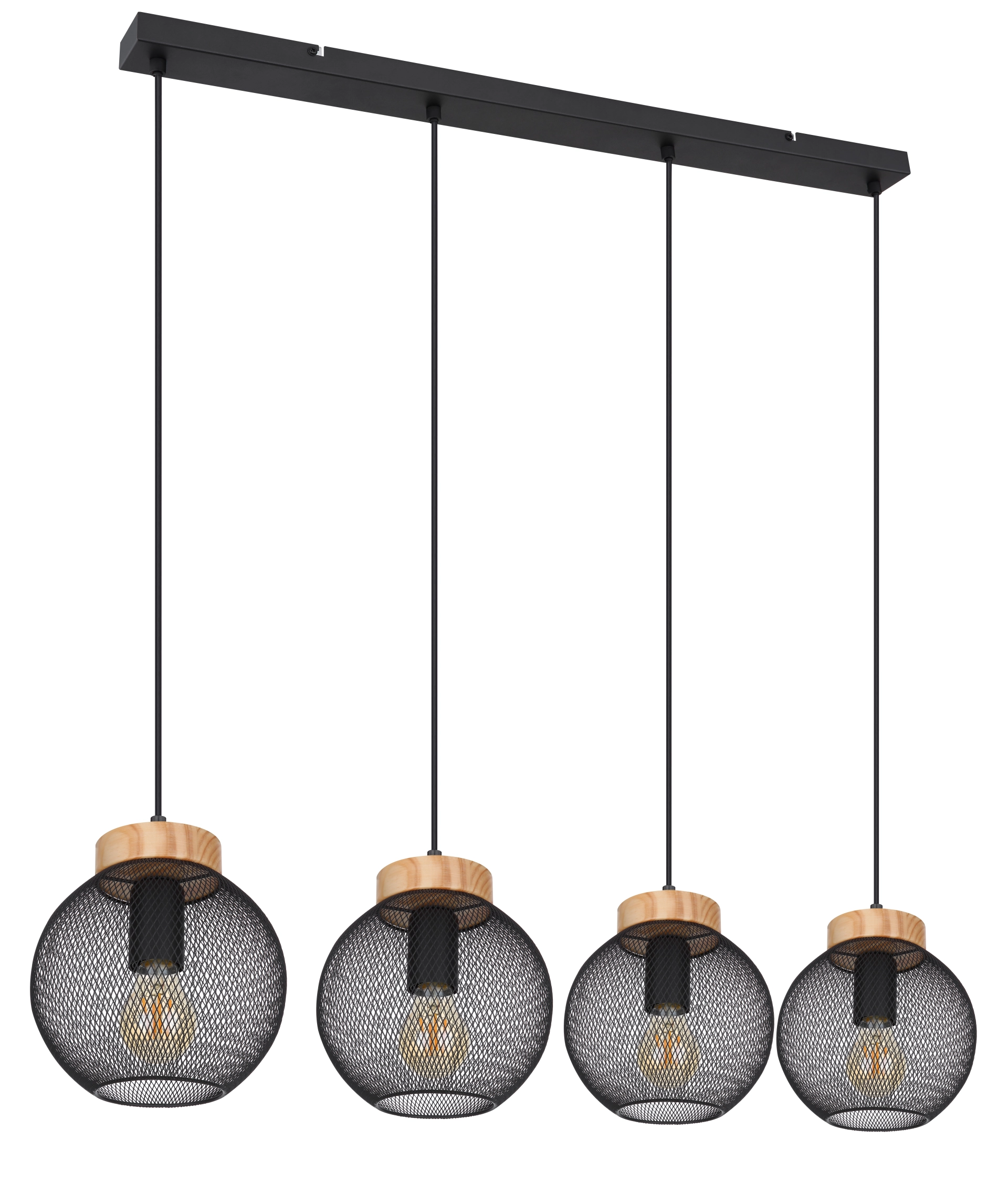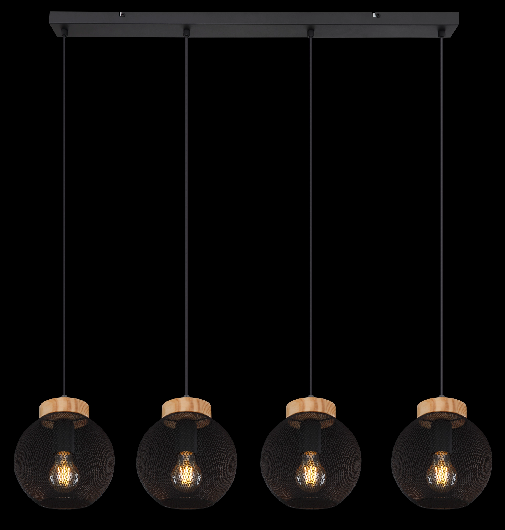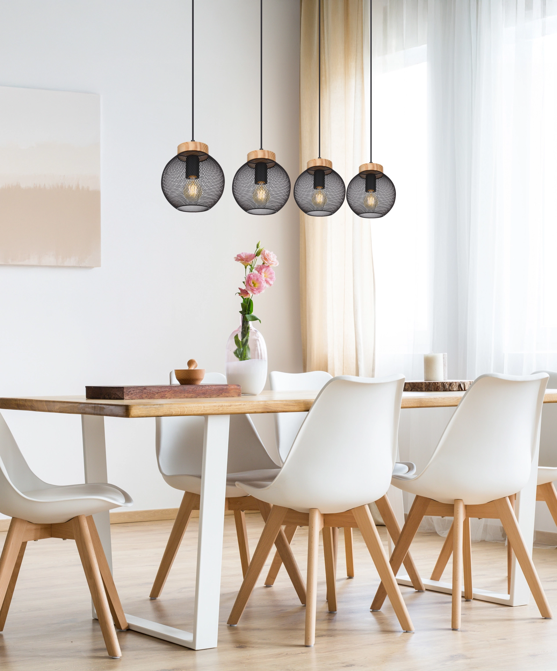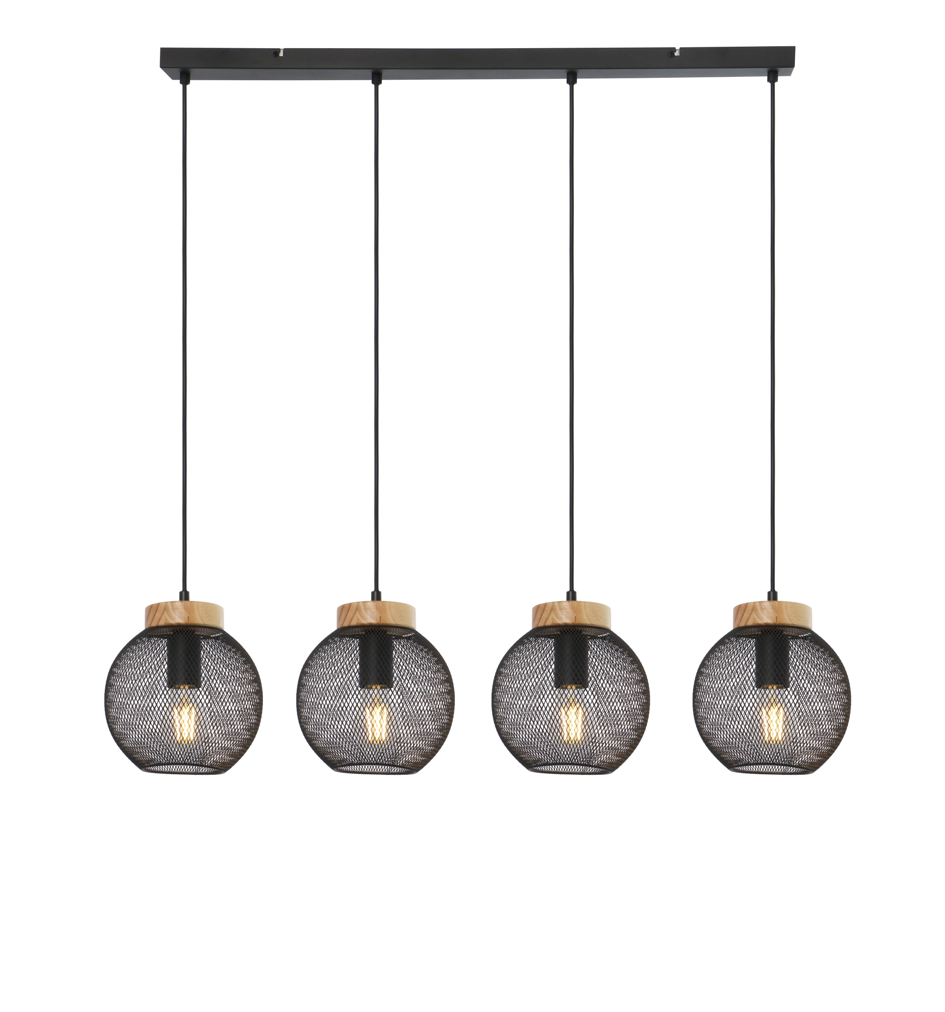 Cette lampe suspendue de la série Pablo est un bel ajout à vos intérieurs. La suspension de 95 cm de long se compose d’une bande métallique noire-mate sur laquelle sont suspendues quatre vitres en bois avec des abat-jour en treillis métallique magnifiquement incurvés. Vous pouvez les équiper d’ampoules E27 de votre choix, ce qui vous donne la possibilité de déterminer individuellement la couleur et la luminosité de la lumière. De plus, la hauteur du luminaire peut être réglée jusqu’à 120 cm. Avec d’autres modèles de cette série, vous pouvez compléter l’image globale dans vos quatre murs.