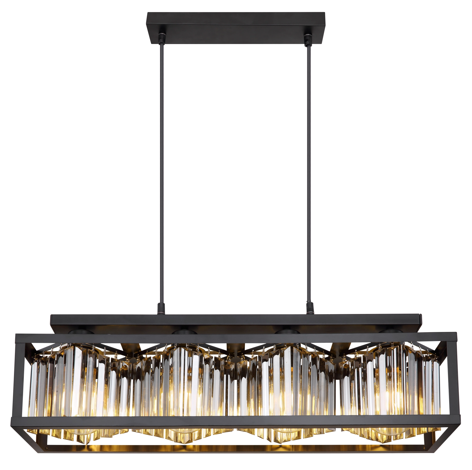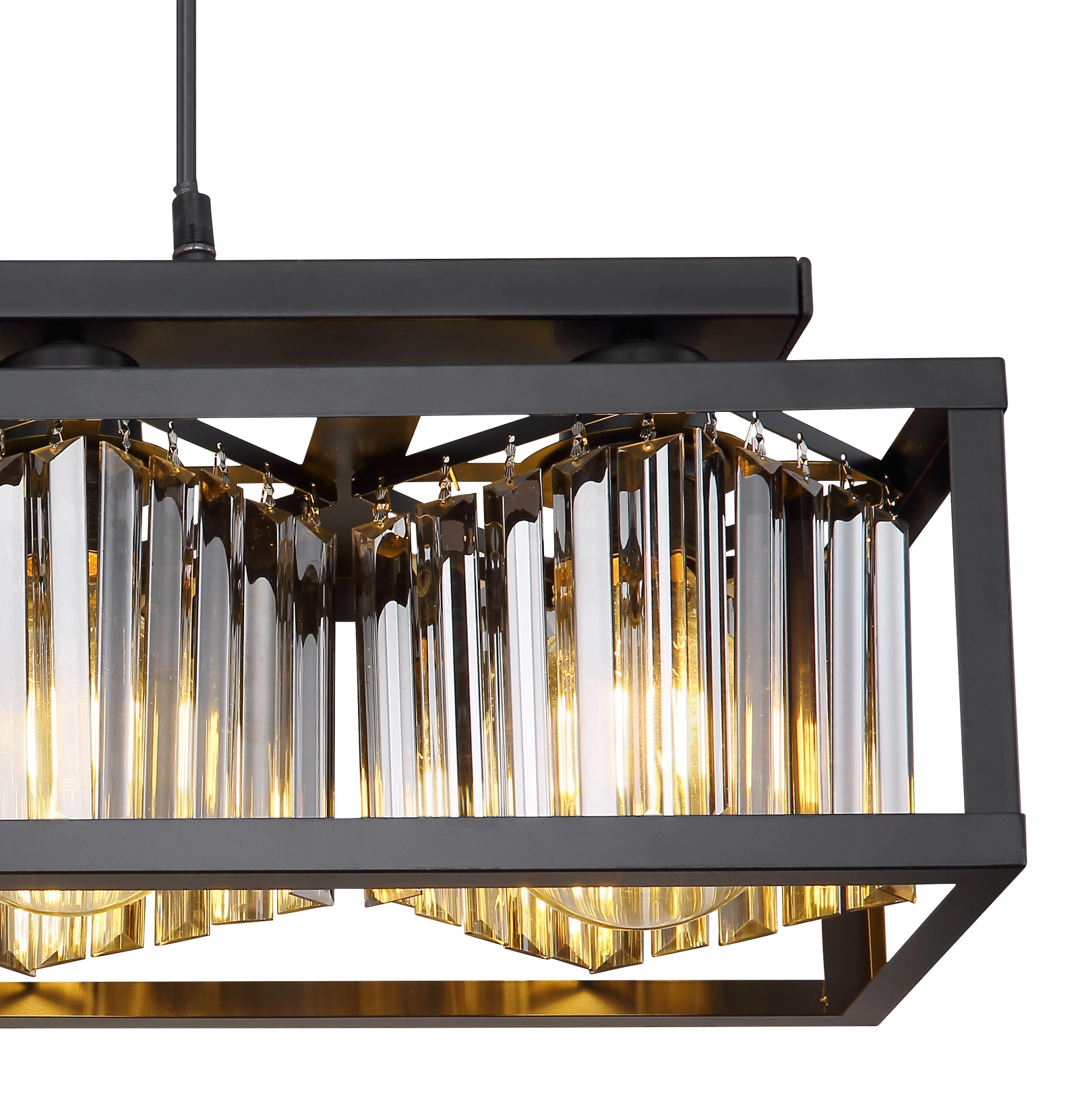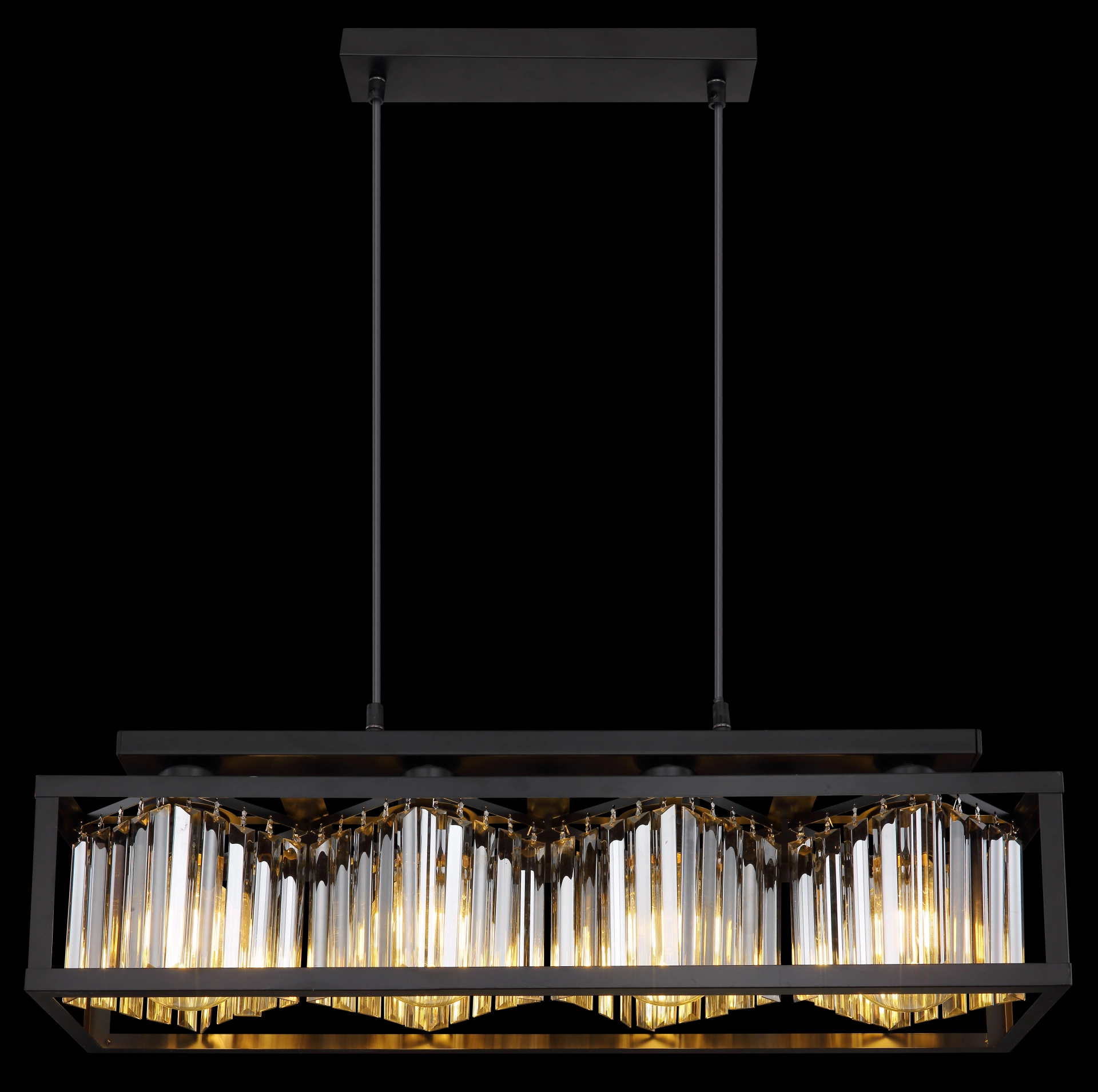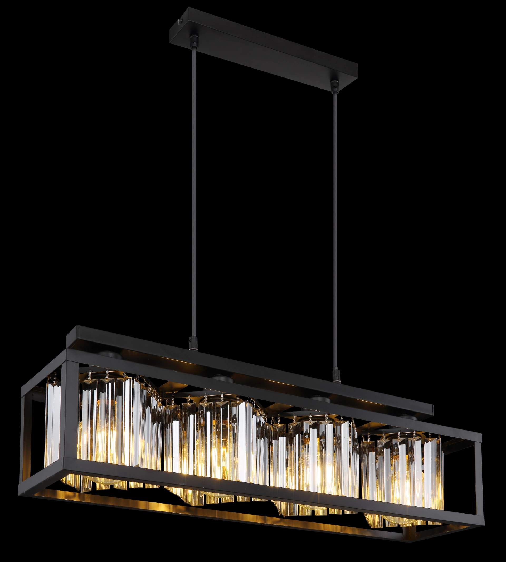Ce magnifique plafonnier inspire par son superbe design et devient l’accroche-regard de chacune de vos pièces. Composée d’une cage rectangulaire noire mate (68x17cm) avec une variété de tiges de verre à l’intérieur, la lampe a une hauteur de 1,2m. Quatre prises E27, jusqu’à une puissance maximale de 40 watts, vous donnent le libre choix de la source lumineuse. Définissez des accents.