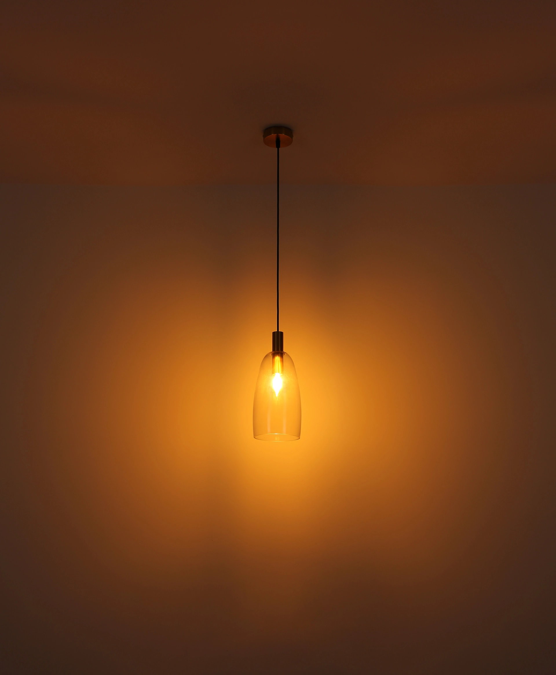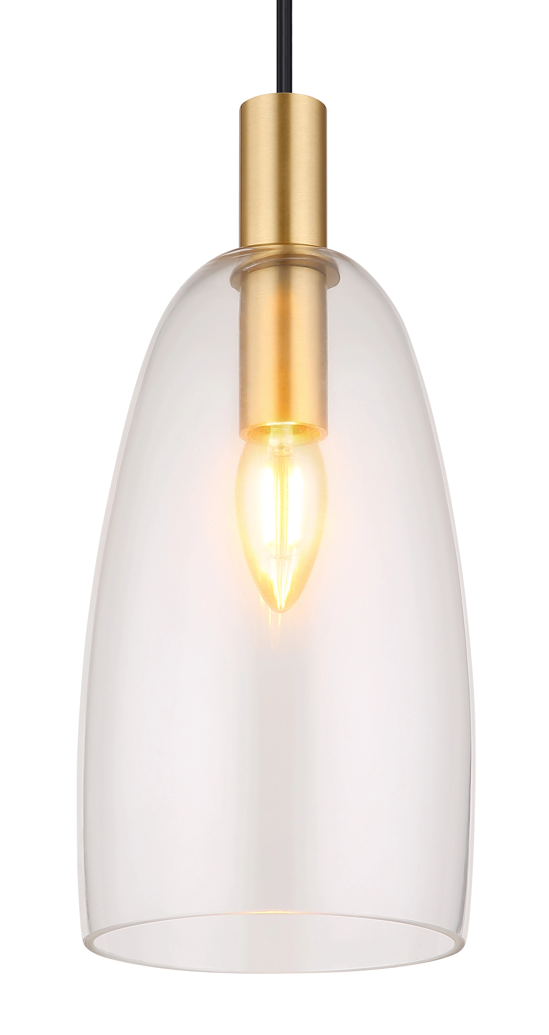 Cette élégante suspension inspire avec un beau design. D’un montage rond au plafond, un câble noir de 1,2 m de long dépasse vers une prise E14, équipée d’un abat-jour en verre (Ø 14 cm) et de décorations en laiton. La prise E14 vous permet de déterminer votre propre couleur de lumière et luminosité jusqu’à une puissance maximale de 40 watts. En raison de la longévité et des économies d’énergie, nous recommandons les ampoules LED.