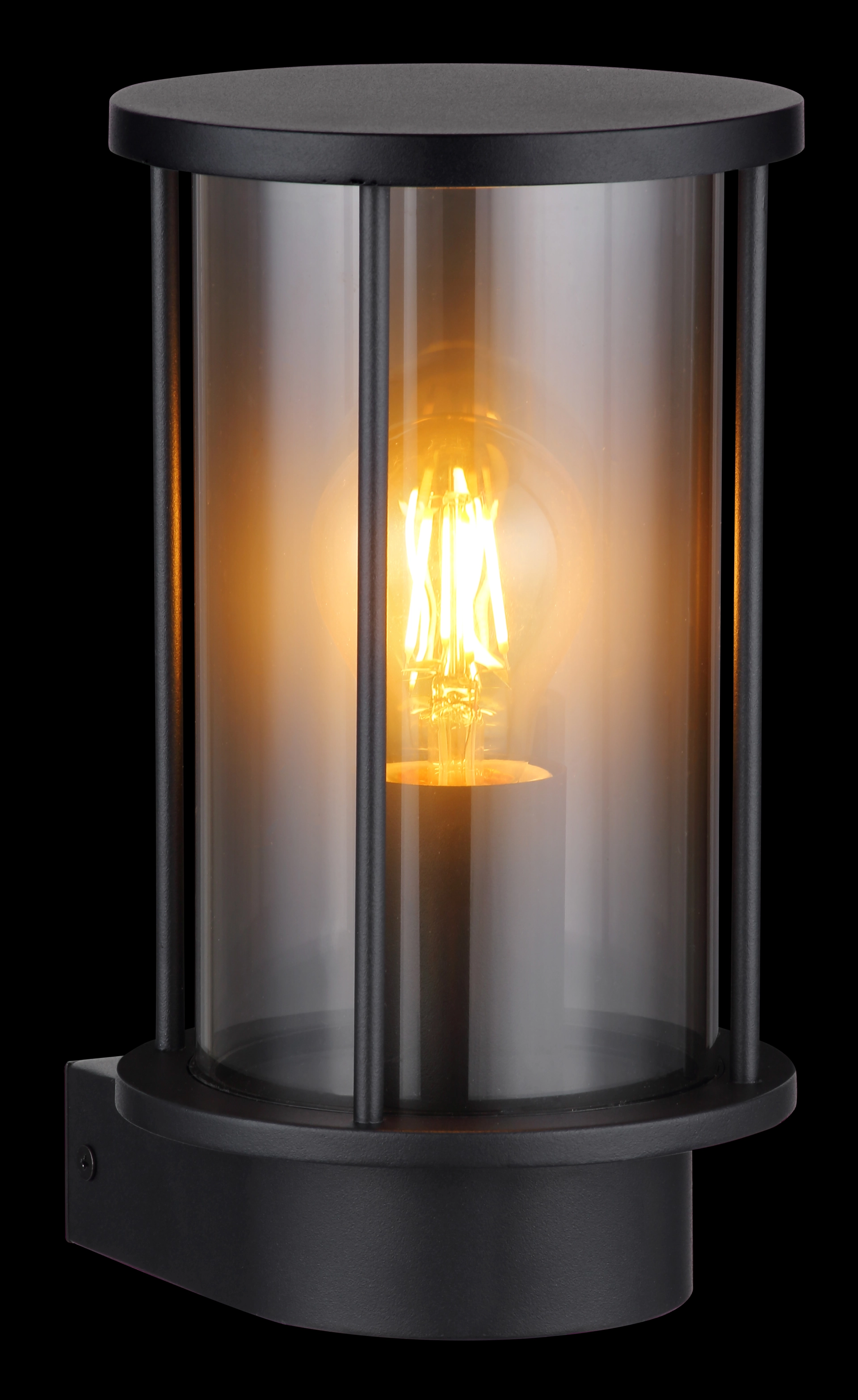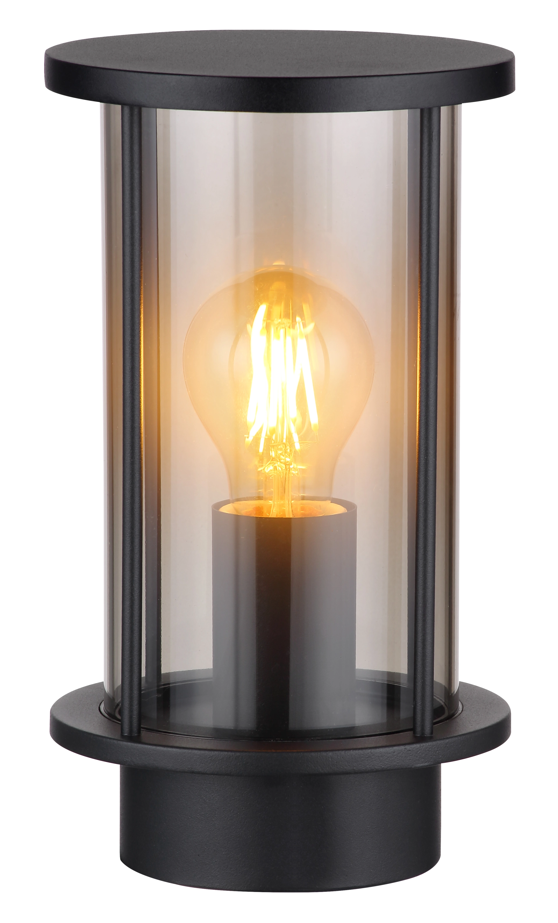 Die Außenleuchte der Serie GRACEY hat ein Gehäuse aus schwarz mattiertem Edelstahl und einen rauchfarbenen Glasschirm. Die Metallstäbe, die den ... Mehr erfahren Mehr erfahren