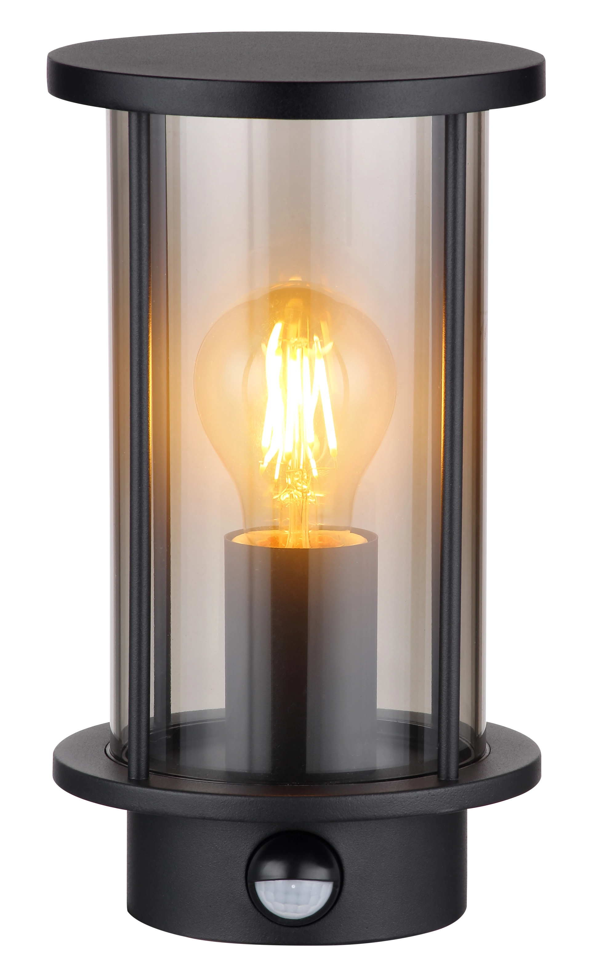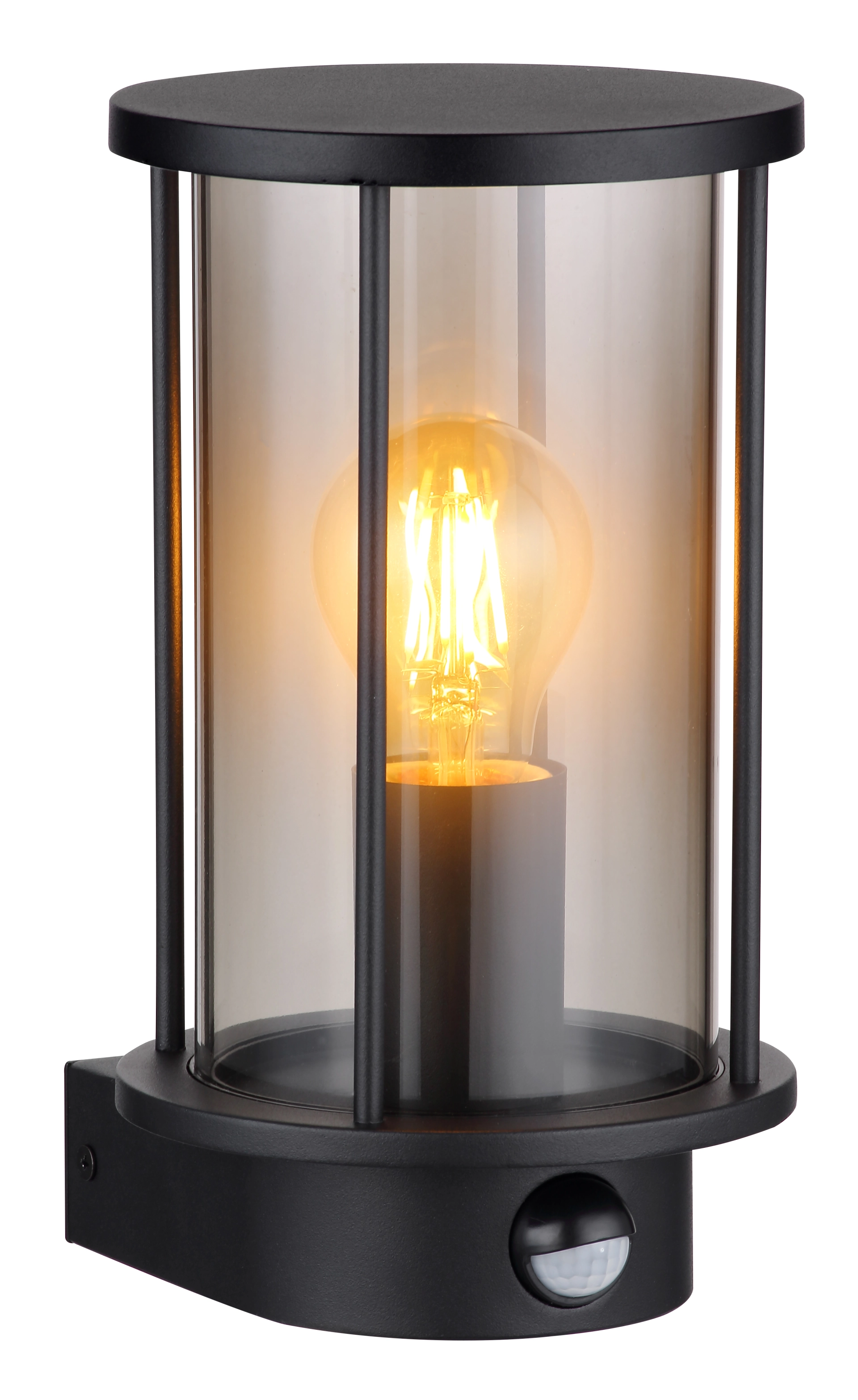 Die Außenleuchte der Serie GRACEY hat ein Gehäuse aus schwarz mattiertem Edelstahl und einen rauchfarbenen Glasschirm. Die Metallstäbe, die den Schirm umgeben, sind ebenfalls in schwarz matt gehalten. Ein Sensor ist im Lieferumfang enthalten und die Schutzart der Leuchte beträgt IP54. Die Abmessungen der Leuchte betragen BxH: 143x252mm und die Anbringungshöhe beträgt 152mm. Die Leuchte ist für eine E27 Glühlampe mit maximal 60W und 230V vorgesehen. Diese ist nicht im Lieferumfang enthalten und muss separat erworben werden.