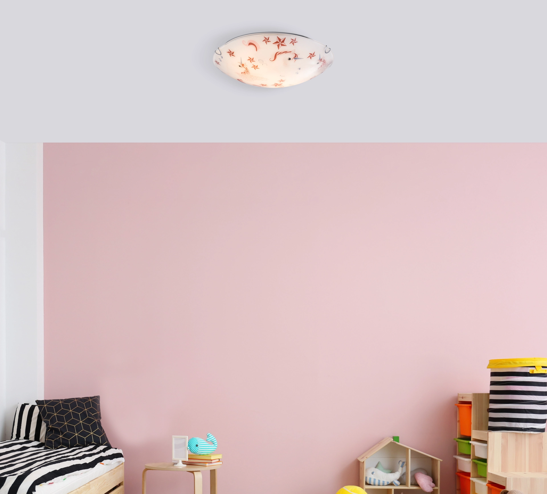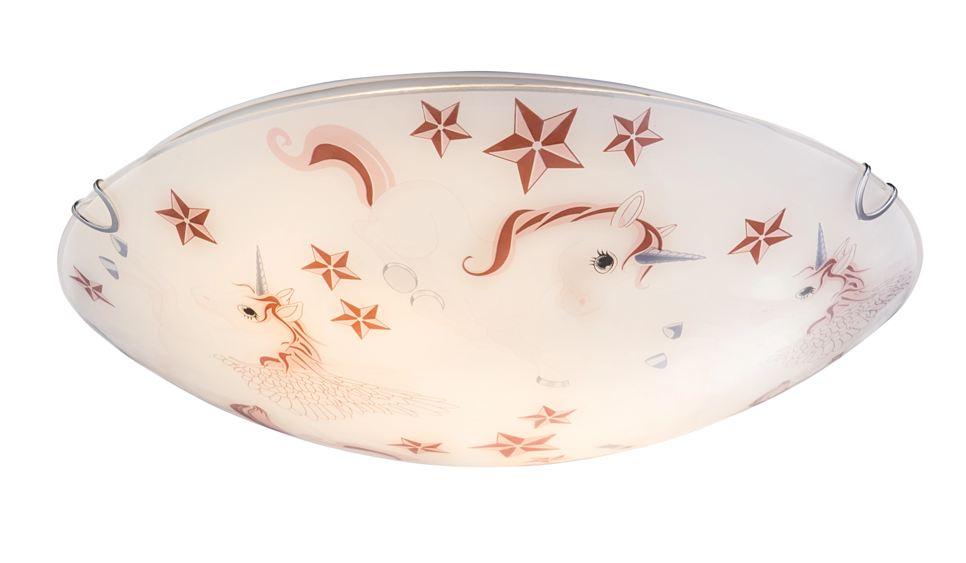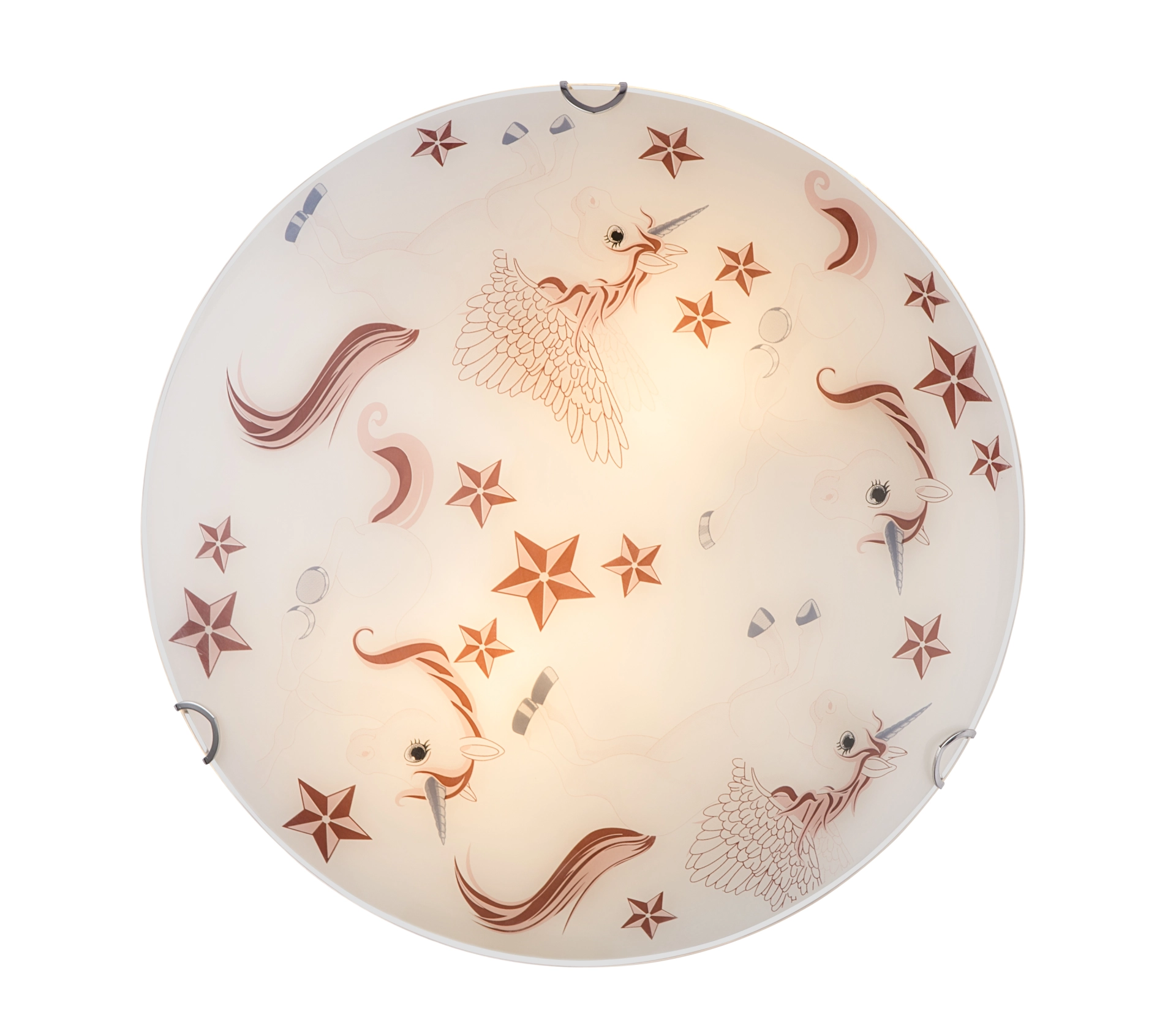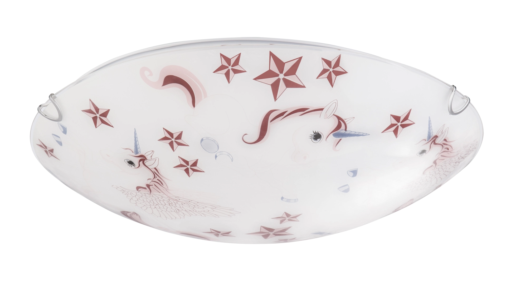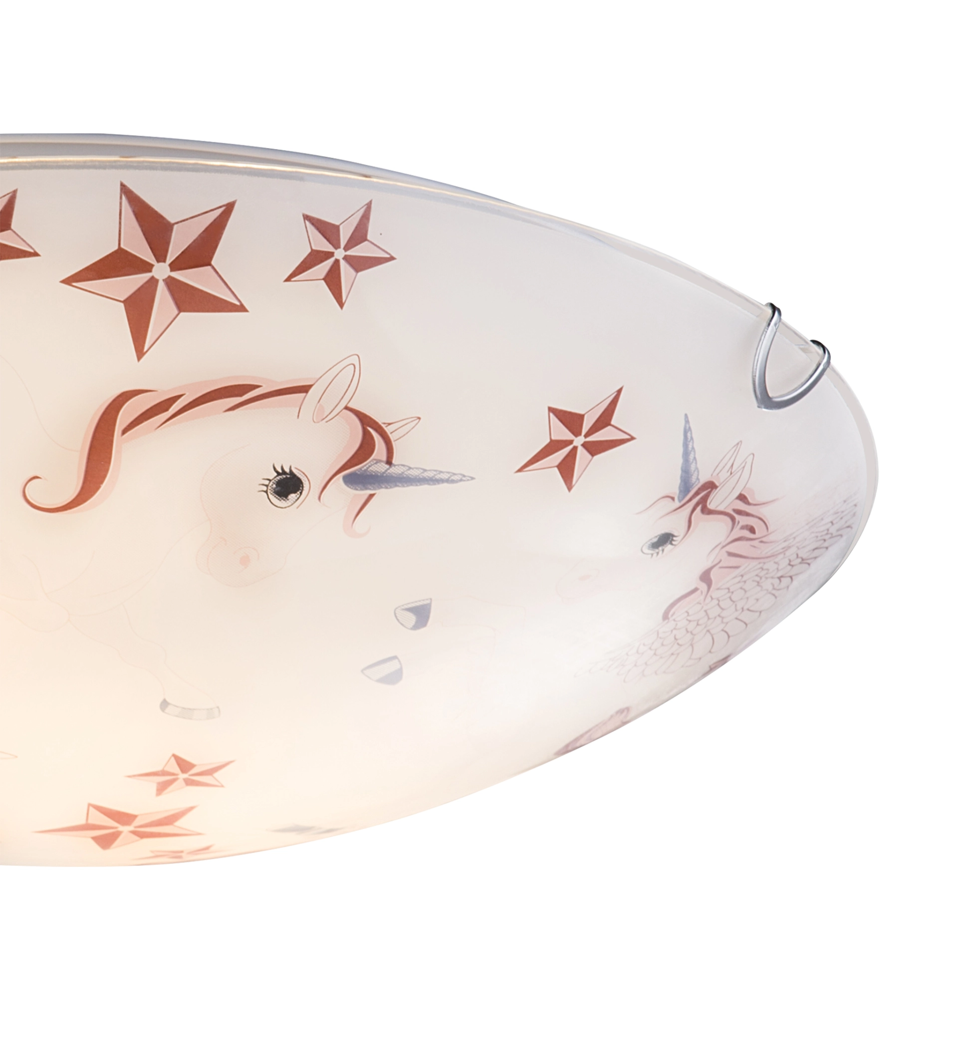 Perfekt geeignet für jedes Kinderzimmer bietet das runde gewölbte Glas (Ø40cm) dieser Deckenleuchte wunderschöne Einhorn-Motive mit farblich passenden Sternen dazu. Die verfügbare E27 Fassungen dieser Deckenlampe ermöglich es Ihnen das Leuchtmittel und damit die Lichtstärke und Lichtfarbe selber zu bestimmen (Illu Leuchtmittel, max.60W). Aufgrund ihrer Stromersparnis und Langlebigkeit empfehlen wir LED-Leuchtmittel. Der Nachwuchs wird sich freuen!
