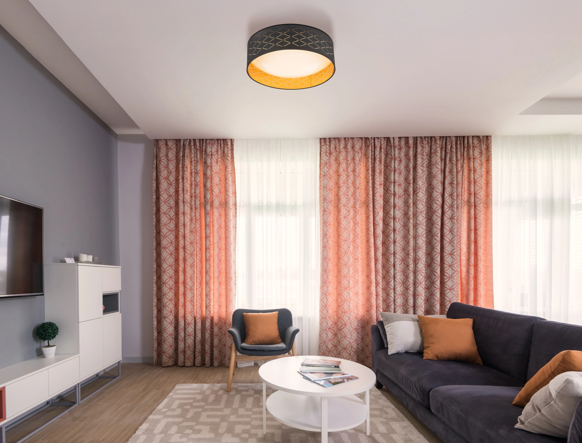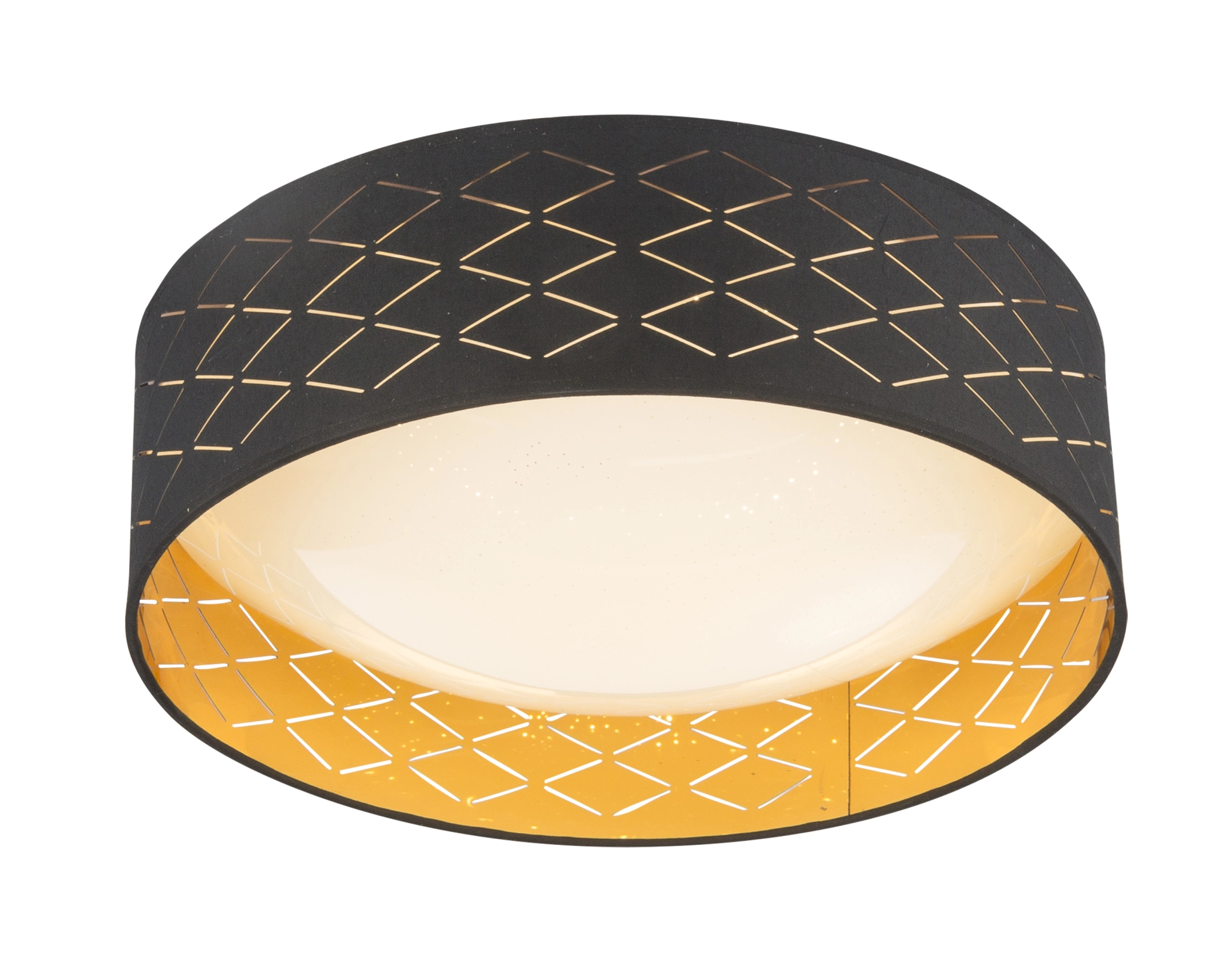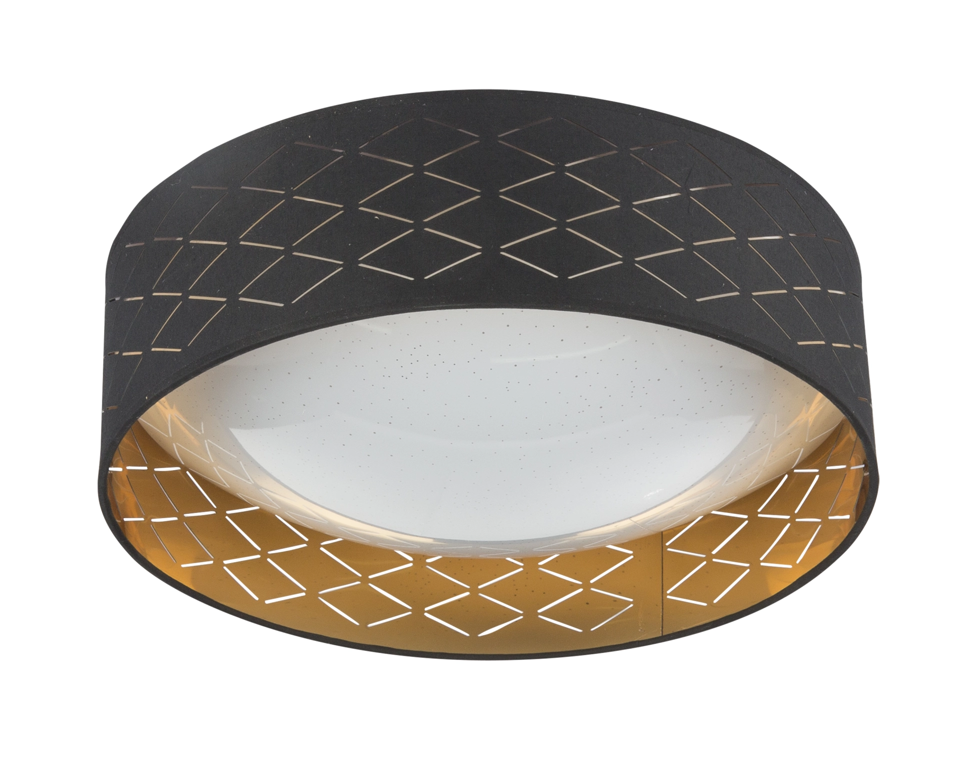 Hierbei handelt es sich um eine moderne LED-Deckenleuchte. Der geschmackvolle Leuchtschirm besitzt Dekorstanzungen, dadurch wird das Licht beeindruckend reflektiert. Der schwarze Textilschirm hat einen Durchmesser von 40cm und eine Höhe von 12cm. Die Leuchte passt hervorragend in ein Schlafzimmer, lassen auch Sie sich beindrucken von die Licht Reflektionen. Der Innenschirm ist goldfarben, dadurch wirkt das Licht angenehm warm. Dank des inkludierten 18 Watt LED-Leuchtmittel, leistet die Leuchte bei einer gemütlich warmweißen Lichtfarbe von 3000K, 1000 Lumen starkes Licht. Die Deckenleuchte passt zu vielen modernen und zeitgemäßen Wohnstilen. Sie lässt sich sehr gut mit anderen Produkten der gleichen Serie kombinieren.