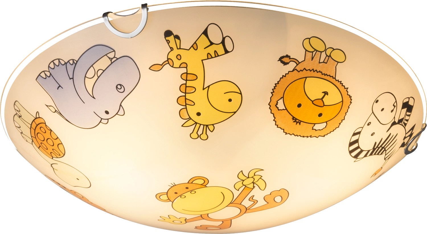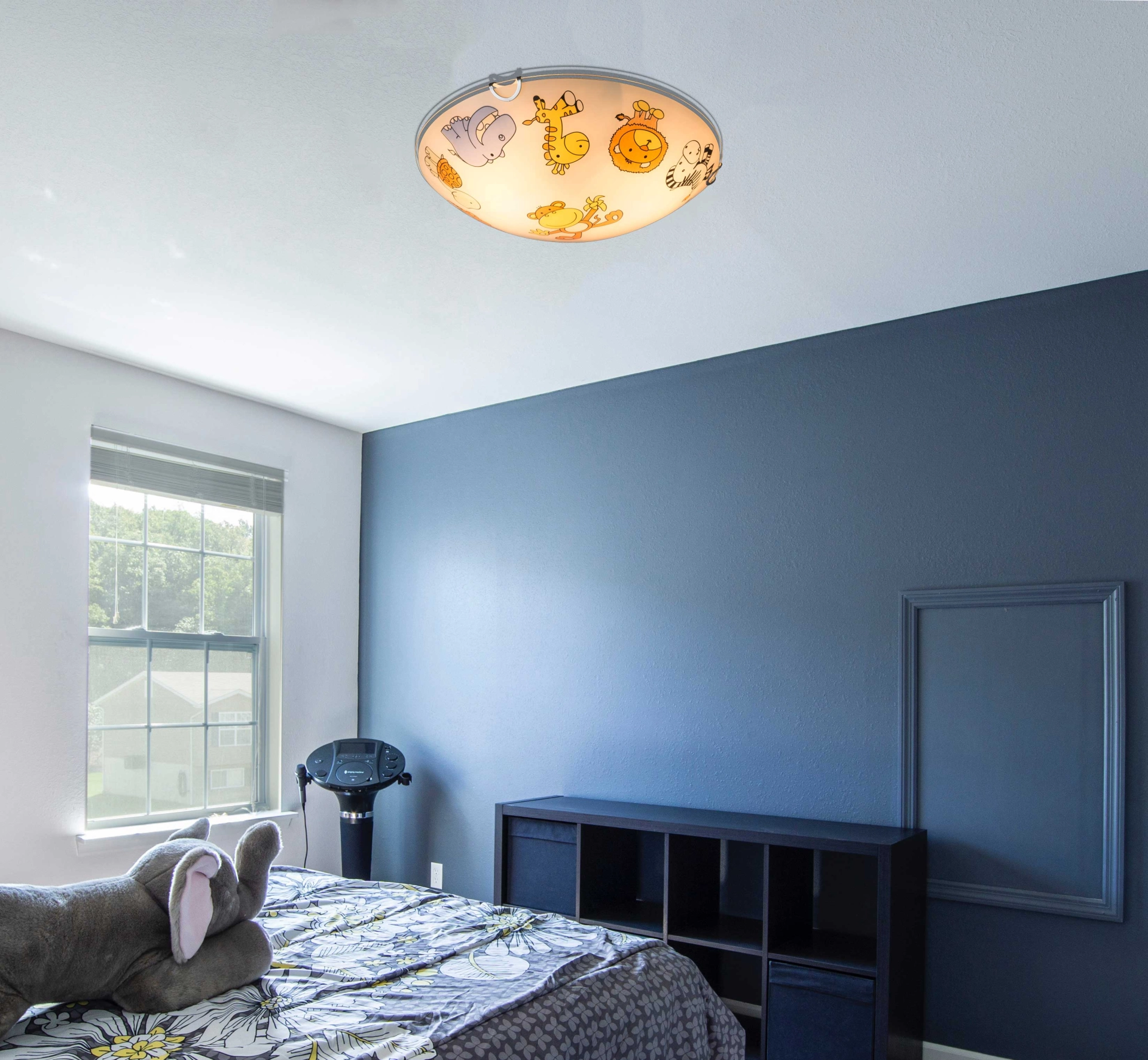 Die runde (Ø30 cm) Deckenlampe Kiddy ist das Highlight in jedem Kinderzimmer. Diese Kinderzimmerlampe mit dem mit bunten Kindermotiven dekorierten Glas, bietet Ihnen mit den zwei zur Verfügung stehenden E27 Fassungen die Möglichkeit durch den Einsatz beliebiger Leuchtmittel die Lichtstärke und auch Lichtfarbe selbst zu bestimmen. Aufgrund ihrer Stromersparnis und Langlebigkeit empfehlen wir LED-Lampen. Das gewählte Leuchtmittel sollte allerdings eine Lampe in Tropfenform sein.