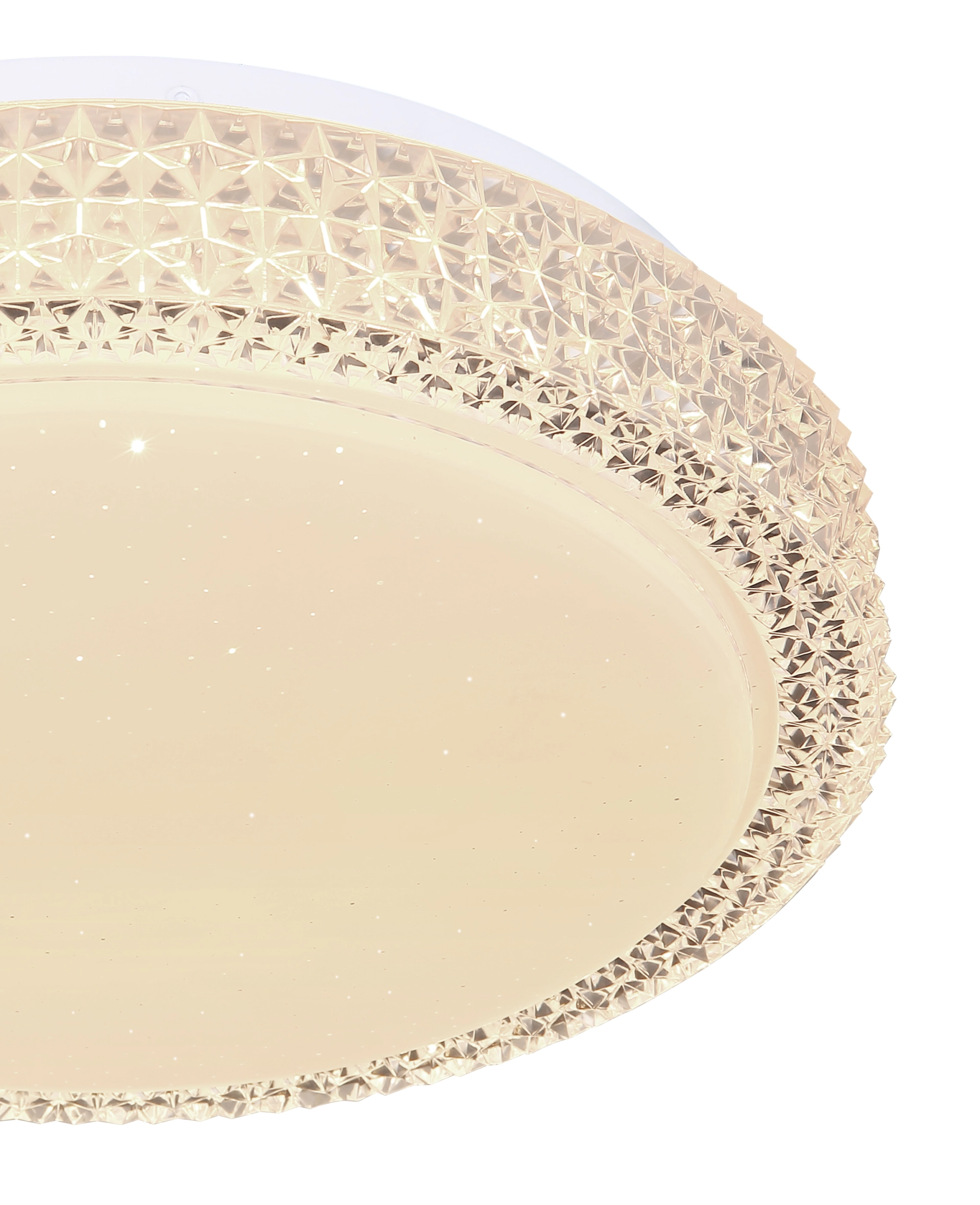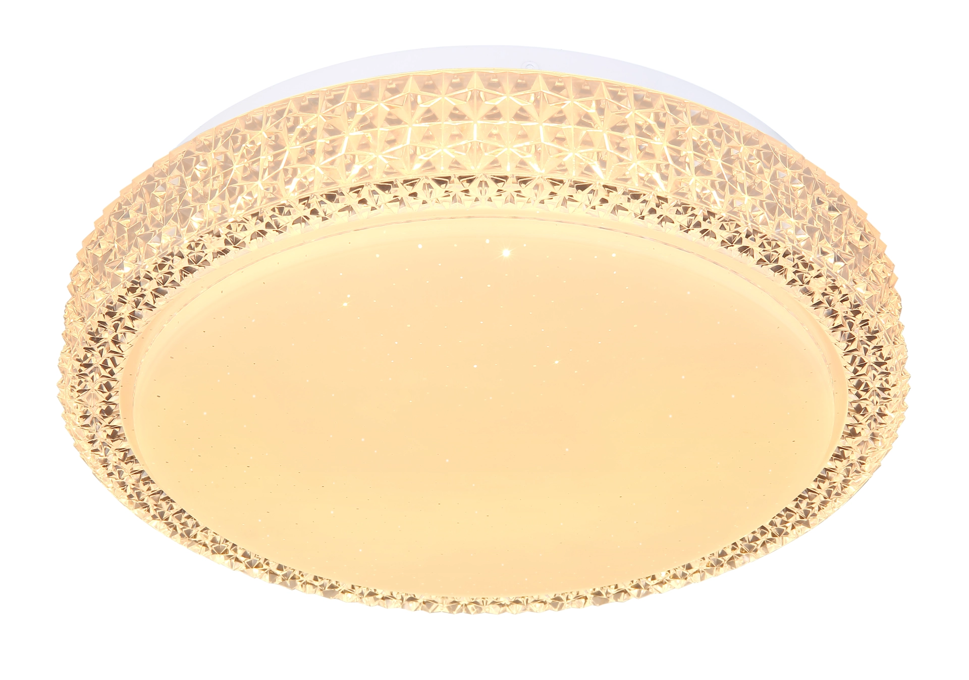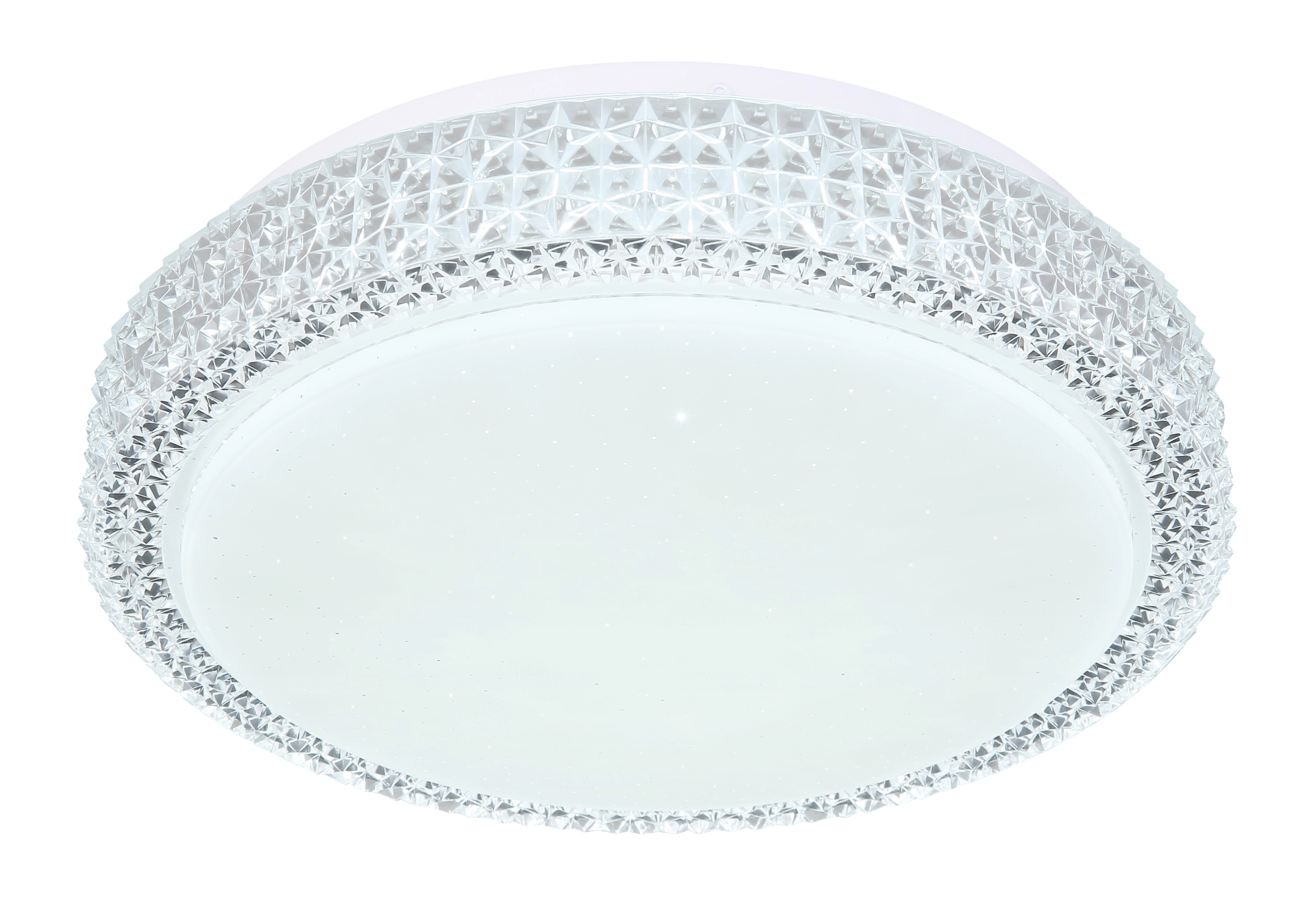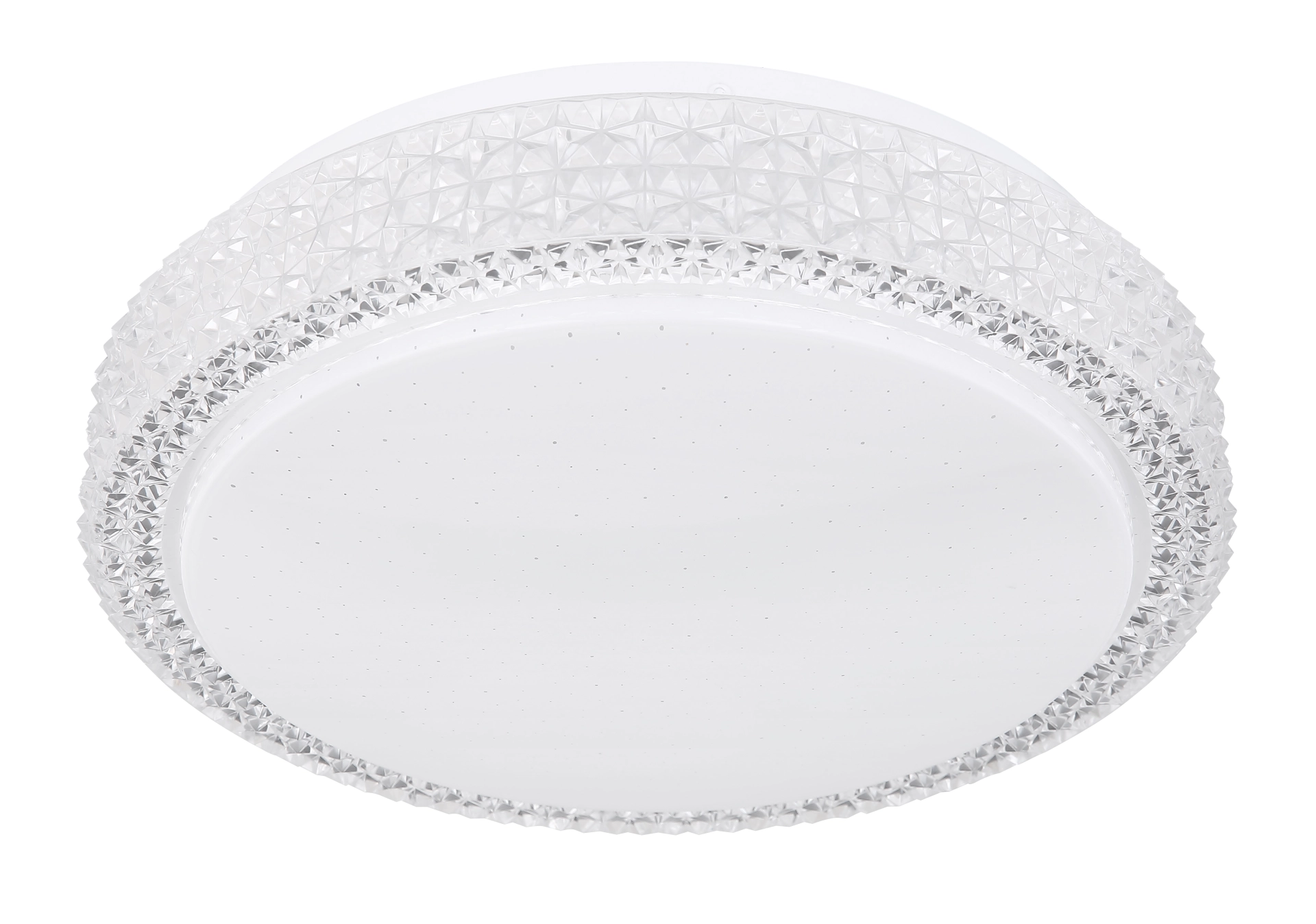 Diese runde (Ø30cm) LED Deckenlampe punktet durch ihre Verarbeitung sowie ihr edles Design. Die Kombination aus weißem Metall, Sparekle Dekor und den klaren Kunststoffkristallen ist auf jeden Fall ein Hingucker! Außerdem lässt sich die Lichtfarbe mittels Wandschalter in drei Stufen je nach Belieben umschalten. (Warmweiß 3000K – Neutralweiß 4000K – Kaltweiß 6000K).