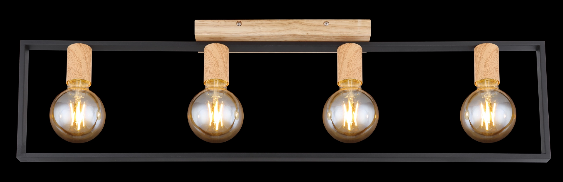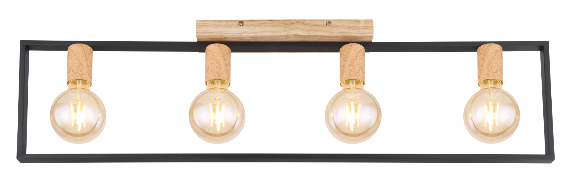 Diese Deckenlampe überzeugt durch ihr elegantes Design aus schwarz-mattem Metall und Holz. Die 26 cm große Deckenleuchte besteht aus einem 90 cm langen, rechteckigen Metallrahmen, der an dem Holzquader fixiert ist und über vier von Holz umrahmten E27-Fassungen verfügt. Diese können Sie mit passenden Leuchtmitteln Ihrer Wahl bestücken, wodurch Sie die Möglichkeit haben, Lichtfarbe und Helligkeit individuell zu bestimmen. Durch weitere Artikel der gleichen Serie können Sie in Ihren Innenräumen für ein stilvolles Ambiente sorgen und das Gesamtbild komplettieren.