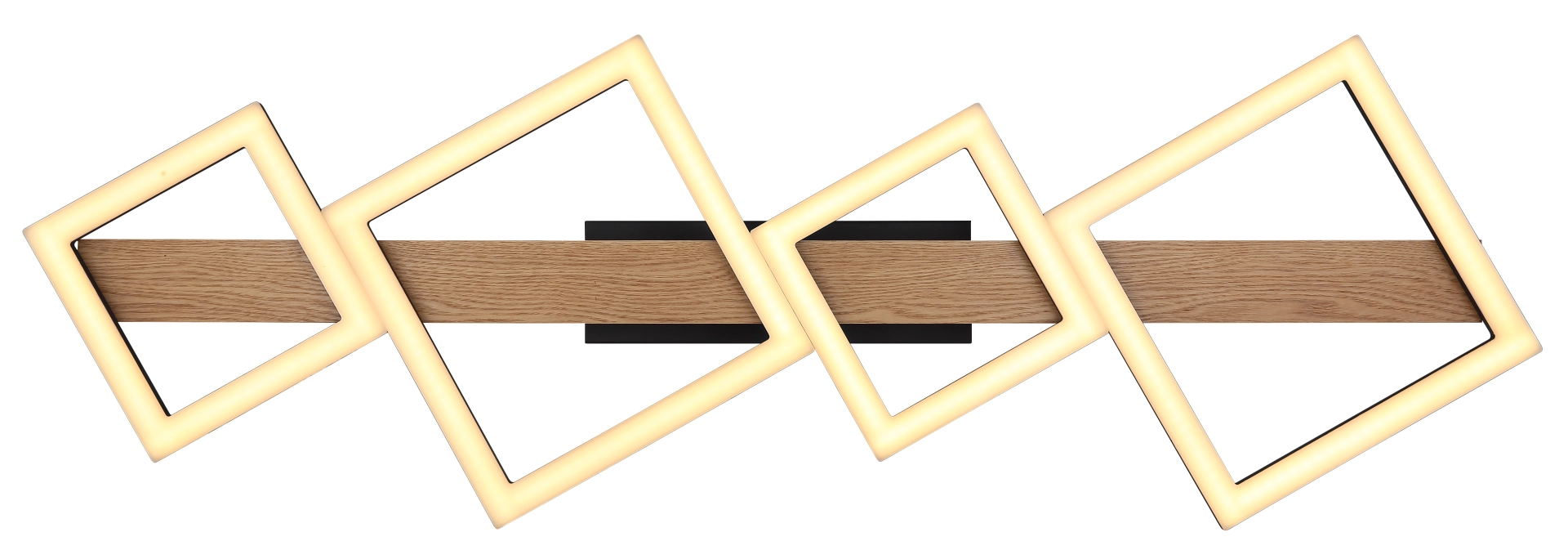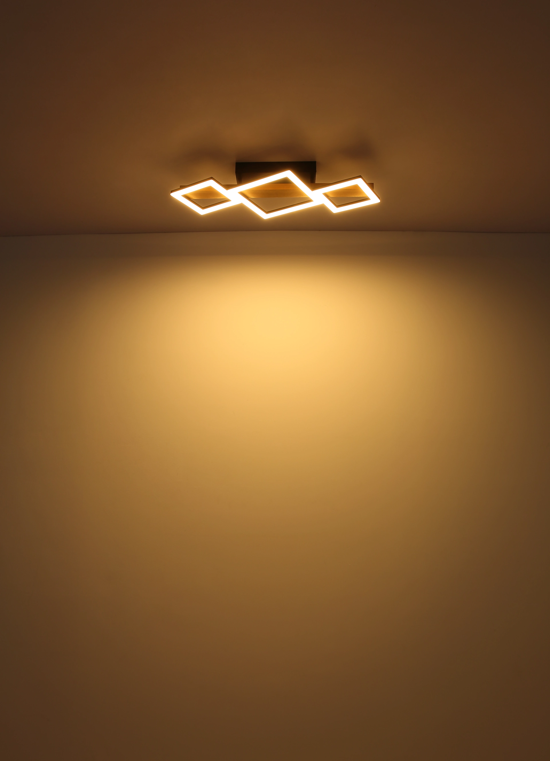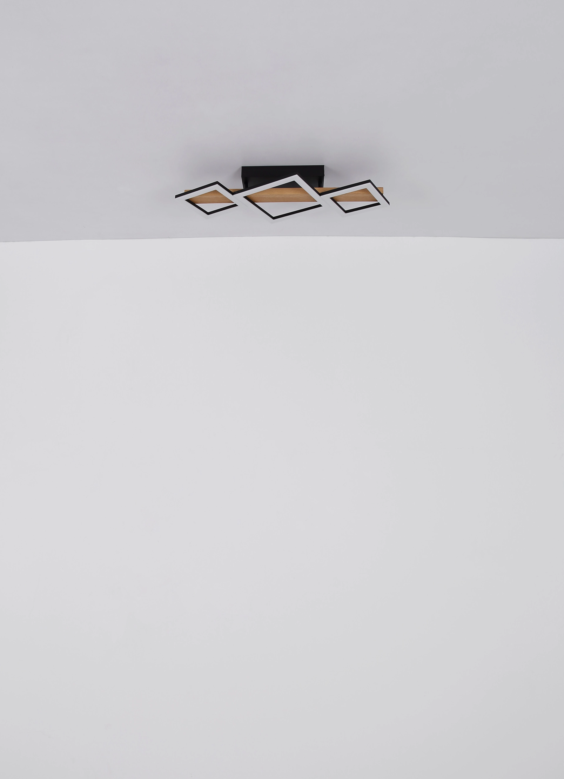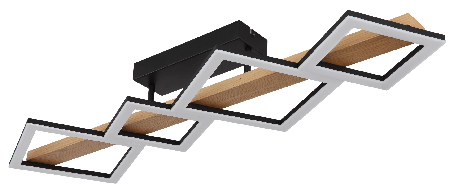 Diese Deckenleuchte der Serie DUSTIN hat eine Länge von 920 mm, eine Breite von 300 mm und eine Höhe von 130 mm. Das Design ist aus Metall in schwarz matter Optik und mit Holzoptik in dunklem MDF. Die Abdeckung besteht aus opalem Kunststoff und der Lampenfuß aus schwarzem ABS. Die Leuchte enthält eine LED-Lichtquelle mit einer Leistung von 35W und einer Farbtemperatur von 3000K, die eine Helligkeit von 3700lm liefert. Die tatsächliche Lichtleistung beträgt 1880lm. Die Abdeckung ist in kleine Quadrate von 16 x 16 cm und große Quadrate von 22 x 22 cm unterteilt.