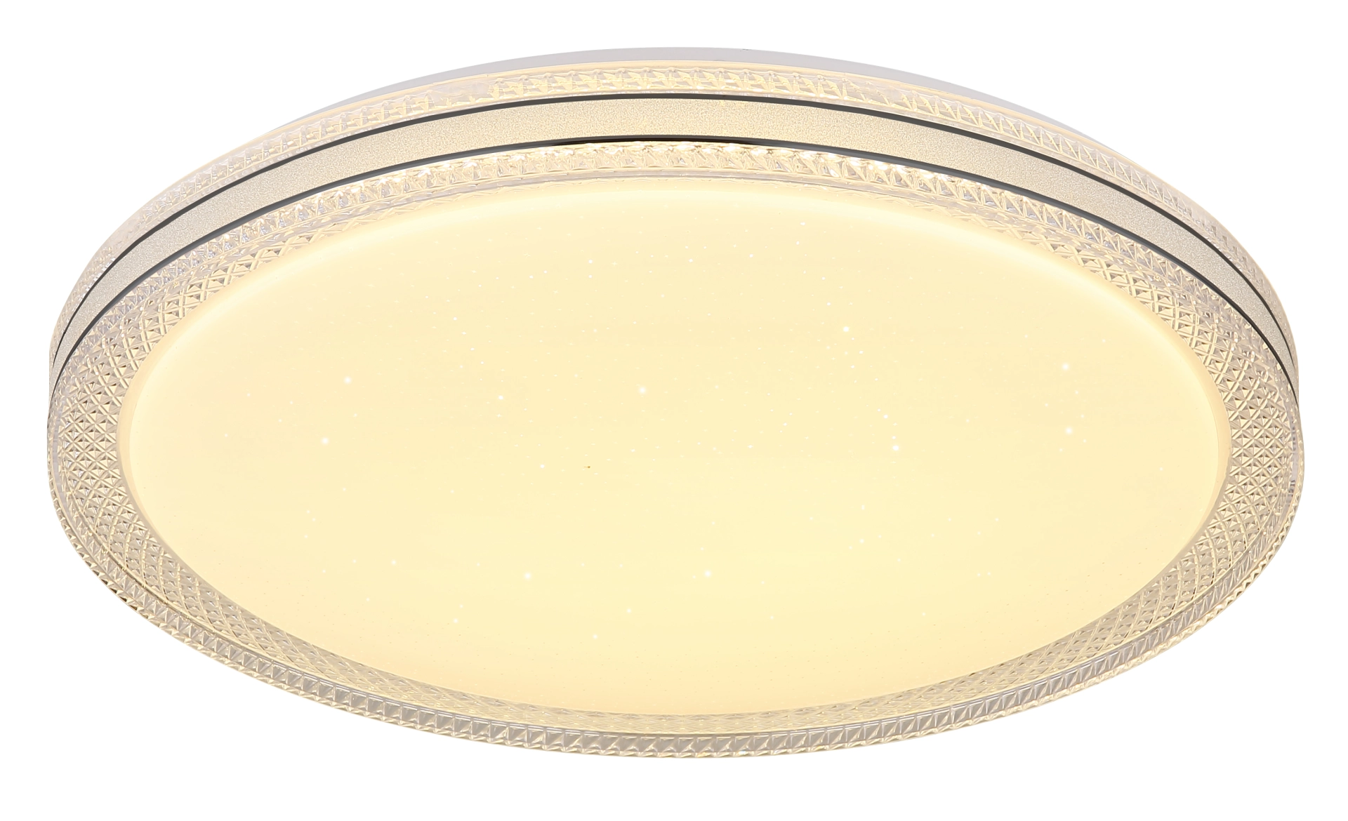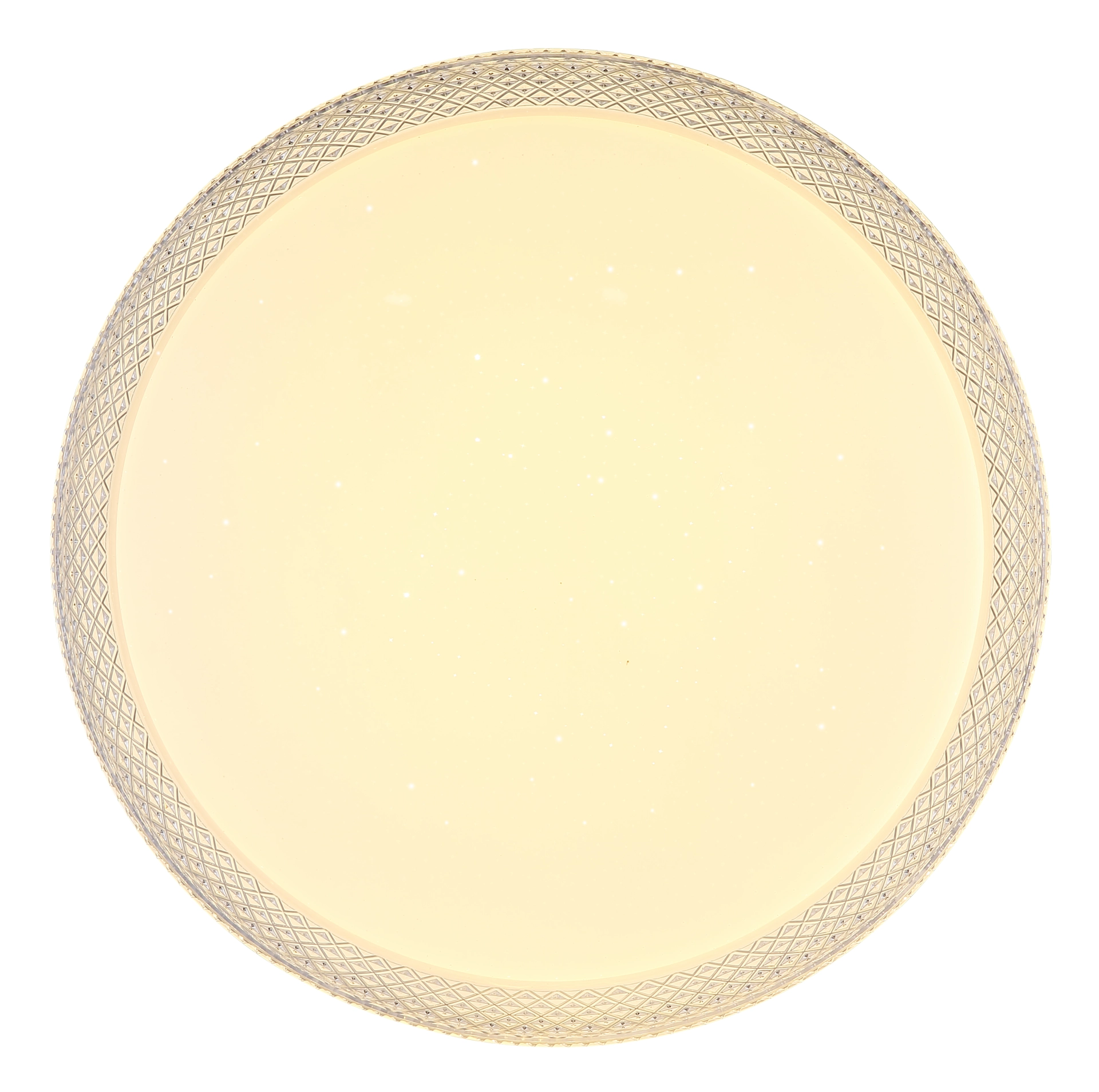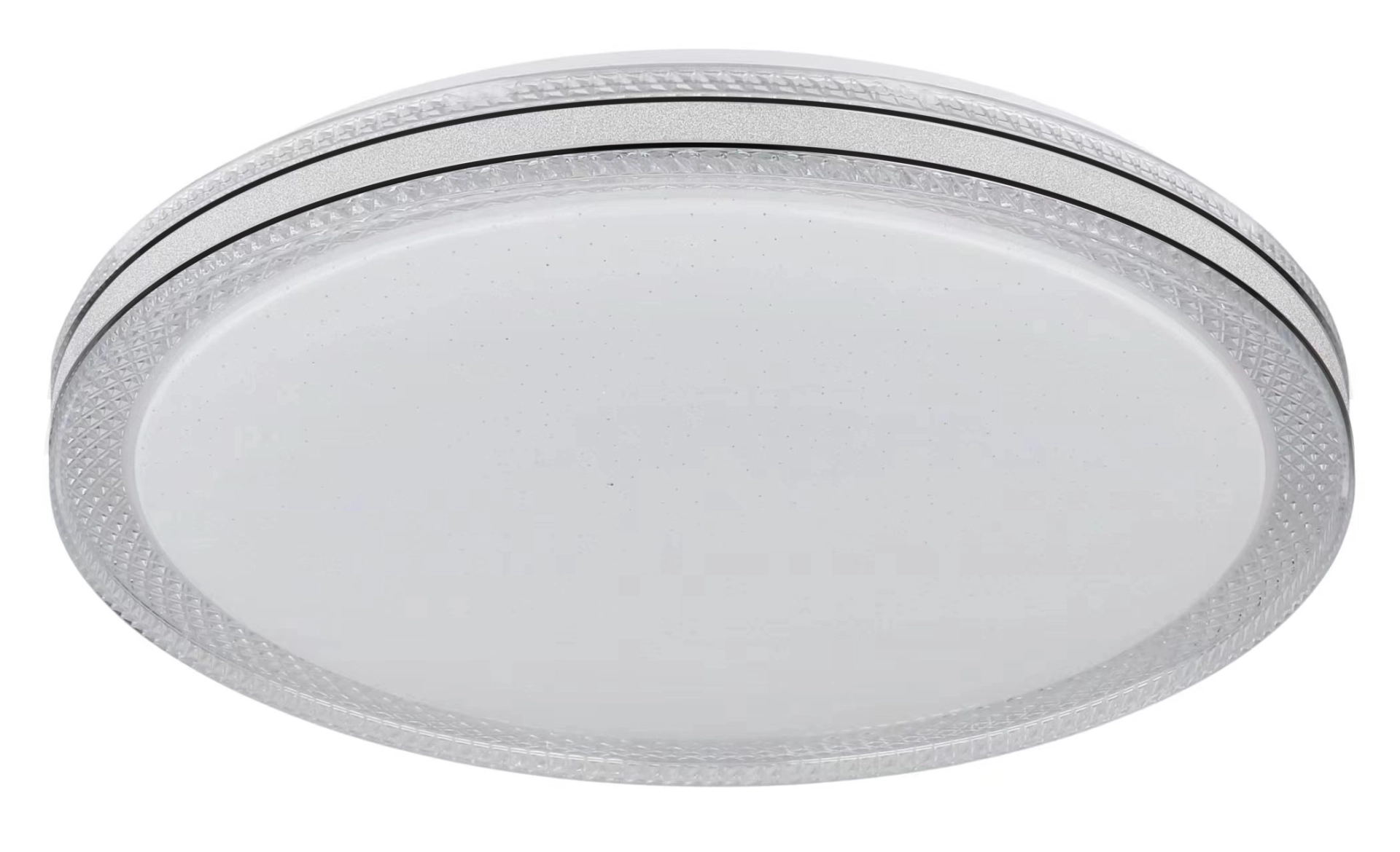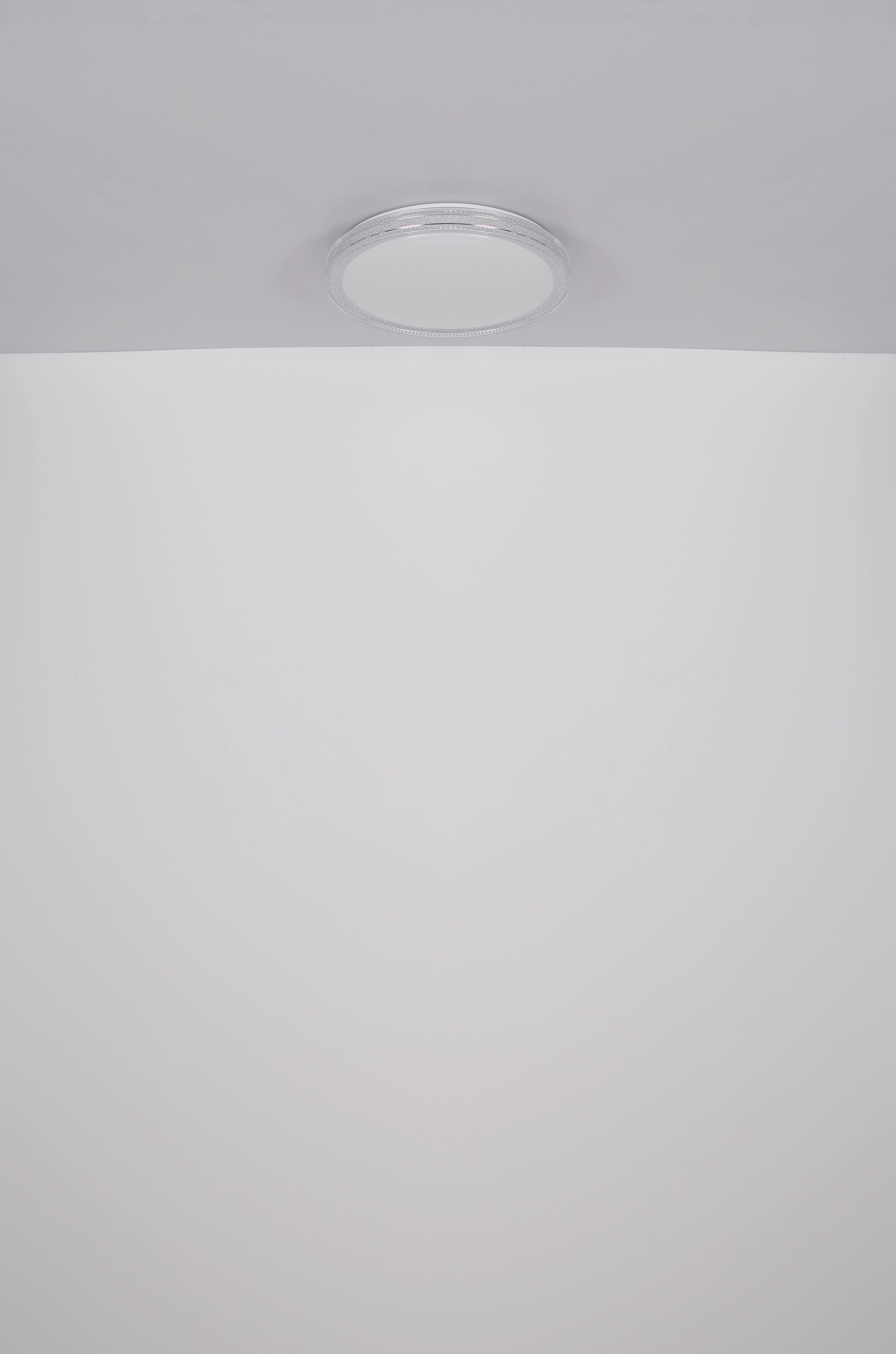 Die Deckenleuchte hat einen Durchmesser von 490 mm und eine Höhe von 70 mm. Sie besteht aus weißem Metall und opalem Acrylglas mit klaren Kunststoffkristallen. Die Deckenleuchte ist mit einem LED-Leuchtmittel mit einer Leistung von 24W und einer Spannung von 230V ausgestattet. Die Lichtquelle hat eine Helligkeit von 2500lm Source und eine Ausgangshelligkeit von 1800lm bei einer Farbtemperatur von 3000K. Die Deckenleuchte ist ein modernes und elegantes Beleuchtungselement, das sich perfekt für Wohnzimmer, Esszimmer oder Schlafzimmer eignet. Mit ihren klaren Kunststoffkristallen sorgt sie für eine angenehme Atmosphäre in jedem Raum.