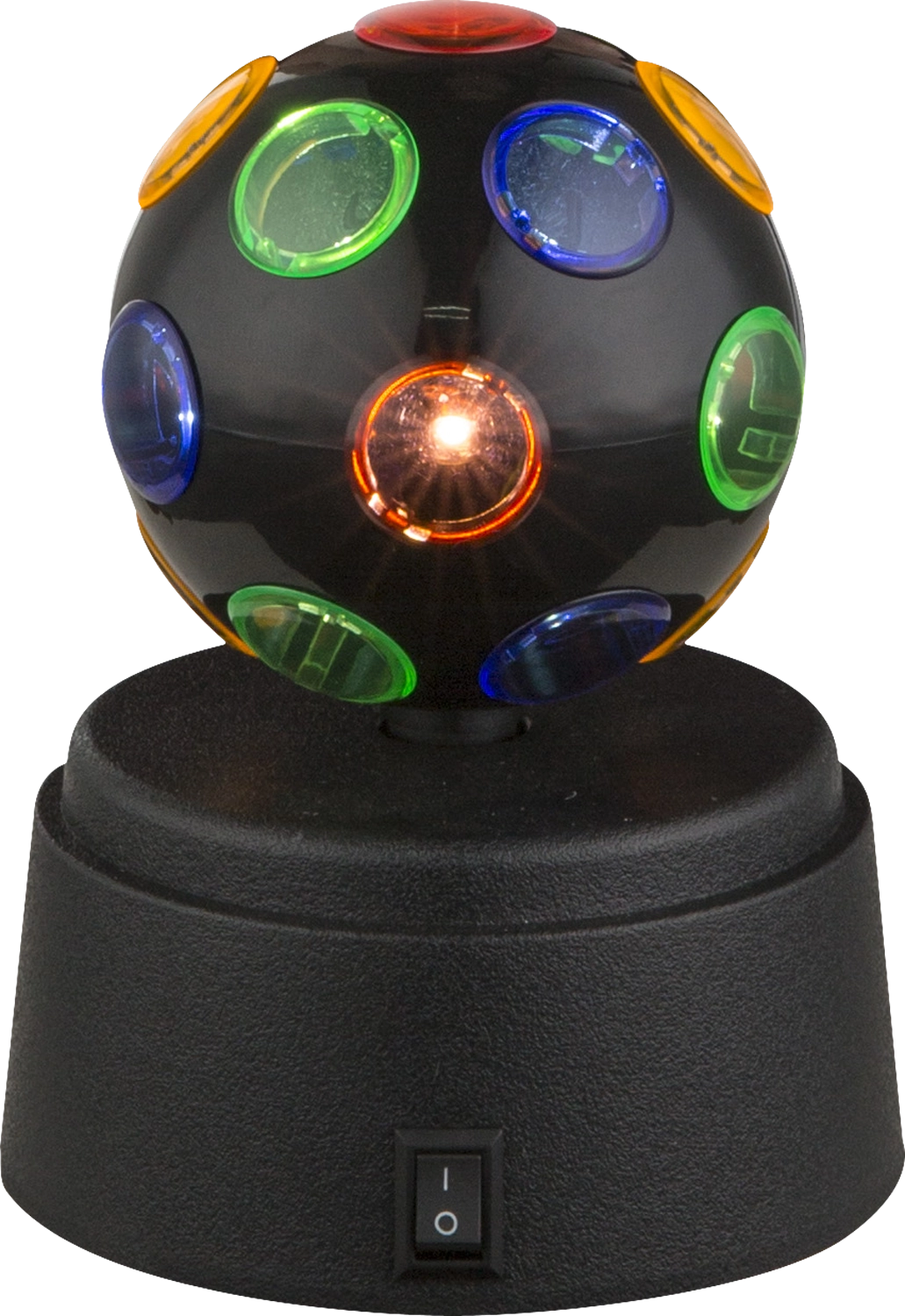 Diese Tischlampe aus schwarzen und bunten Kunststoff verwandelt jeden Tisch zu einem Hingucker. Wie eine Discokugel dreht sie sich im Kreis und erstrahlt so in vielen bunten Farben. Ein Schalter ermöglicht es die 12 cm große Lampe ein- und auszuschalten.