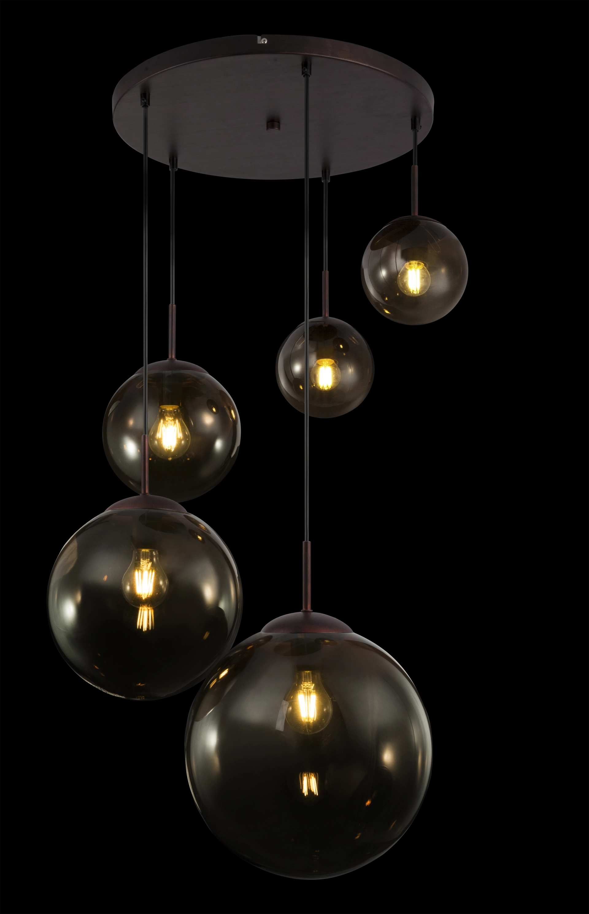 Diese futuristische Hängeleuchte besticht durch die faszinierende Anordnung ihrer fünf Leuchtelemente in unterschiedlichen Höhen und in verschiedenen Größen. Die Kombination aus braunem Metall und amberfarbenem Glas machen diese Leuchte zu einem einzigartigen Blickfang. Die Leuchte ist mit fünf E27 Fassungen (max.60W) ausgestattet. Wir empfehlen Ihnen, aufgrund ihrer Langlebigkeit und Stromersparnis, LED-Leuchtmittel zu nutzen. Mit weiteren Modellen dieser Serie können Sie das Bild in Ihren Räumen komplettieren.