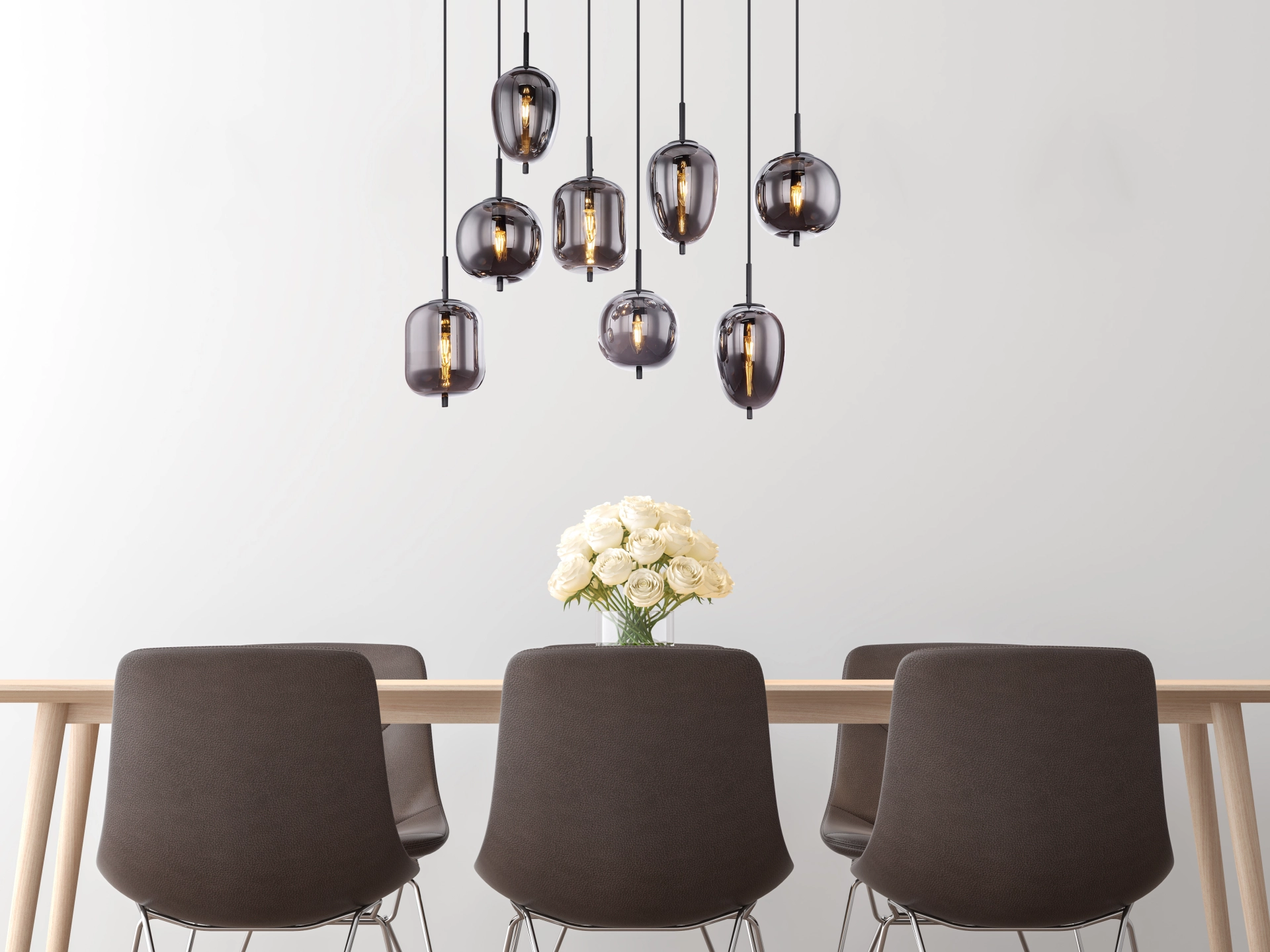 Diese Hängeleuchte BLACKY besteht aus schwarzem Metall mit rauchfärbigen Gläsern. Die acht hängenden Gläser sind in ihrer Aufmachung und Größe individuell. Diese 120cm in den Raum ragende, kunstvolle Lampe verfügt über acht E14 Fassungen(mit max. 40 Watt), die eine freie Leuchtmittelwahl ermöglichen. Aufgrund ihrer Langlebigkeit und Stromersparnis empfehlen wir LED Leuchtmittel. Diese Pendelleuchte eignet sich hervorragend für Ihren Wohn- und Essbereich.