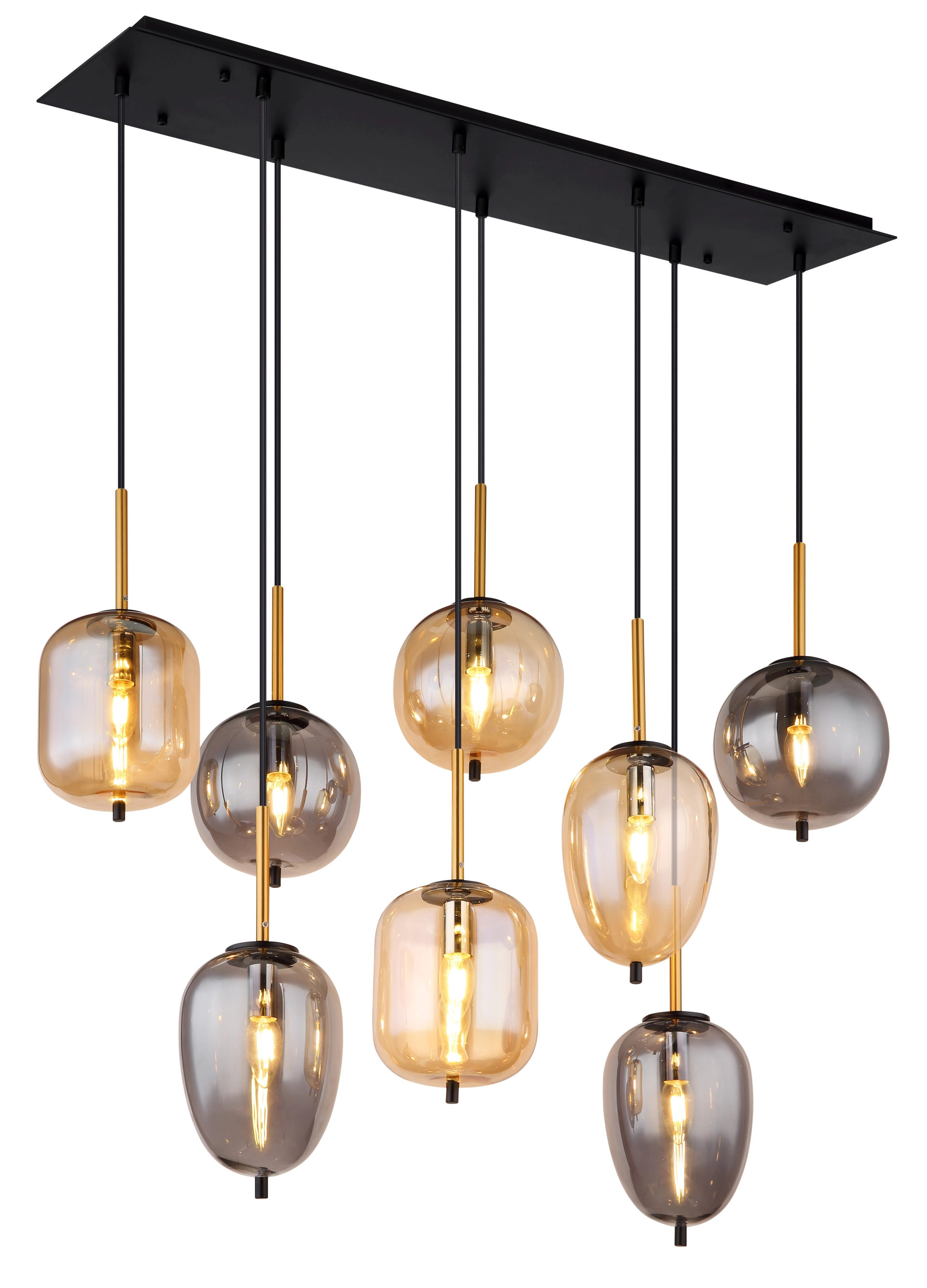 Diese wunderschöne Hängeleuchte der Serie BLACKY begeistert durch modernes Design. Die acht rauchfarbenen Glasschirme in unterschiedlichen Formen und Farben, mit jeweils einer E27 Fassung, hängen an einer schwarzen Deckenbefestigung (102x34cm) bis zu 1,2 m von der Decke. Die E27 Fassungen ermöglichen Ihnen bis zu einer maximalen Leistung von 40 Watt, selbst über Lichtfarbe und Helligkeit zu bestimmen.