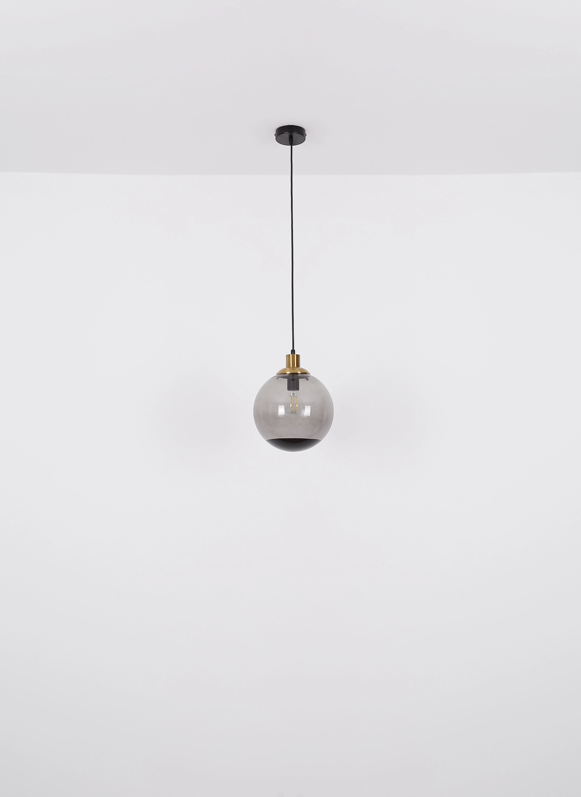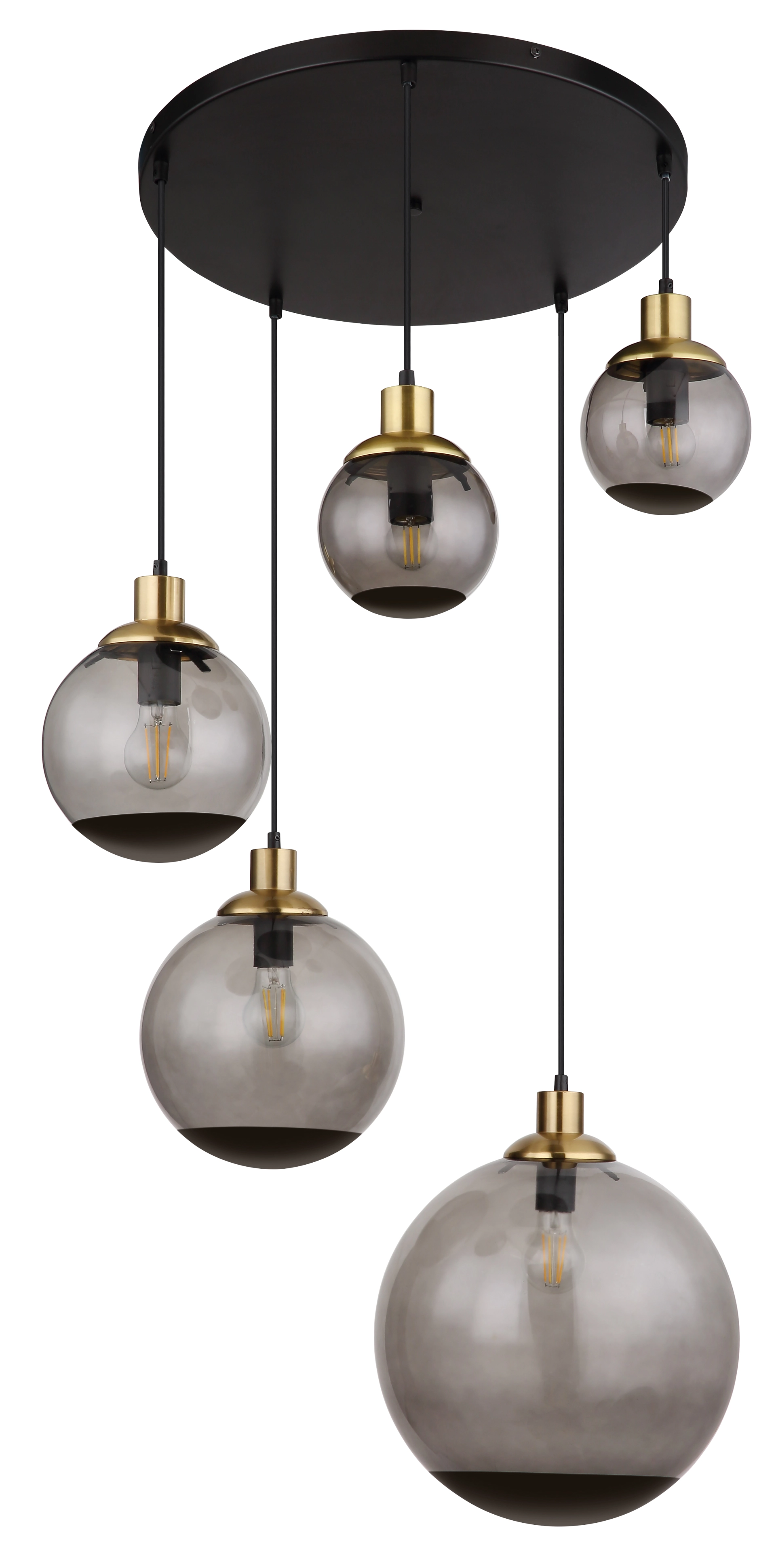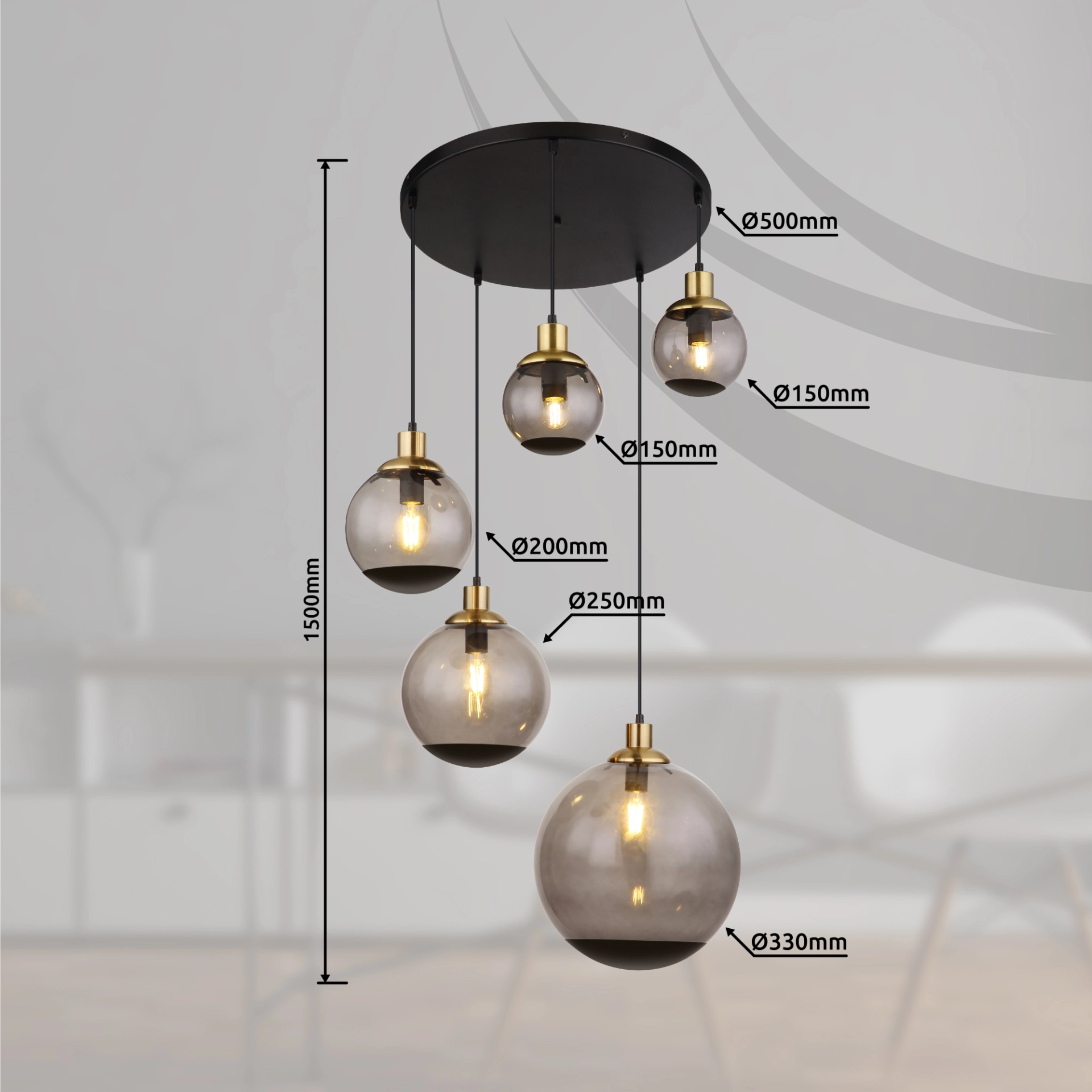 Diese elegante Hängeleuchte begeistert durch schönes Design. Aus einer runden Deckenbefestigung (Ø 50 cm) in Schwarz ragen fünf Kabel in unterschiedlichen Längen bis zu 1,5 m zu je einer E27 Fassung, welche mit rauchfarbenen Glasschirmen in verschiedenen Formen und Verzierungen in Schwarz, Messing ausgestattet sind. Die E27 Fassungen ermöglichen Ihnen bis zu einer maximalen Leistung von 40 Watt, selbst über Lichtfarbe und Helligkeit zu bestimmen. Aufgrund von Langlebigkeit und Stromersparnis empfehlen wir LED Leuchtmittel.