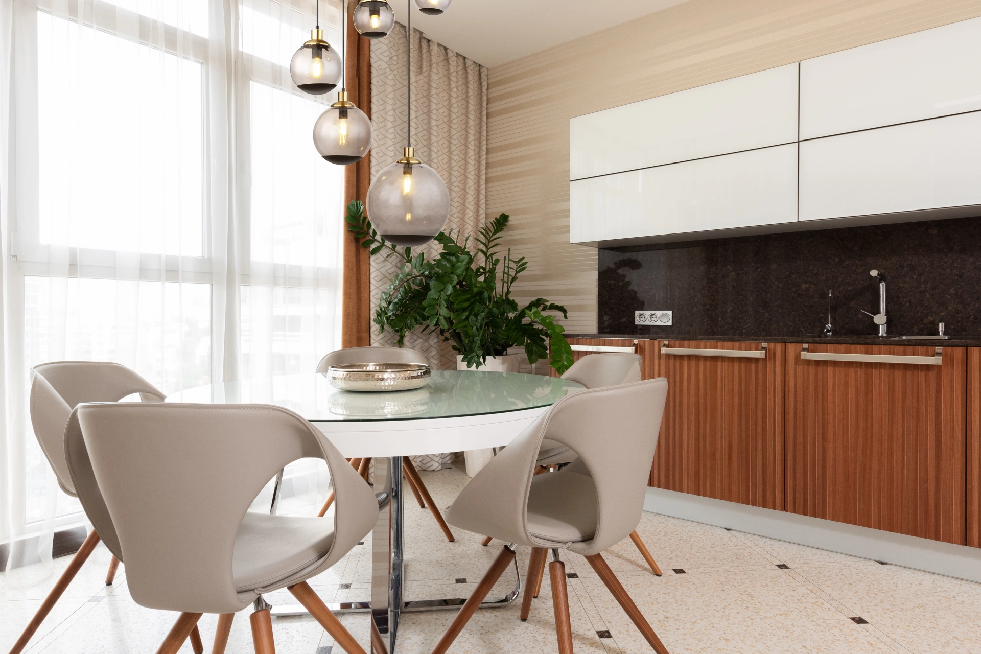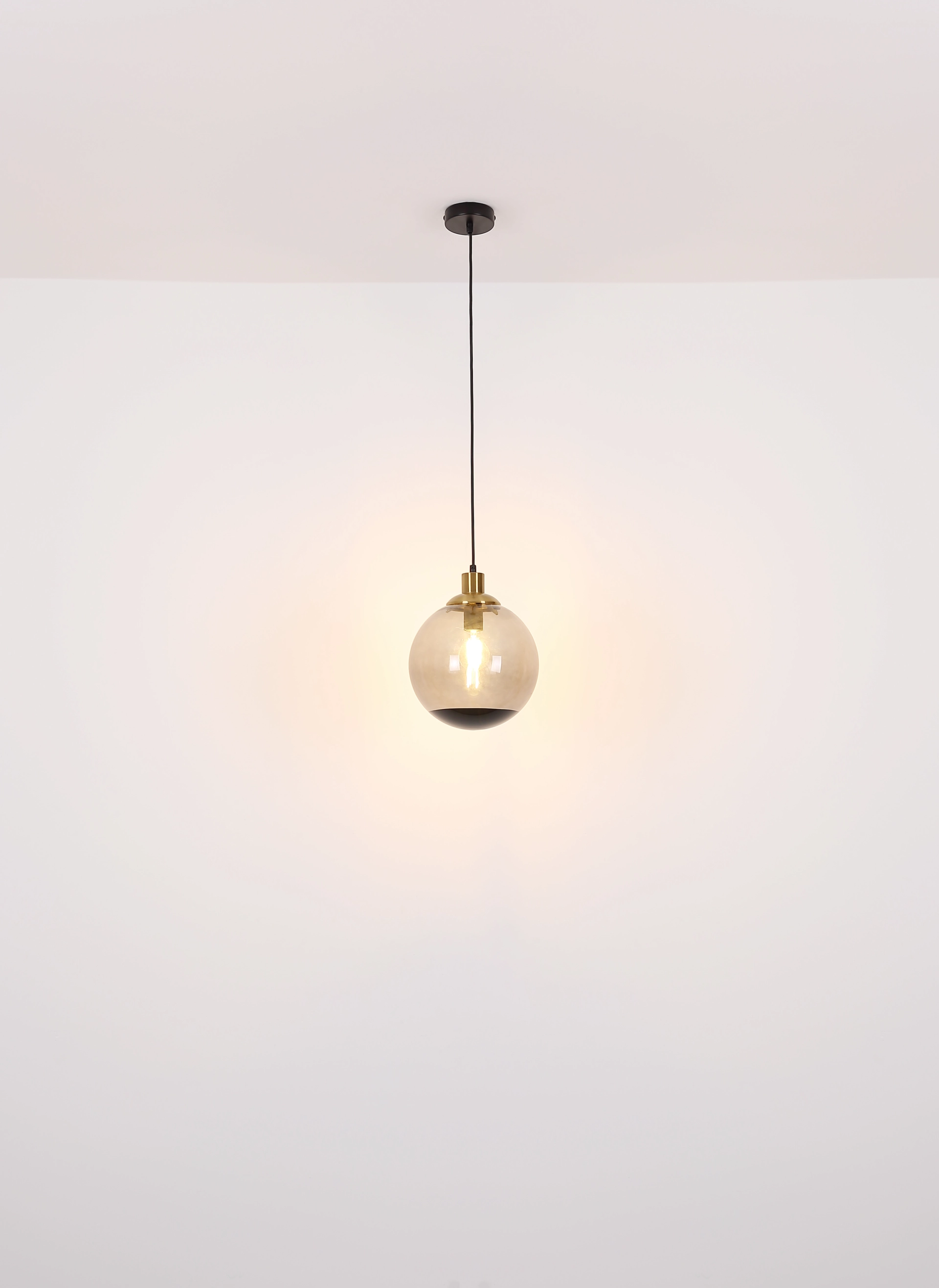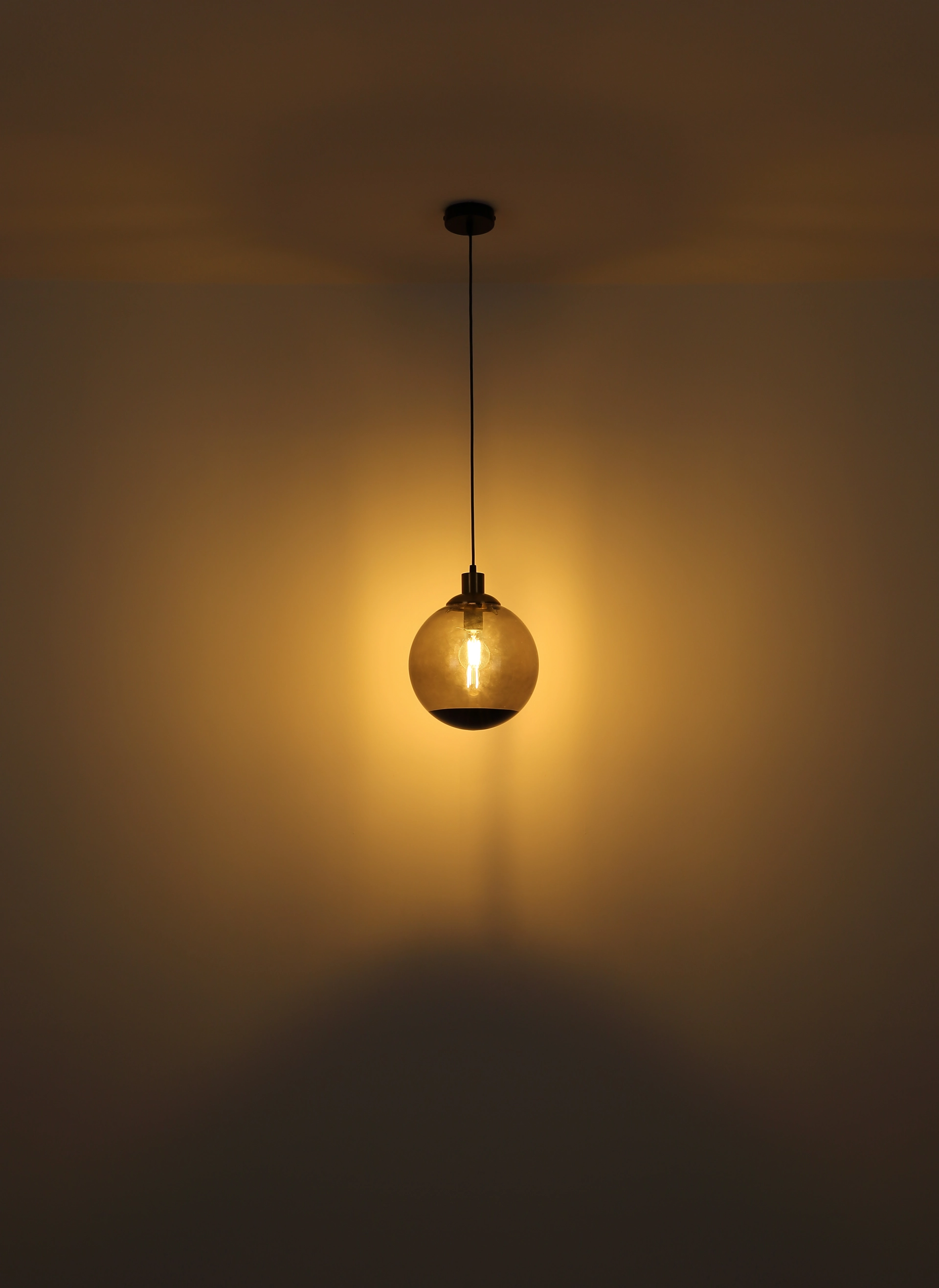 Diese elegante Hängeleuchte begeistert durch schönes Design. Aus einer runden Deckenbefestigung (Ø 50 cm) in Schwarz ragen fünf Kabel in unterschiedlichen Längen bis zu 1,5 m zu je einer E27 Fassung, welche mit rauchfarbenen Glasschirmen in verschiedenen Formen und Verzierungen in Schwarz, Messing ausgestattet sind. Die E27 Fassungen ermöglichen Ihnen bis zu einer maximalen Leistung von 40 Watt, selbst über Lichtfarbe und Helligkeit zu bestimmen. Aufgrund von Langlebigkeit und Stromersparnis empfehlen wir LED Leuchtmittel.