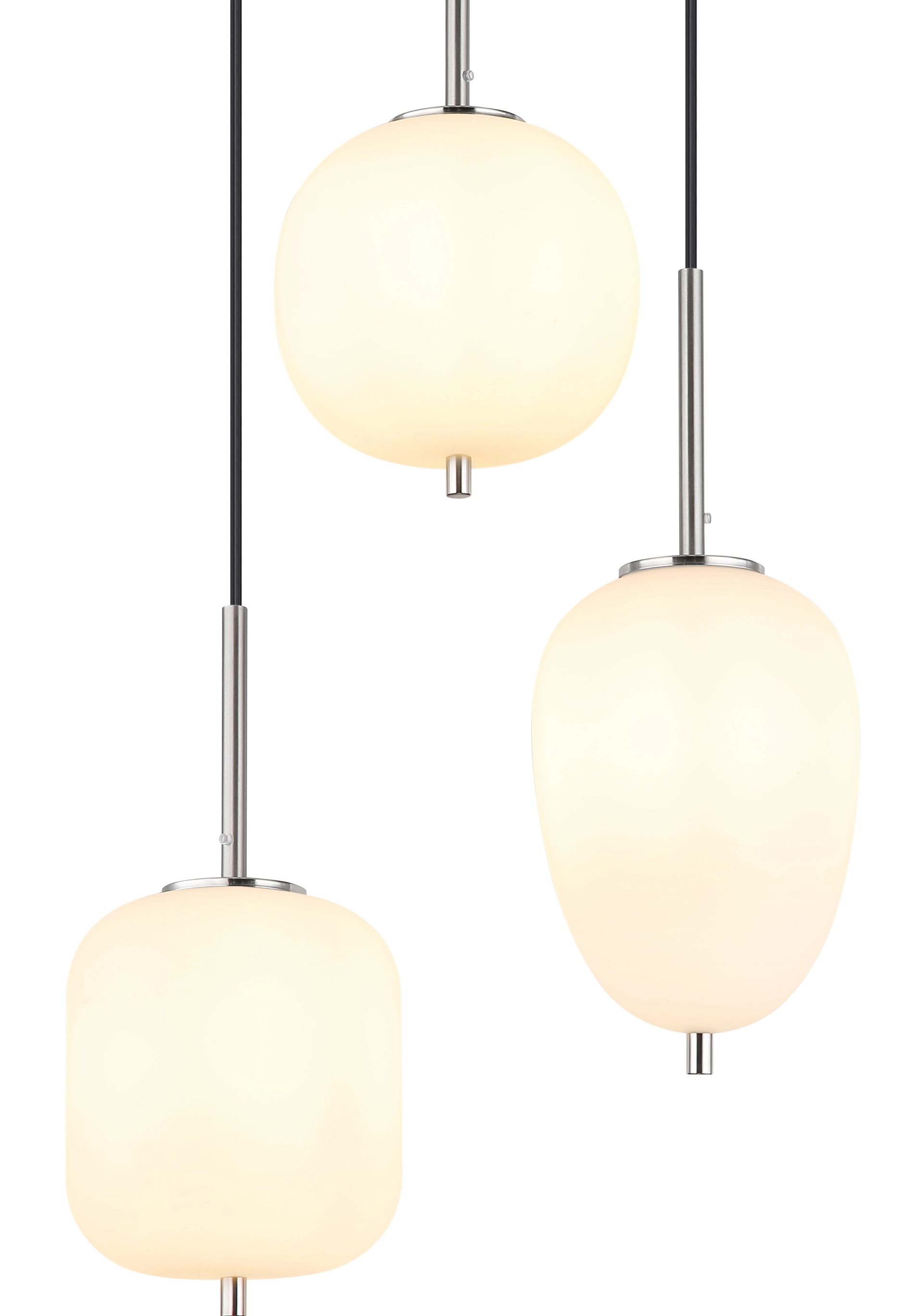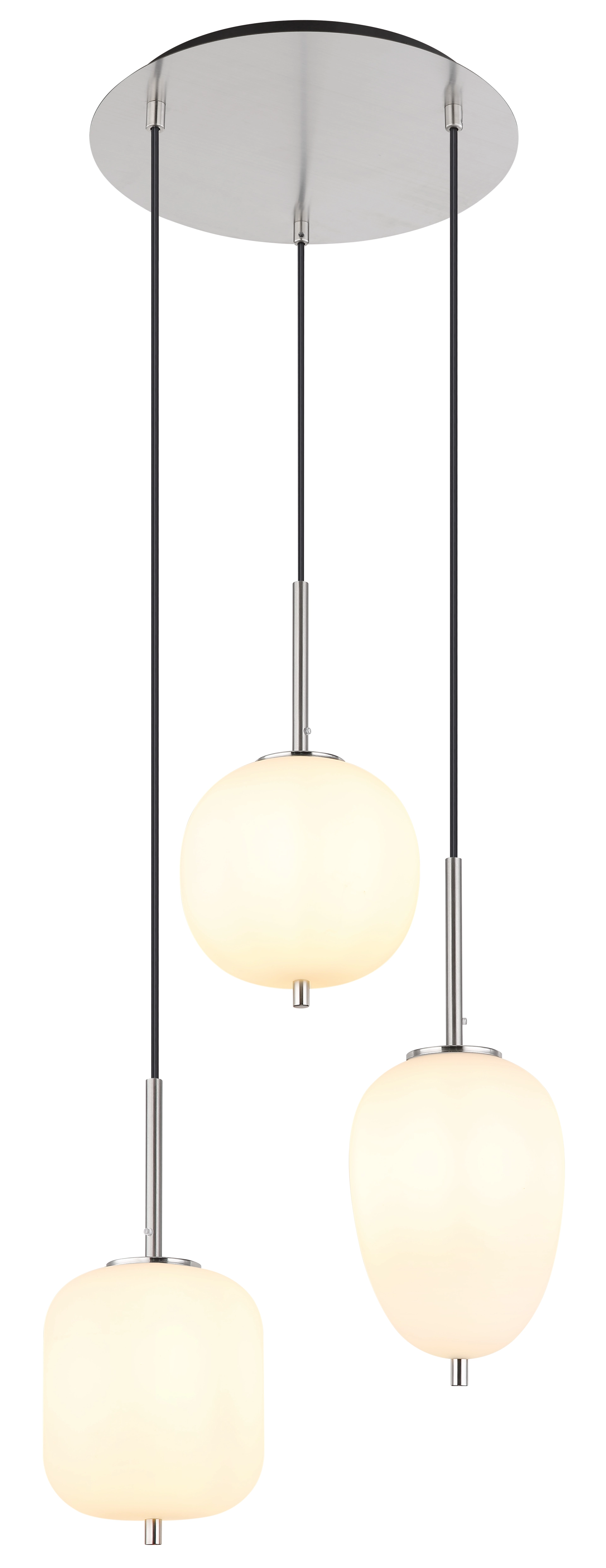 Diese Hängeleuchte BLACKY (Ø 46 cm) besteht aus nickelfarbenen Metall mit opalen Gläsern. Die drei hängenden Gläser sind in ihrer Aufmachung und Größe individuell. Diese 120cm in den Raum ragende, kunstvolle Lampe verfügt über drei E14 Fassungen (mit max. 40 Watt), die eine freie Leuchtmittelwahl ermöglichen. Aufgrund ihrer Langlebigkeit und Stromersparnis empfehlen wir LED Leuchtmittel. Diese Pendelleuchte eignet sich hervorragend für Ihren Wohn- und Essbereich.