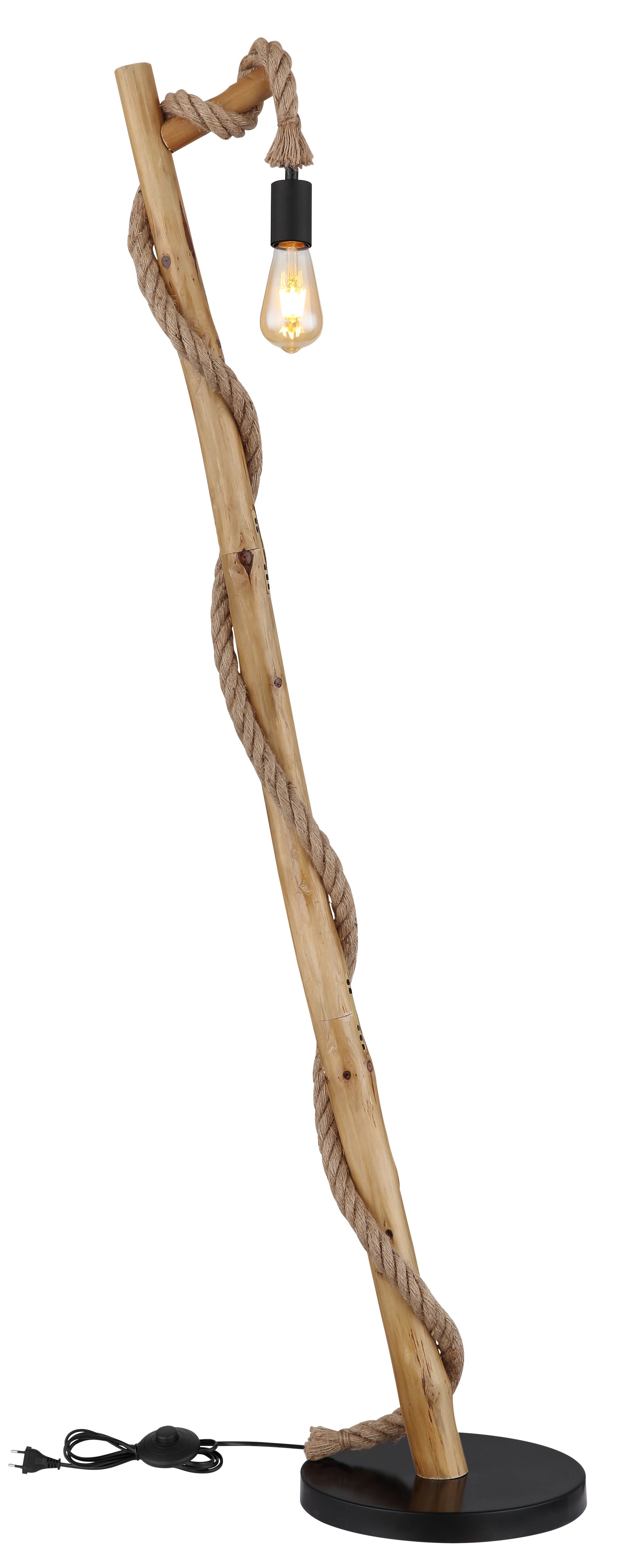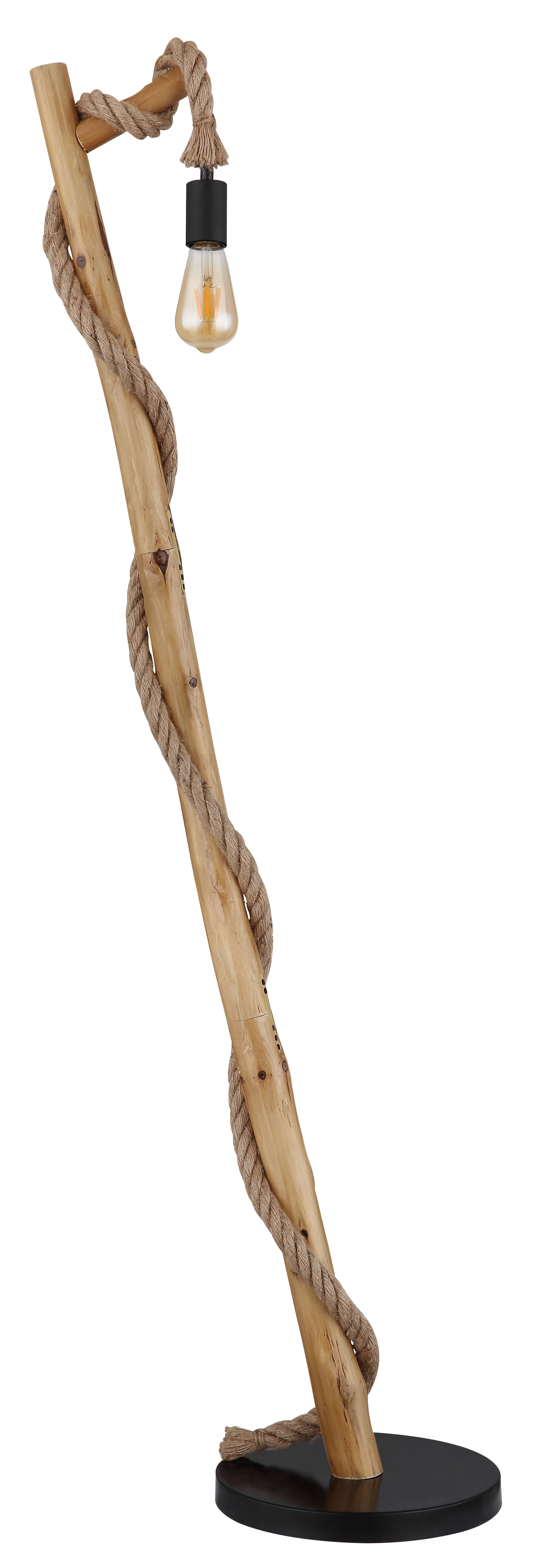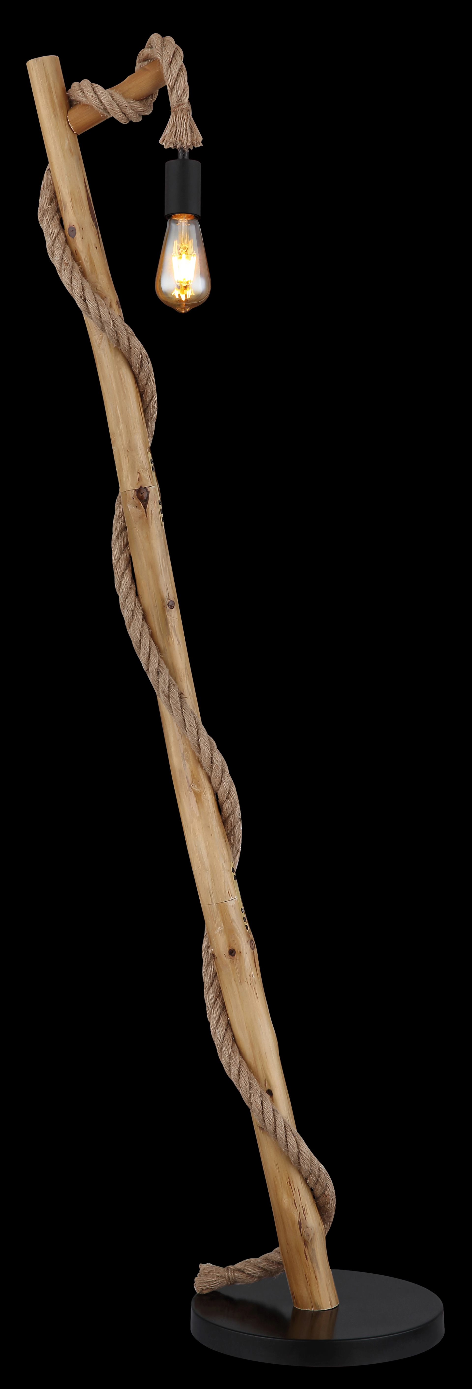 Diese schöne Stehleuchte begeistert durch tolles Design. Aus einem runden schwarzen Sockel ragt ein 1,5 m langer Holzstamm an dem sich ein aufgewickeltes Hanfseil mit einer E27 Fassung befinden. Diese überlässt Ihnen bis zu einer maximalen Leistung von 60 Watt, selbst über Lichtfarbe und Helligkeit zu bestimmen. Aufgrund von Langlebigkeit und Stromersparnis empfehlen wir LED Leuchtmittel.