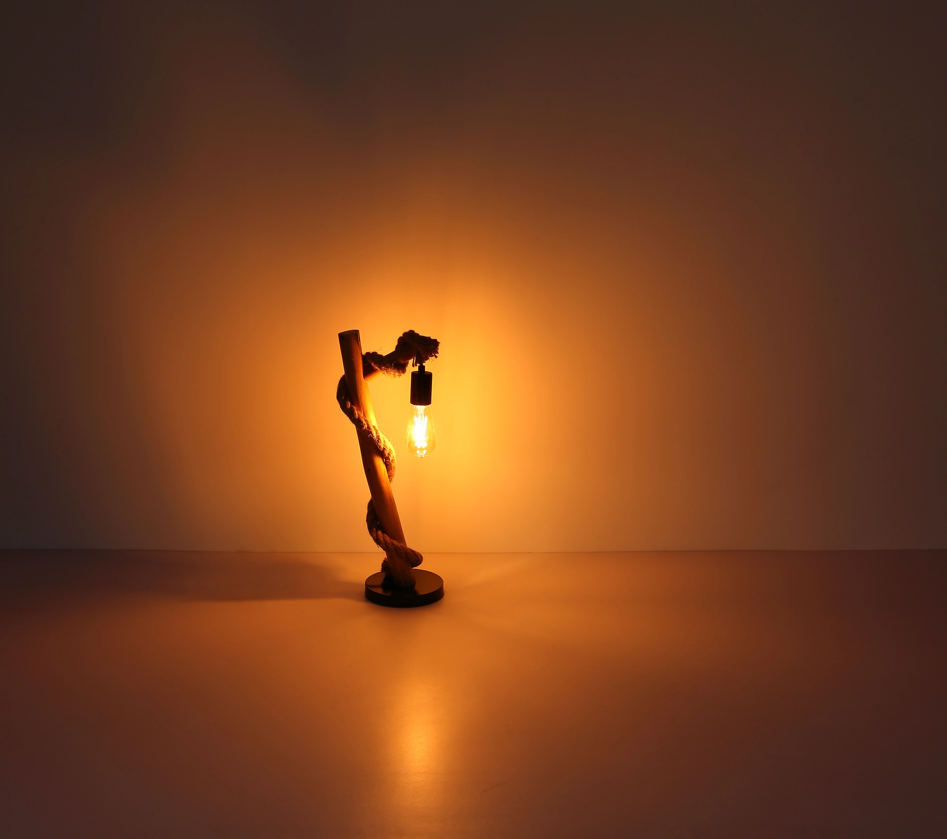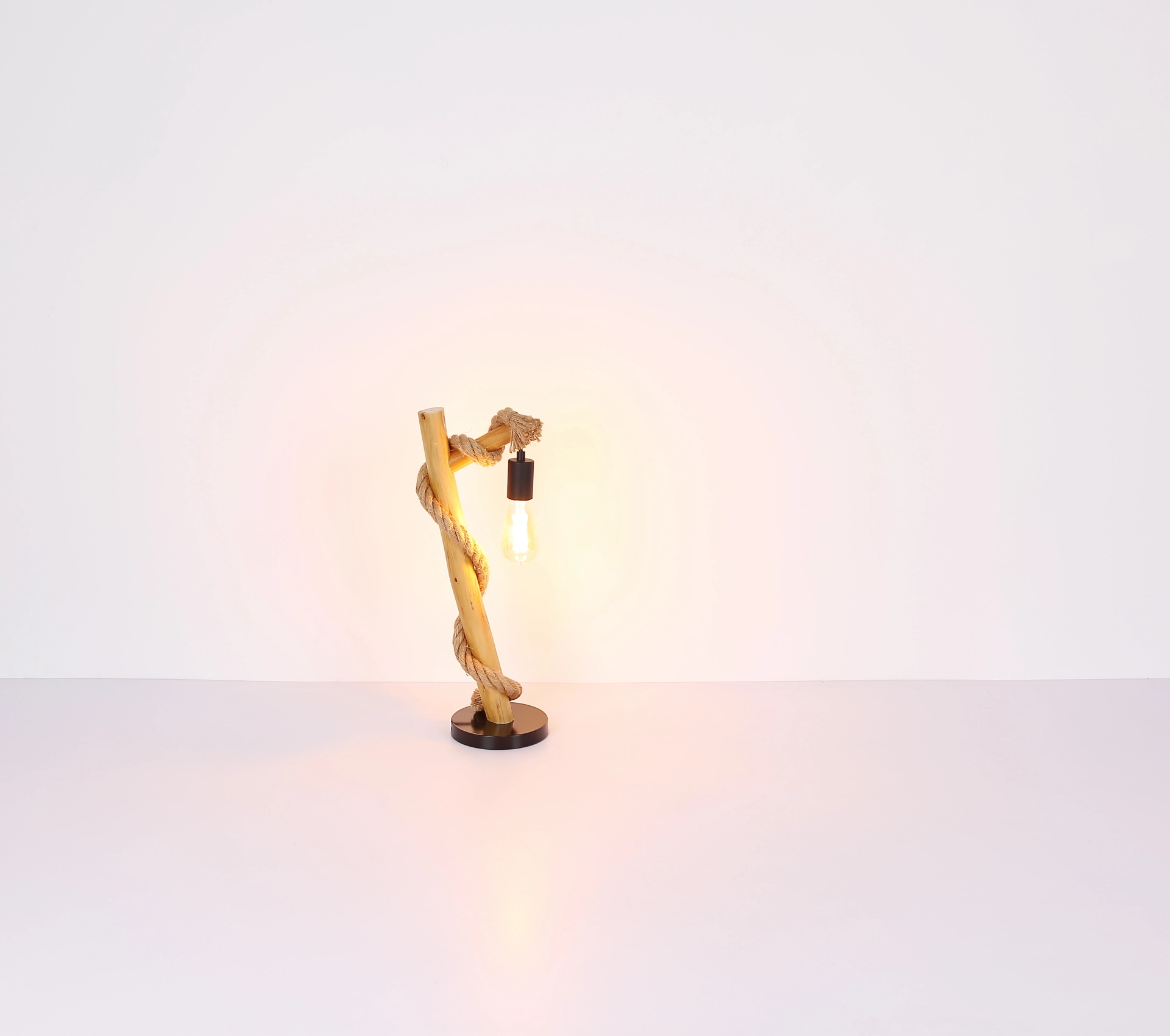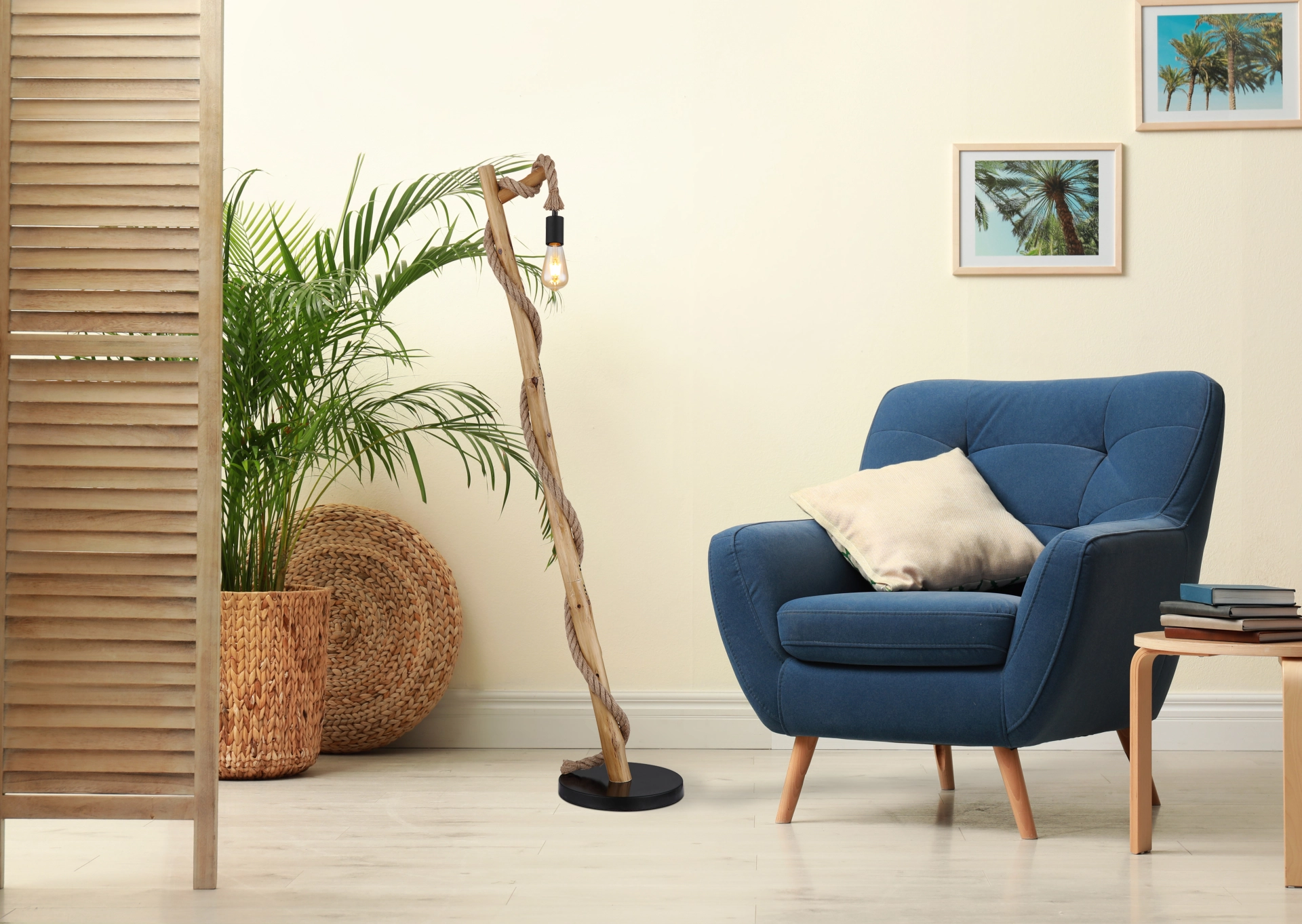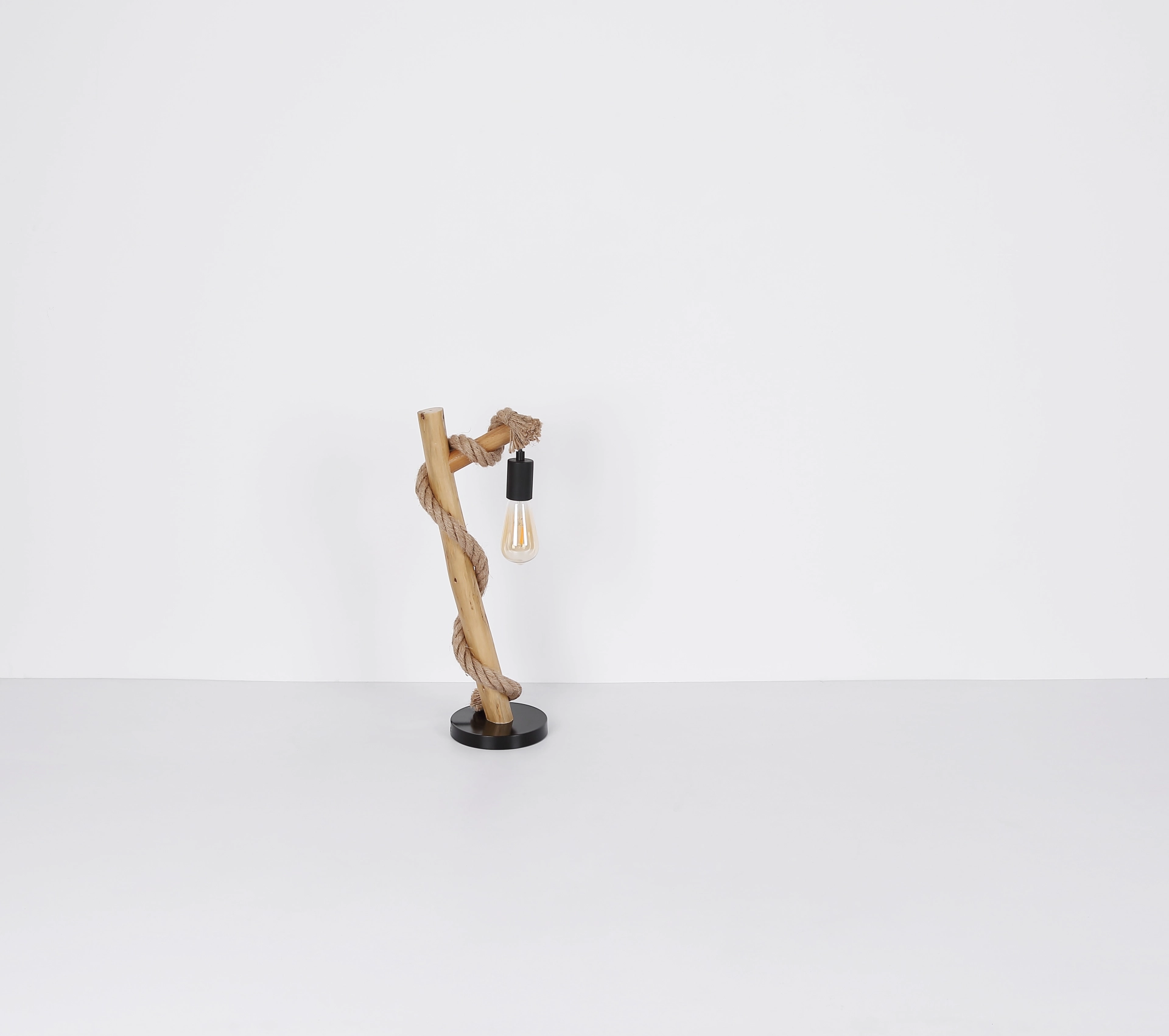 Diese schöne Stehleuchte begeistert durch tolles Design. Aus einem runden schwarzen Sockel ragt ein 1,5 m langer Holzstamm an dem sich ein aufgewickeltes Hanfseil mit einer E27 Fassung befinden. Diese überlässt Ihnen bis zu einer maximalen Leistung von 60 Watt, selbst über Lichtfarbe und Helligkeit zu bestimmen. Aufgrund von Langlebigkeit und Stromersparnis empfehlen wir LED Leuchtmittel.