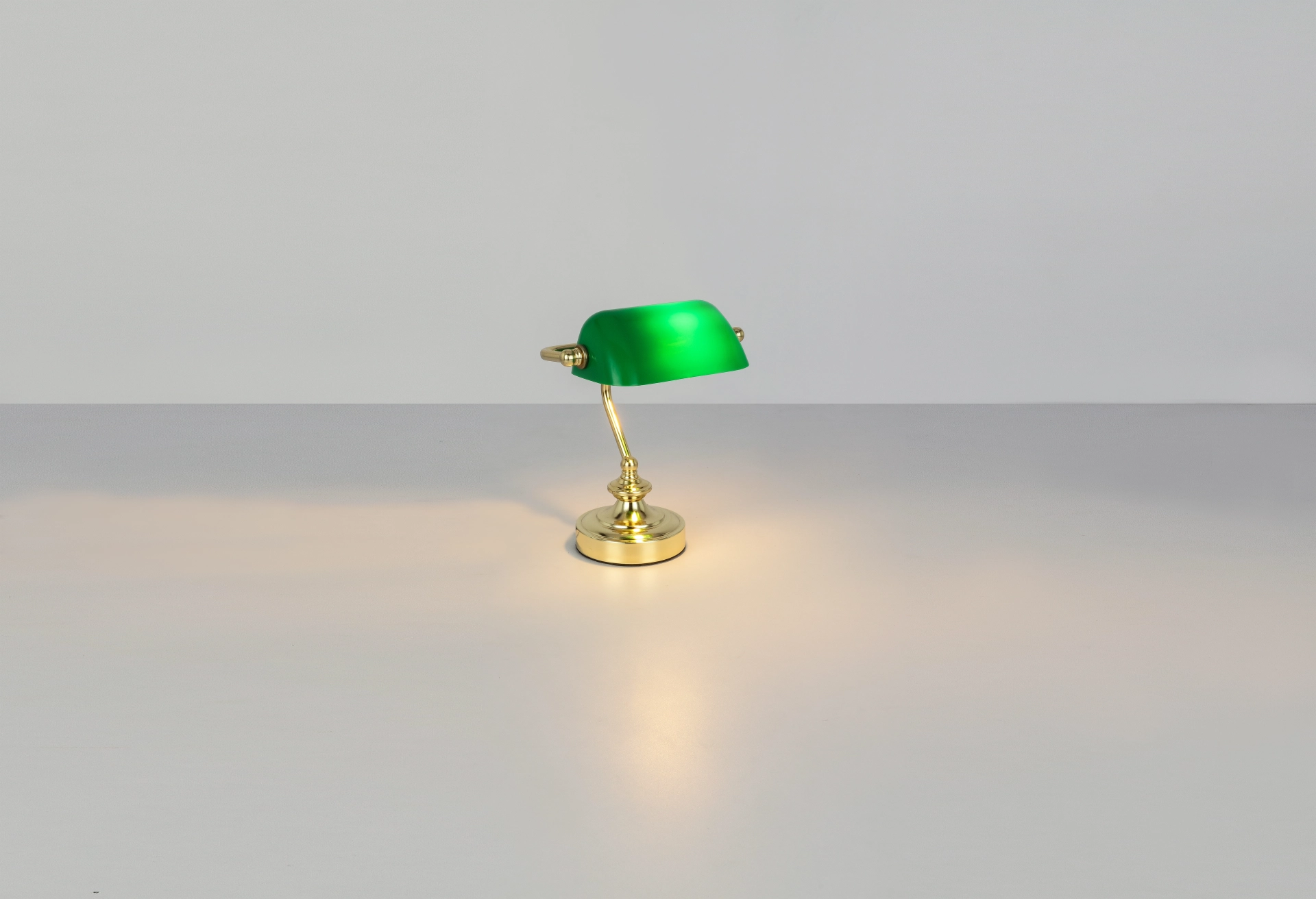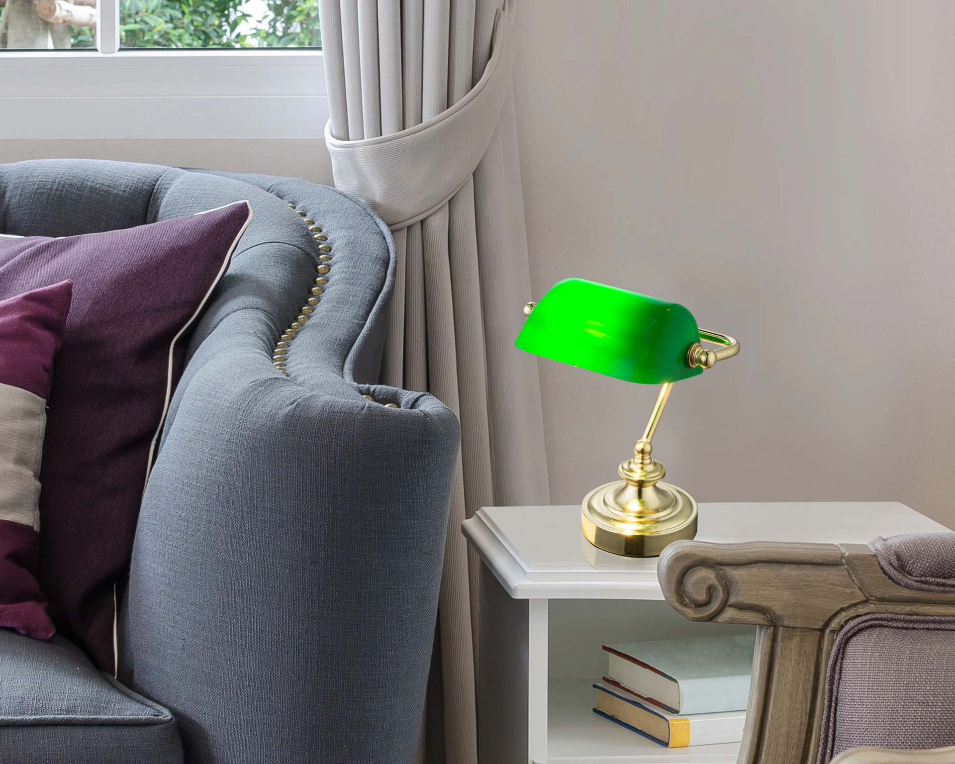 Diese klassische und im traditionellen Stil designte Tischlampe wird mit Sicherheit in Ihren Räumlichkeiten auffallen. Ob als reine „old style“ Schreibtischlampe oder als dekorative Bankerlampe, diese knapp 25 cm große Tischleuchte punktet immer durch ihren grünen aus Acryl gefertigten Lampenschirm und dem passenden messingfärbigen Lampenfuß. Sie verfügt über ein 1,5 Meter langes Anschlusskabel und einen Ein/Aus Schalter, was ihren Einsatzbereich flexibel gestaltet. Die zur Verfügung stehende E14 Fassung ermöglicht Ihnen die freie Auswahl des Leuchtmittels (max.25W).