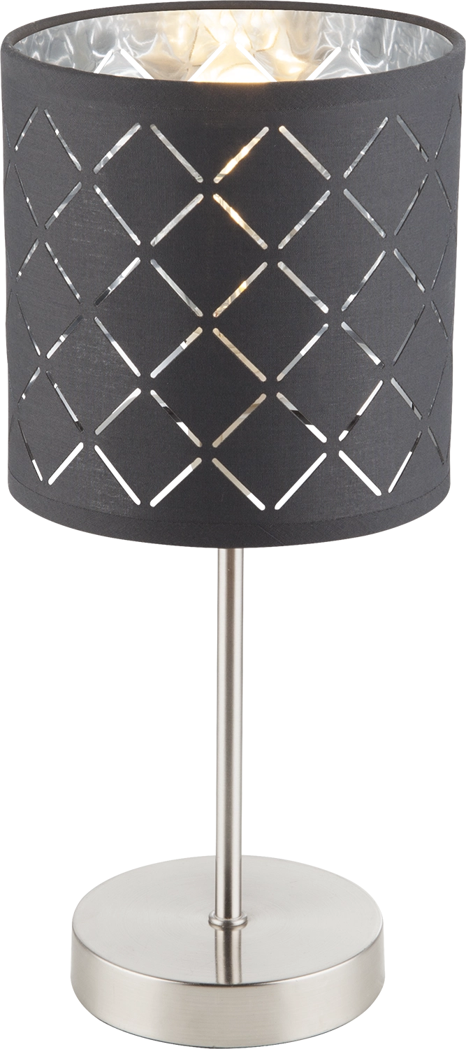 Mit dieser äußerst modernen dunkelgrauen Tischlampe aus der Serie Kidal werden leuchtende Akzente gesetzt. Vielseitig einsetzbar kann dieses Modell mit seinen Dekorstanzungen und der silber-metallic Farbe im inneren des textilbespannten runden Schirms zu einer behaglichen Umgebung beitragen. Diese Lampe verfügt über einen Durchmesser von 15 cm und wird durch einen On-Off-Schalter gesteuert. Die E14 Fassung ermöglicht Ihnen Ihr Leuchtmittel (max. 40W) frei zu wählen. Wir empfehlen Ihnen LED-Lampen aufgrund ihrer Stromersparnis und Langlebigkeit.