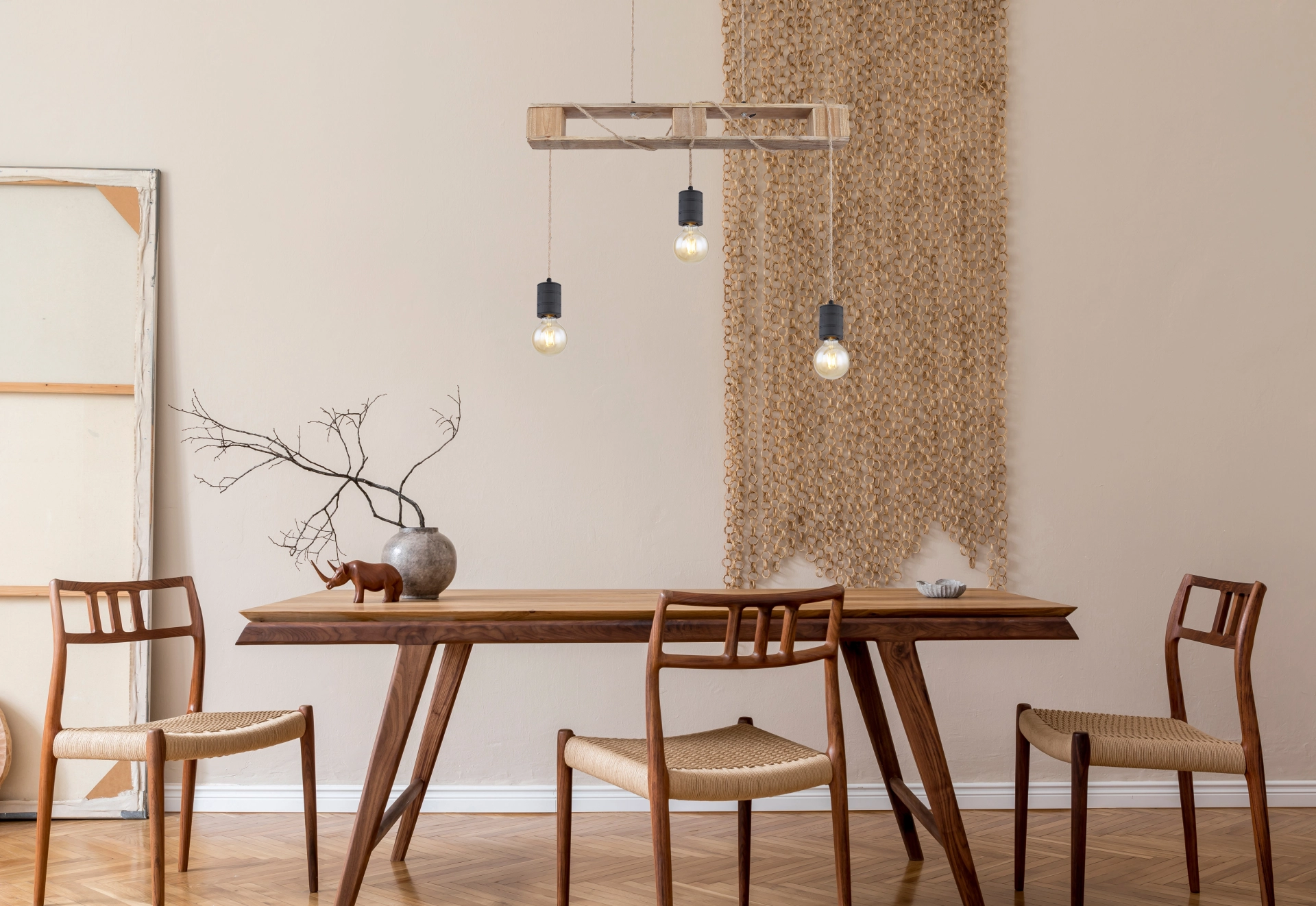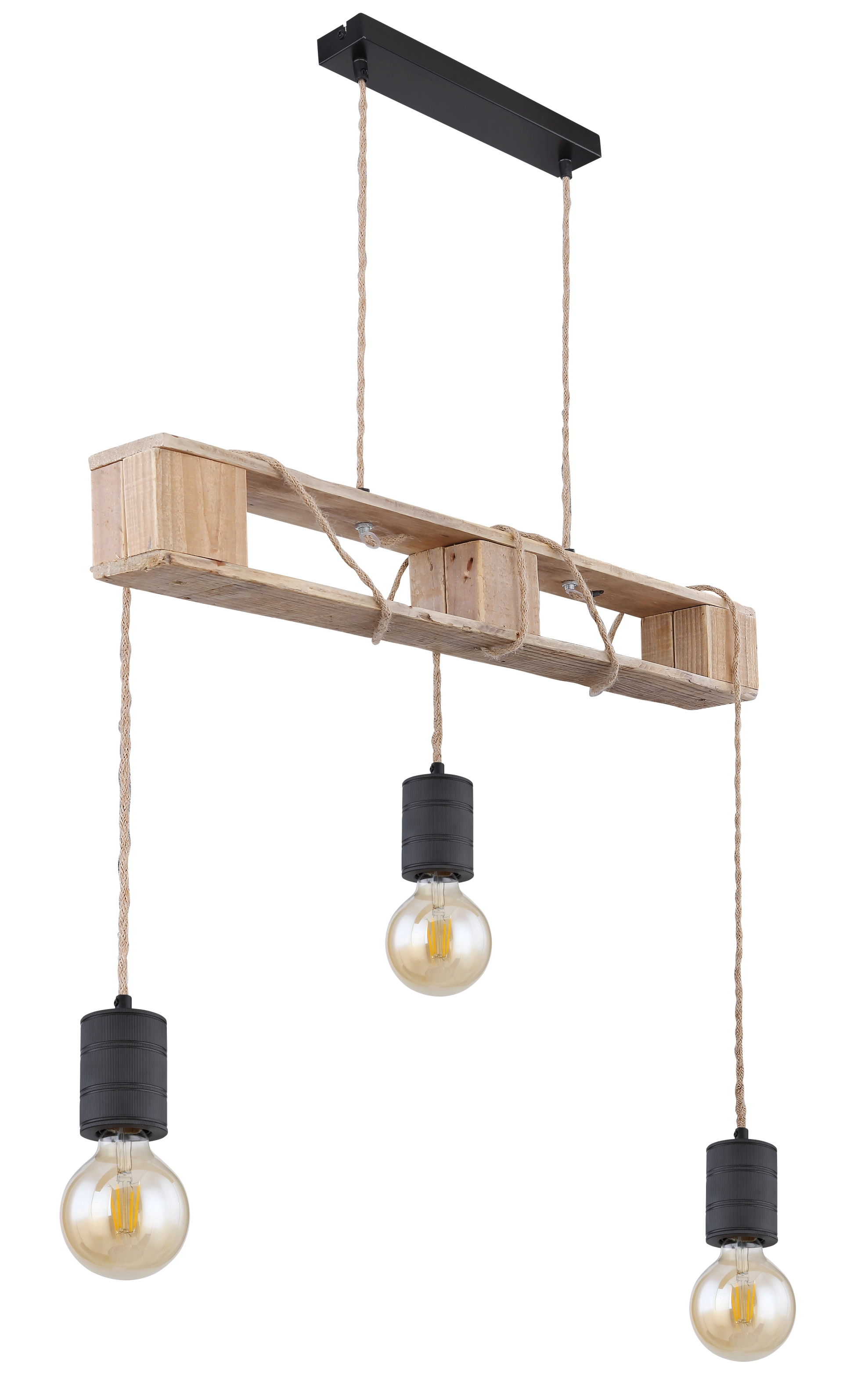 Diese Hängelampe der Joelle-Serie besticht durch ihr ausgefallenes Design aus einem Element einer Holzpalette und schwarz-mattem Metall. Die drei vom schwarz-matten Metall umrahmten E27-Fassungen hängen mit dem um das Holz gewickelten Hanfseil maximal 1,2 m weit von der Decke, wobei sie auch höhenverstellt werden können. Die Fassungen können Sie mit je einem passenden E27-Leuchtmittel Ihrer Wahl bestücken, wodurch Sie in der Lage sind, Lichtfarbe und Helligkeit nach Ihren Vorstellungen zu bestimmen. Mit der Hängeleuchte Joelle können Sie in Ihrem Innenbereich für ein stilvolles Ambiente sorgen.