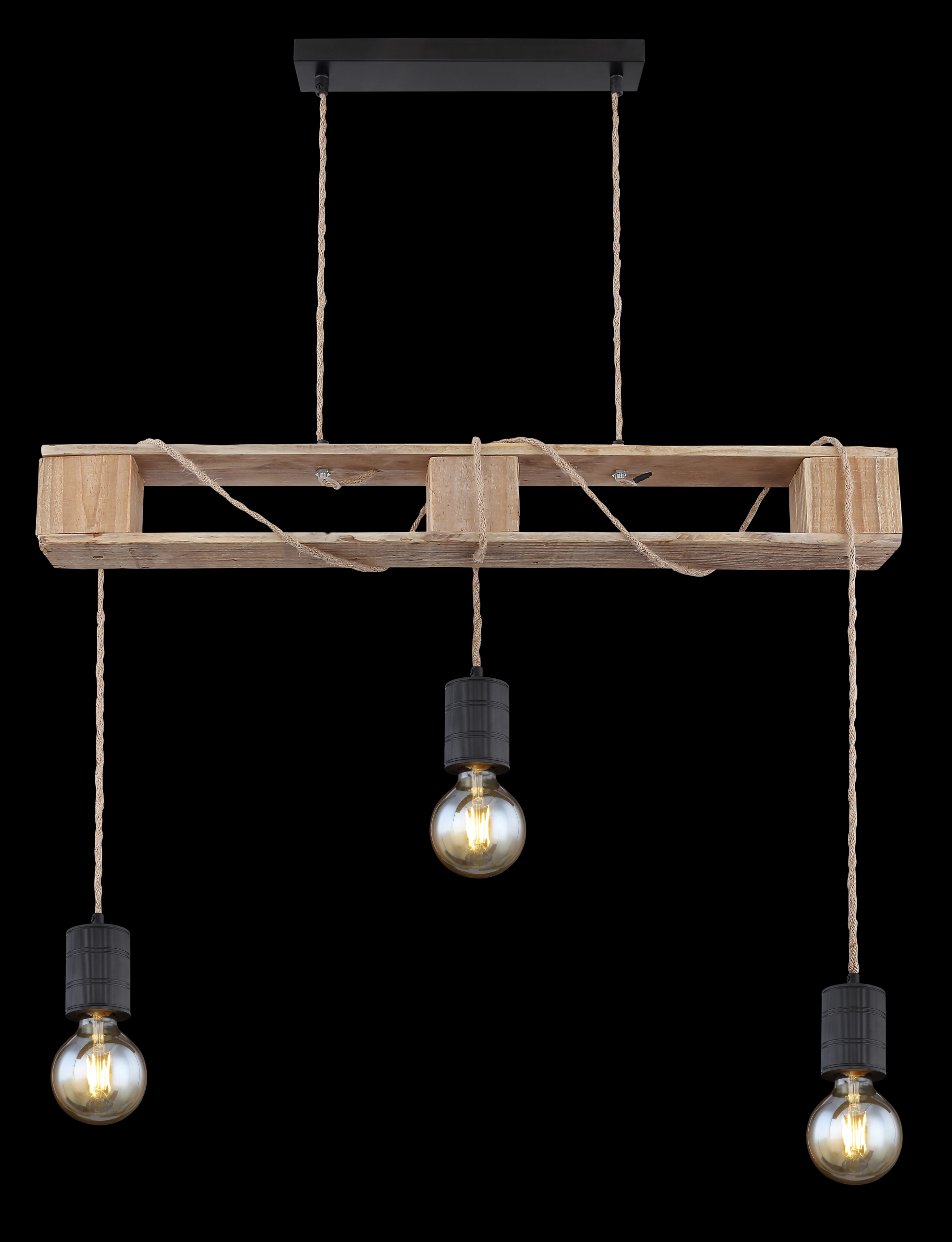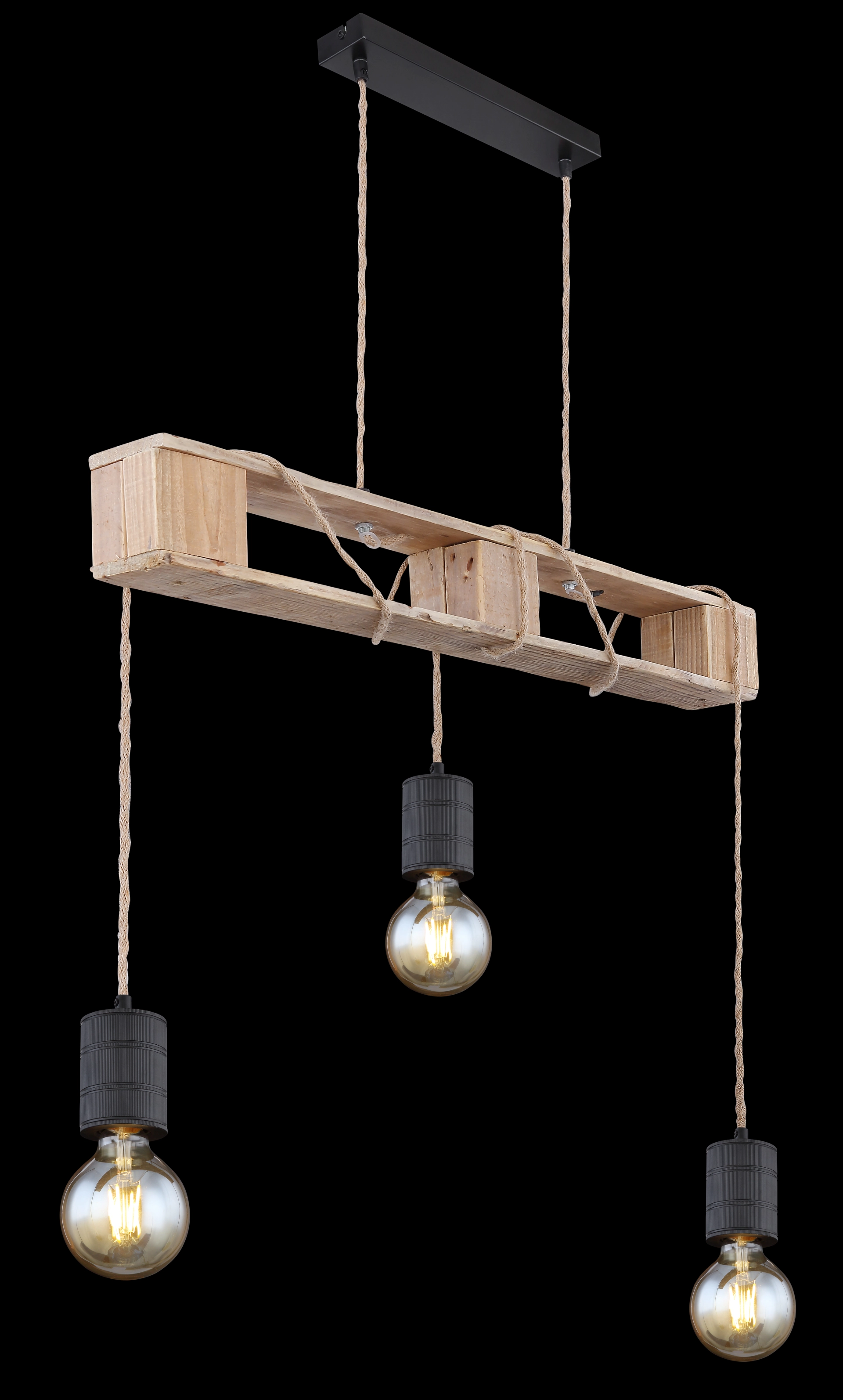 Diese Hängelampe der Joelle-Serie besticht durch ihr ausgefallenes Design aus einem Element einer Holzpalette und schwarz-mattem Metall. Die drei vom ... Mehr erfahren Mehr erfahren