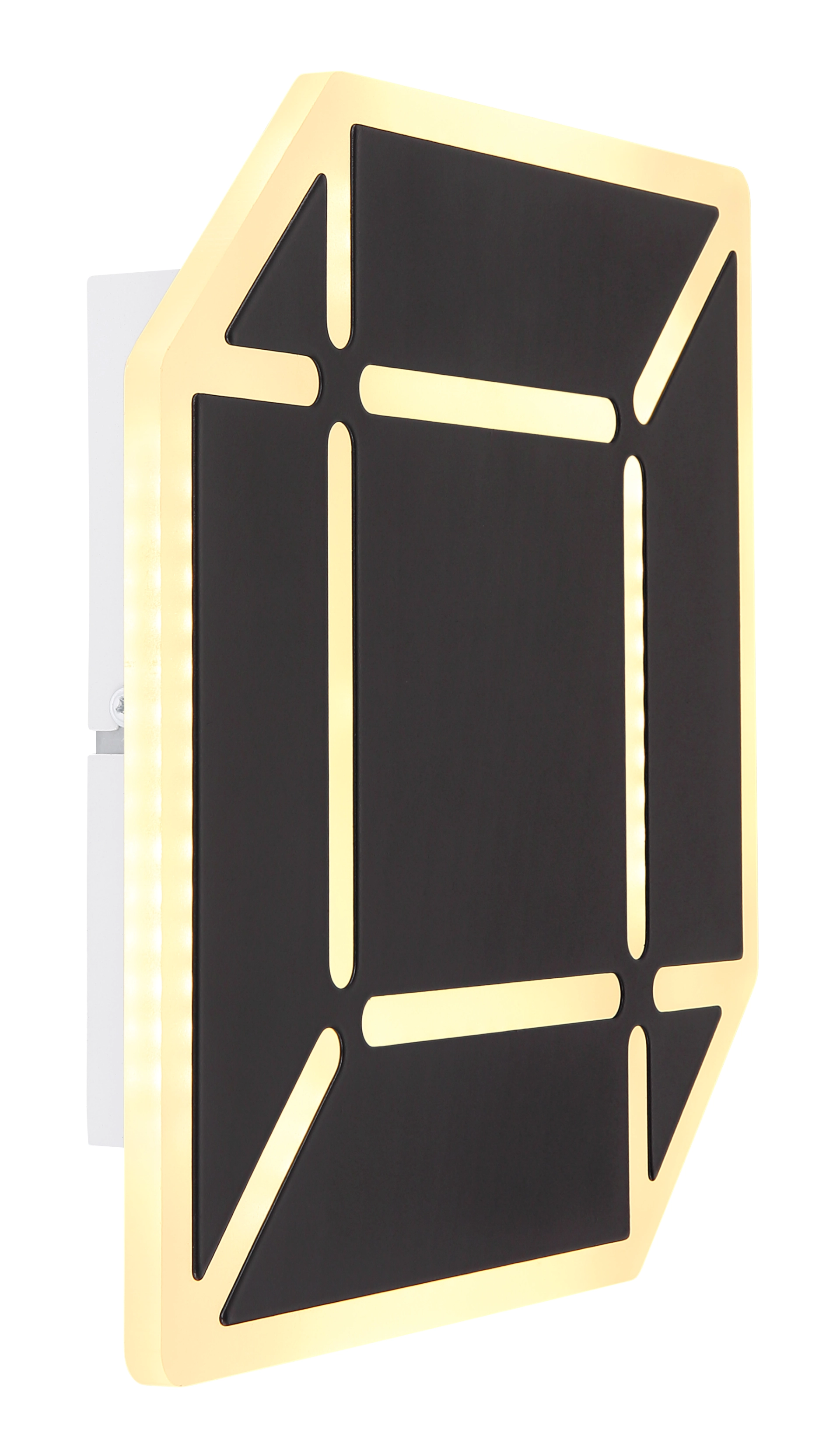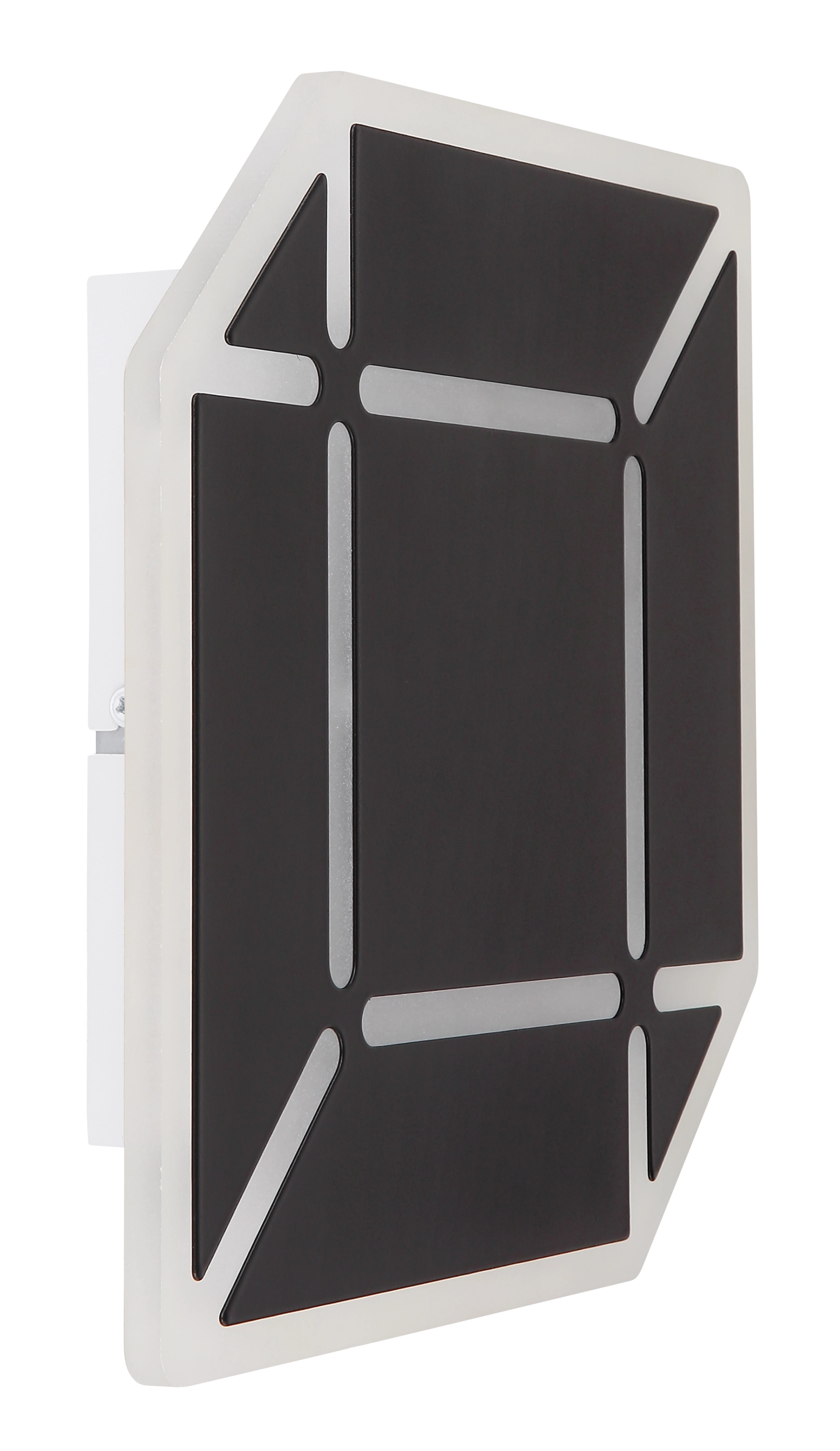 Diese Wandleuchte besteht aus schwarz matt lackiertem Metall und einem opalweißen Acrylglas. Die Maße der Leuchte betragen 250mm x 250mm bei einer Aufbauhöhe von 45mm. Die integrierte LED hat eine Leistung von 18 Watt und liefert eine Helligkeit von 1800 Lumen bei einer Farbtemperatur von 3000 warmweißen Kelvin.